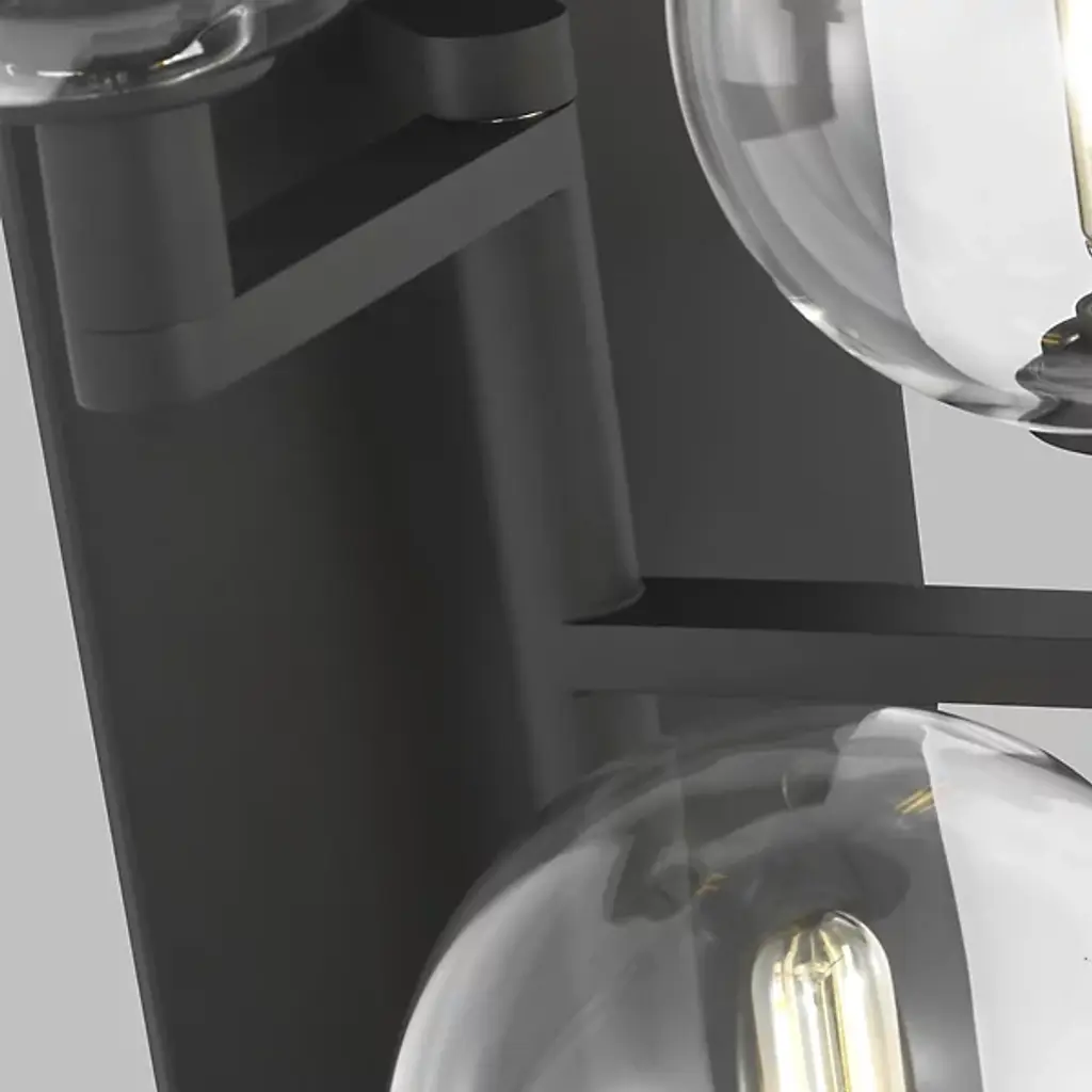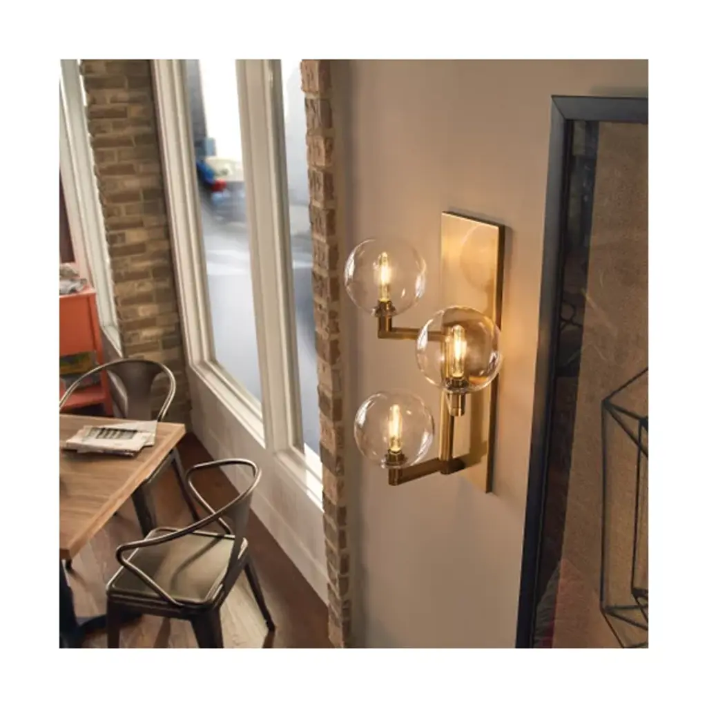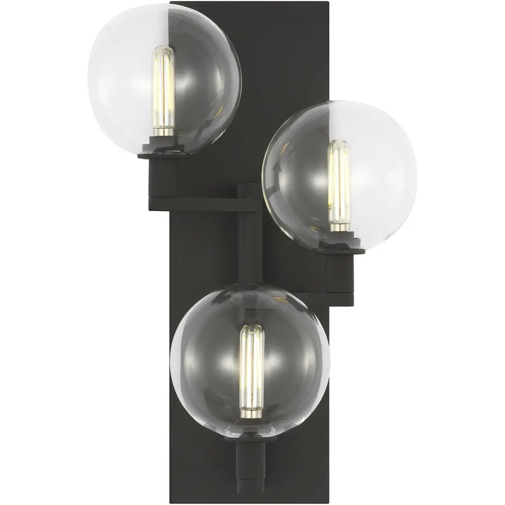 The Visual Comfort Modern, formerly known as Tech Lighting, Gambit Triple Wall Sconce has a warm contemporary style with a twist of retro. The high contrast in materials and tones elevates the piece, the transparent glass spheres showcasing the antique reproduction LED bulbs. The contrast in shapes also offers intriguing visual interest, the many right angles in the metalwork balanced with three perfect spheres of borosilicate glass.