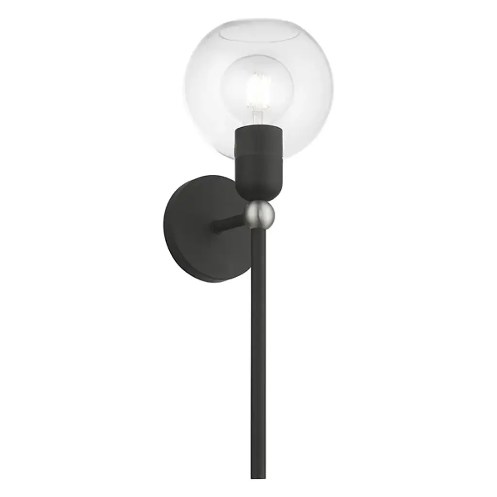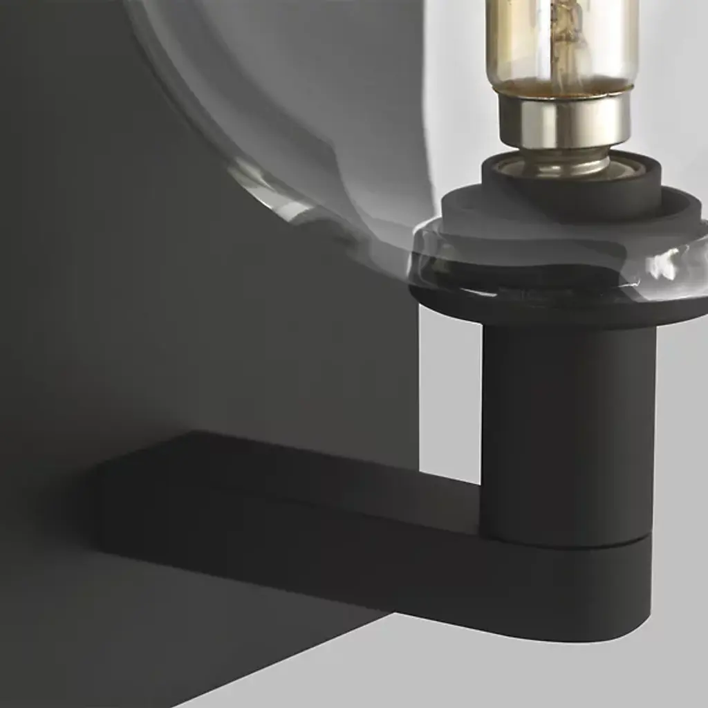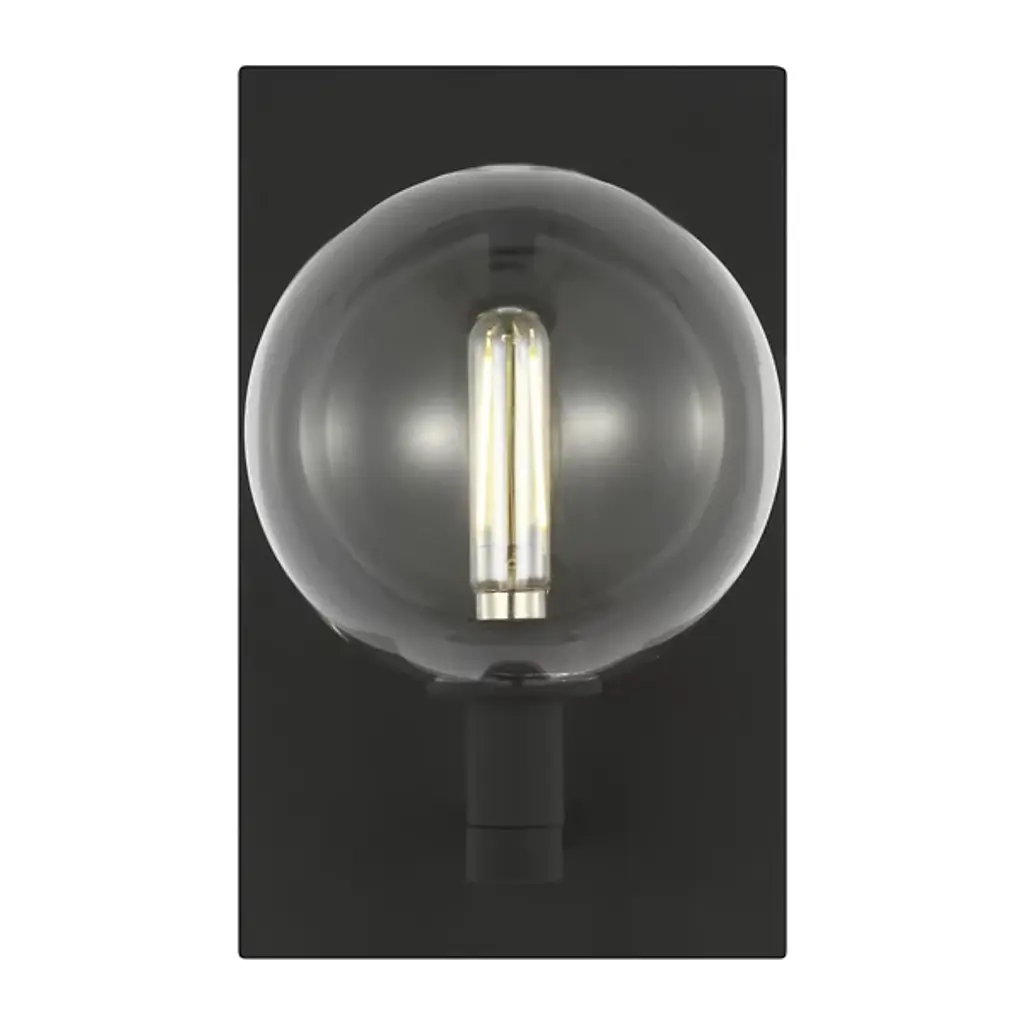 The Visual Comfort Modern, formerly known as Tech Lighting, Gambit Wall Sconce has a warm contemporary style with a twist of retro. The high contrast in materials and tones elevates this simple piece, the transparent glass sphere showcasing the antique reproduction LED bulb. The contrast in shapes also offers intriguing visual interest, the many right angles in the metalwork balanced with a perfect sphere of borosilicate glass.