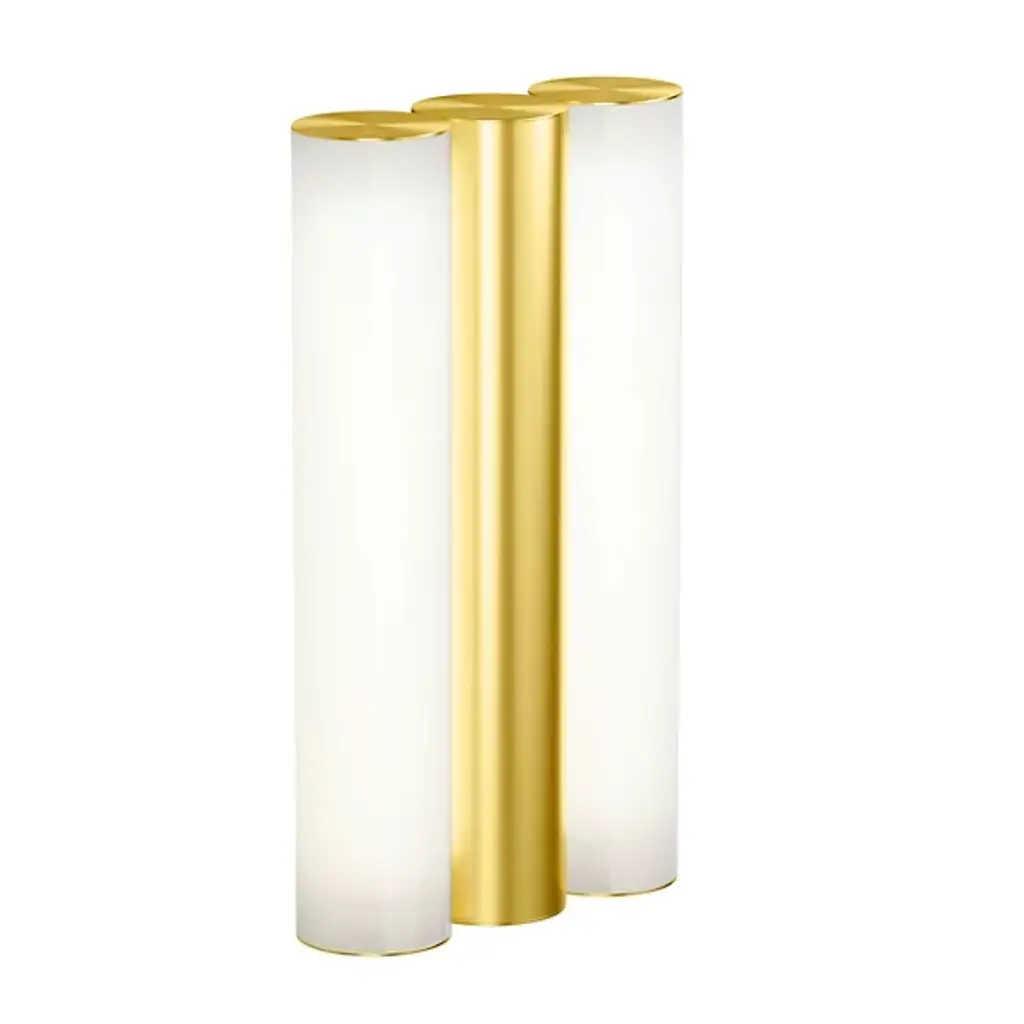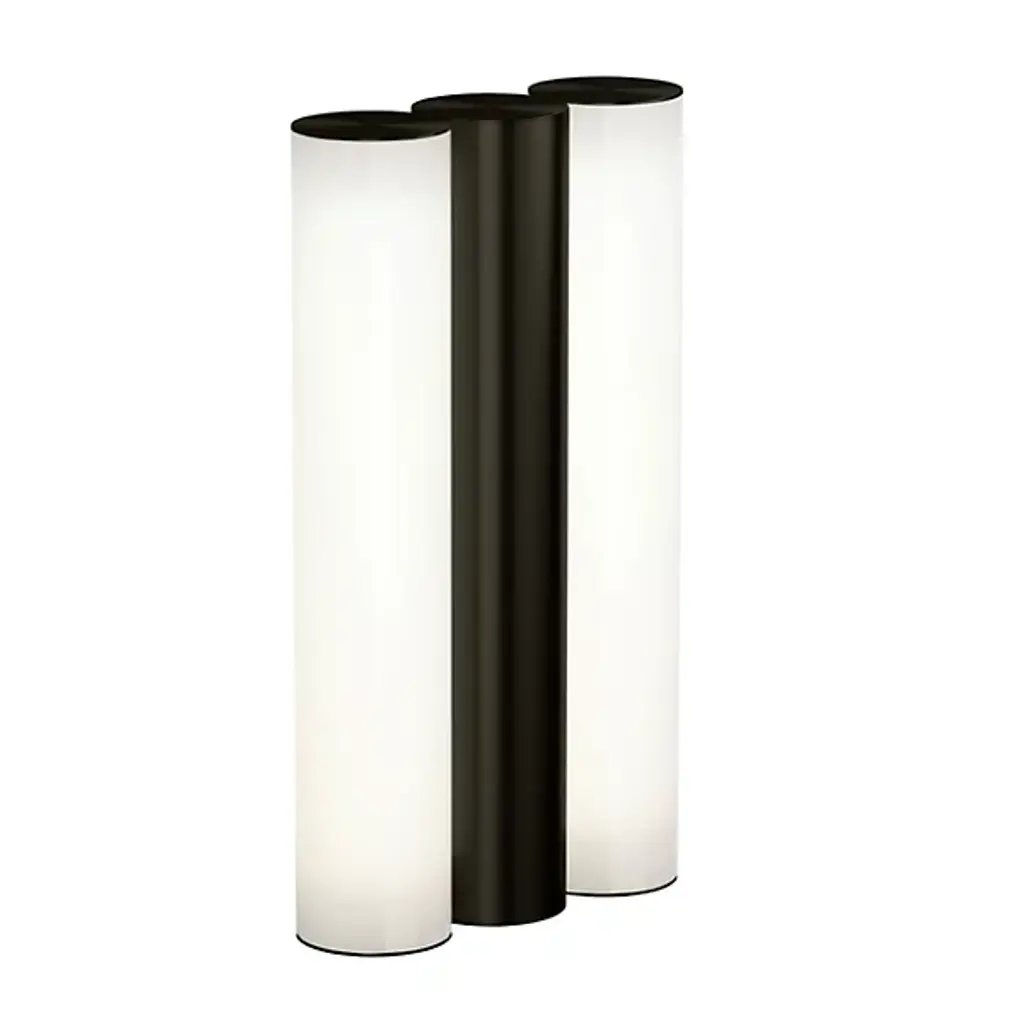 With Art Deco overtones, Gamma consists of a luminous opal cylinder bracketed by similarly sized metal tubes. Personalization comes in the wide choice of available metals—brass, nickel, cooper or graphite—each with either a polished or matte finish. Belgium-based designer Sylvain Willenz has adapted his tubular scheme as the basis for an entire collection, including a grand circular chandelier and linear suspension lights.