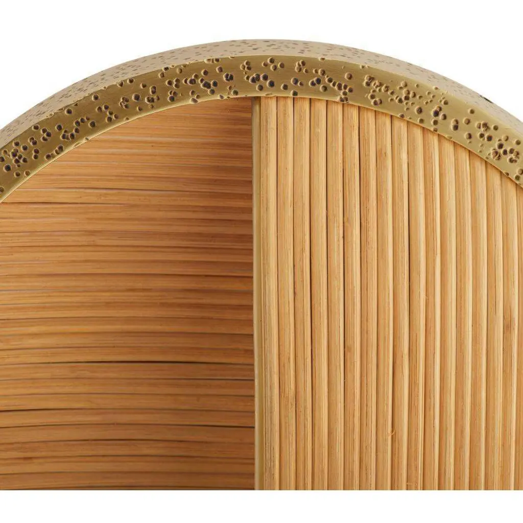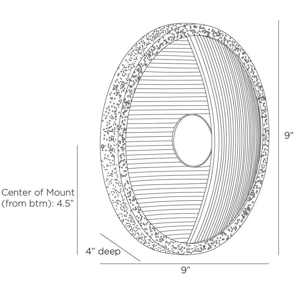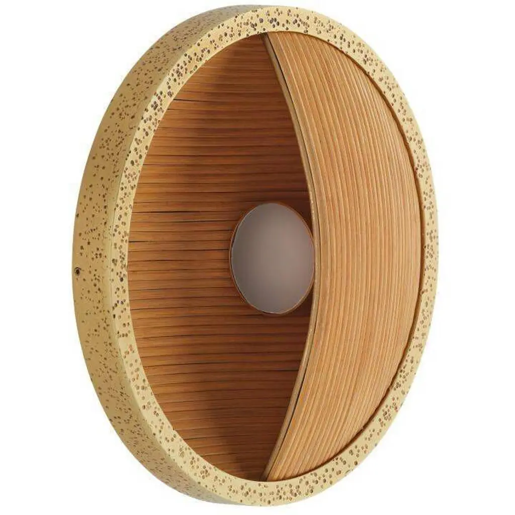Designed to be installed vertically or horizontally for up or down lighting, an intriguing sconce embodies the yin and yang of modern design. Natural pencil rattan is suspended in an antique brass-plated hammered iron setting and distressed at the edges with the antique cow tail technique. Single integrated LED bulb. Damp-rated, although limited covered outdoor areas may affect finish. Finish will vary.