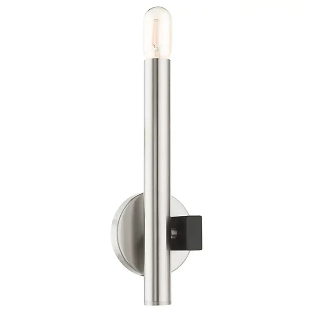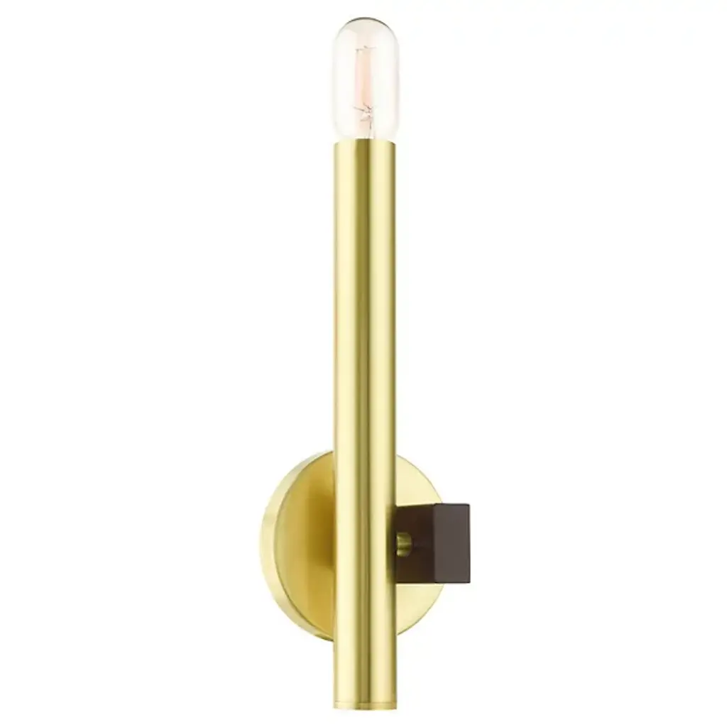 The Garrett Wall Sconce by Alder & Ore has a dynamic look thanks to its simple composition and use of proportions. Drawing from the clean, minimal nature of modern Scandinavian style, this wall sconce offsets a large candle stem to one side of a bold bar that holds an exposed candelabra at its top. Dressed up with a beautiful mix of finishes, this design is anchored by a sleek, round backplate and offers a bright touch to its environment.