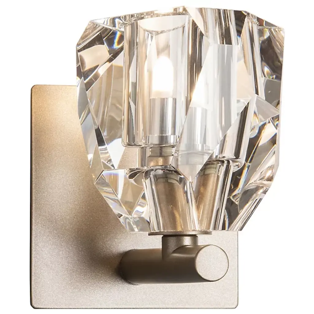 Single wall sconces are an elegant way to light the bath environment. Hand-cut and polished crystal is centered on a steel backplate, secured on a small outcropping of metal below. Available in Black, Oil Rubbed Bronze, Vintage Platinum, Soft Gold, Sterling and Modern Brass.