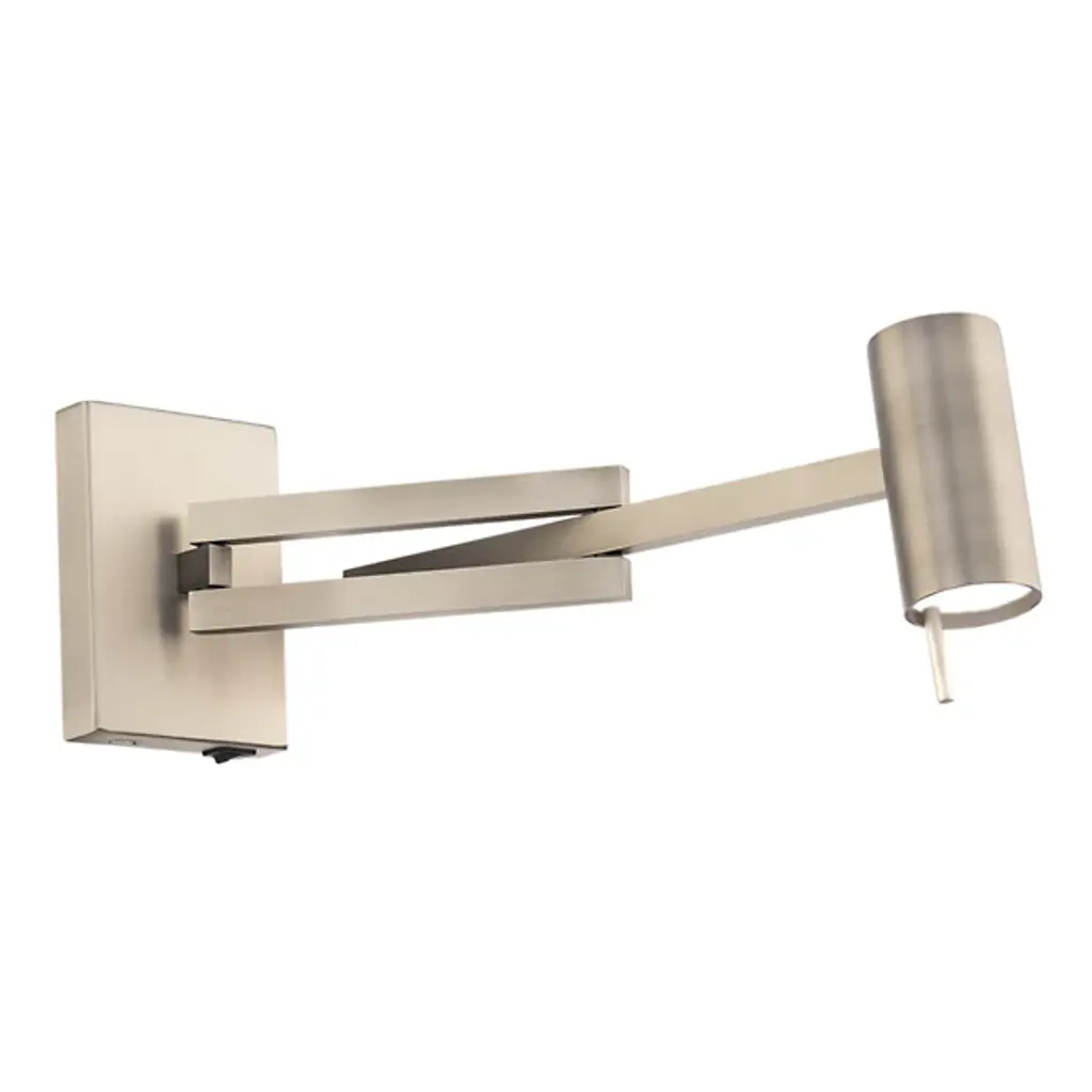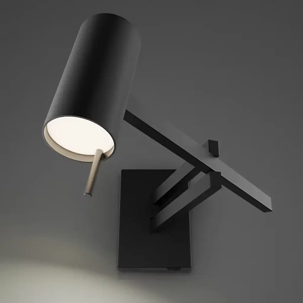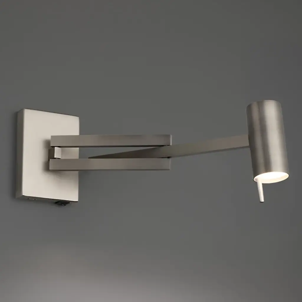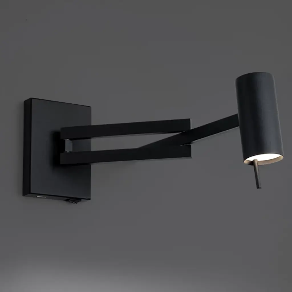 The Gavel Swim Arm LED Wall Sconce from Modern Forms extends clean aluminum geometry through an articulated arm system that terminates in a cylindrical head housing directional LED technology. The mechanical precision of the swing joints contrasts with the smooth, unadorned surfaces of both the mounting base and light head. An integrated USB port and toggle switch occupy the wall plate, while the pivoting head allows for fine-tuned light direction. This fixture’s streamlined form eliminates decorative elements in favor of pure functional geometry.