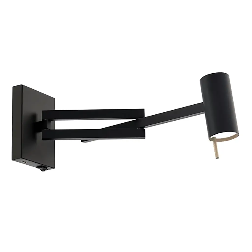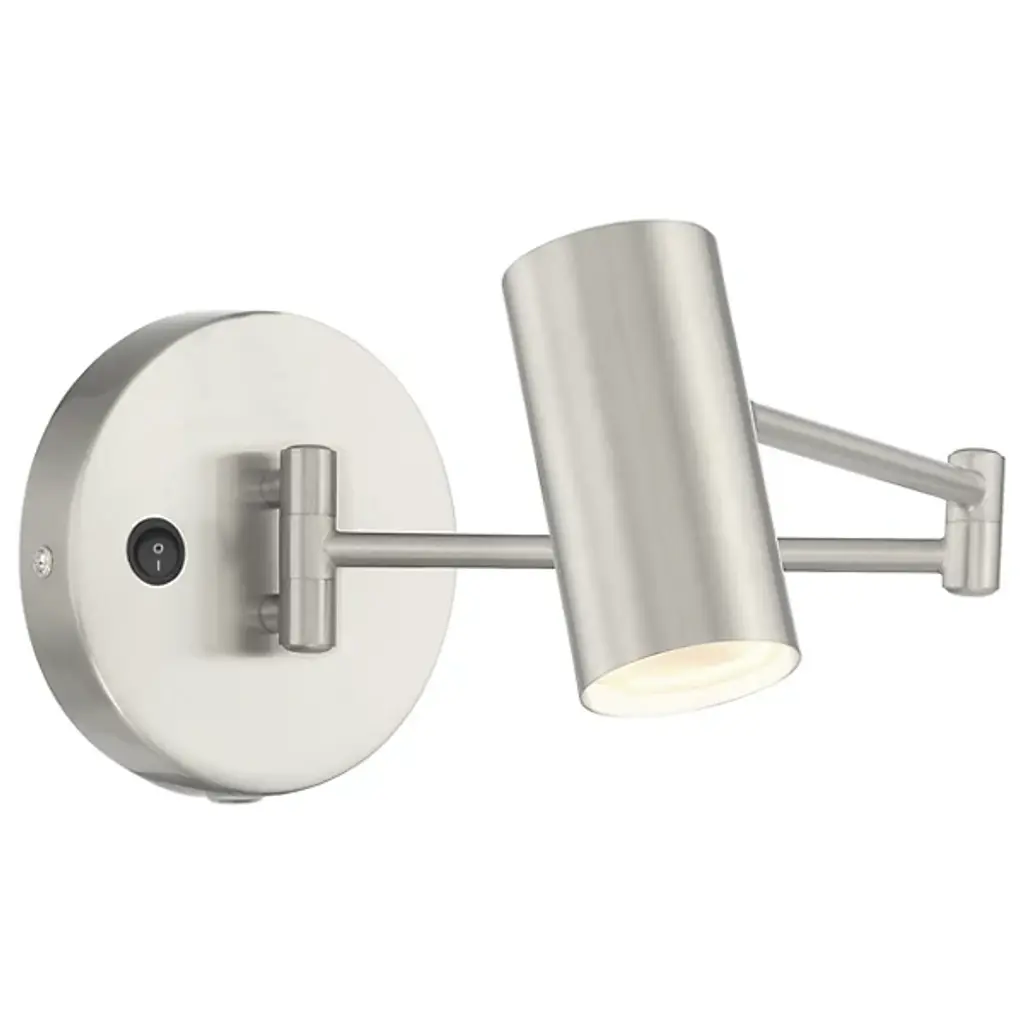 The Gavel Swim Arm LED Wall Sconce from Modern Forms extends clean aluminum geometry through an articulated arm system that terminates in a cylindrical head housing directional LED technology. The mechanical precision of the swing joints contrasts with the smooth, unadorned surfaces of both the mounting base and light head. An integrated USB port and toggle switch occupy the wall plate, while the pivoting head allows for fine-tuned light direction. This fixture’s streamlined form eliminates decorative elements in favor of pure functional geometry.