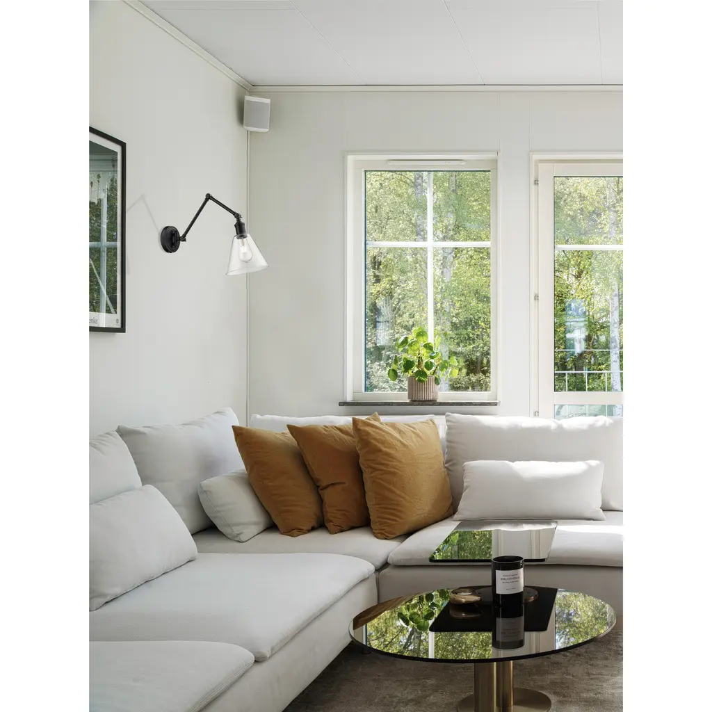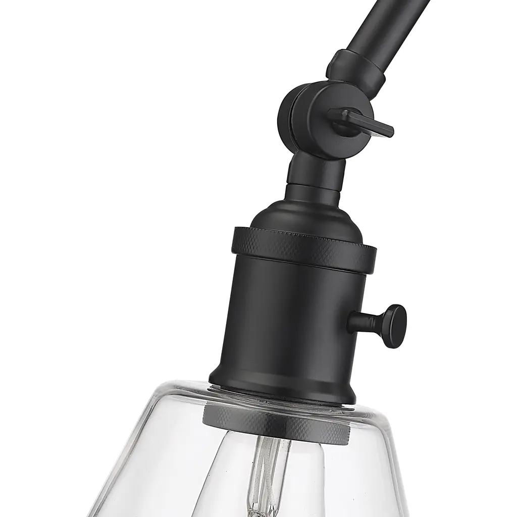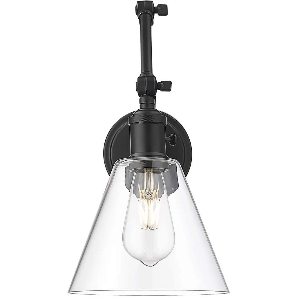 Mixed motifs offer an exquisite form of industrial style in a one-light wall sconce offering the perfect blend of glam and industrial design aesthetics. Constructed of bold matte black finish steel framing and a conical clear glass shade, it delivers utility in an adjustable configuration making it easy to achieve customizable lighting levels. Install through hard-wiring or purchase separate simple and portable cord-and-plug mounting to move from space to space.