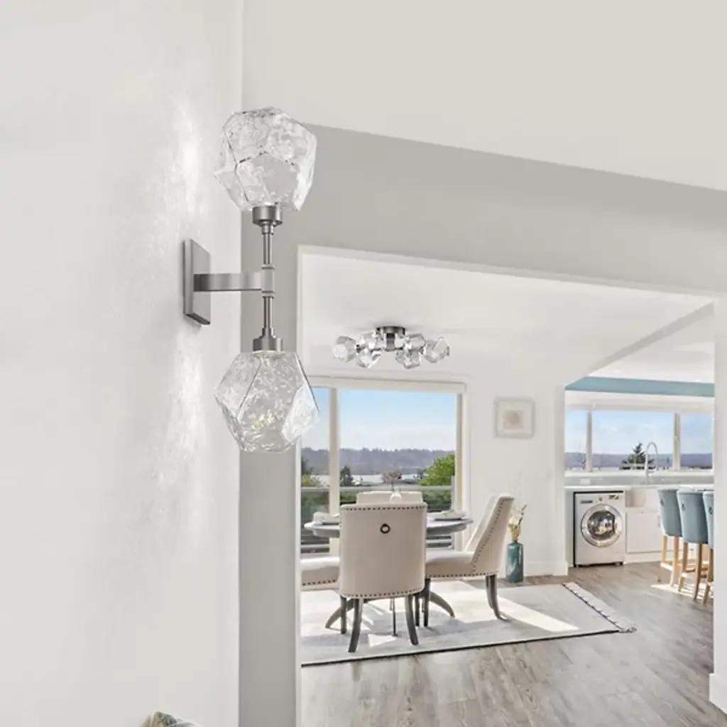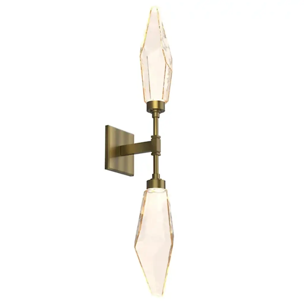 Make an arresting addition to your inside wall and hallway surfaces with the enchanting shape of the Gem LED Double Wall Sconce from Hammerton Studio. A blend of geometric order and organic freedom, it extends a single short bar from a square and spindly, contoured stem from a metal wall plate which can be oriented vertically or horizontally with ease. A potent led lamp blooms from a small round housing at either end of the stem, set inside artisan-made shades of blown glass that express a vibrant, natural glow in all directions.