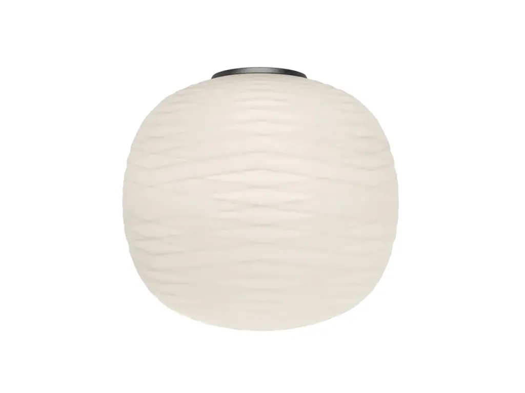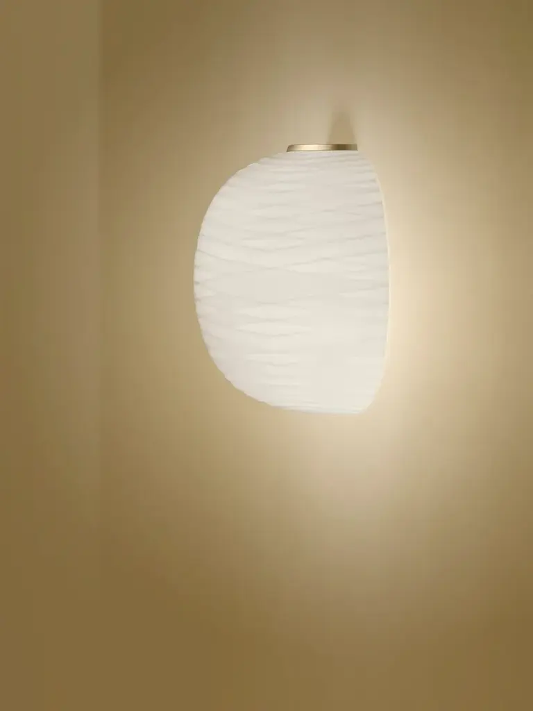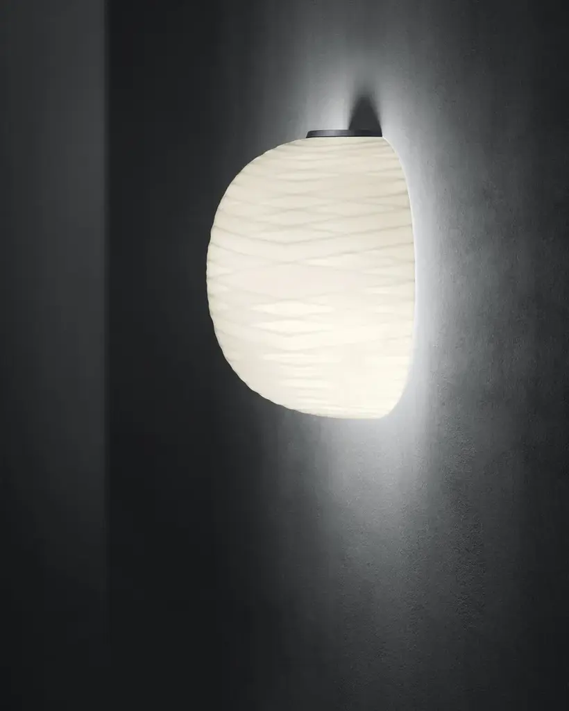 Gem is a wall light made of blown acid etched glass with reliefs.LIGHT SOURCE220 / 240 VMax 30W E27IP 20Not dimmableLight bulb not includedThe precious beauty of the material is conveyed at first glance. The graphic pattern of waves on the surface makes the lamp a vivid presence, even when not in use. The three-dimensional facets are made with a technique of glassblowing inside a mould with incisions. The support is in three different colours, with a matte finish.