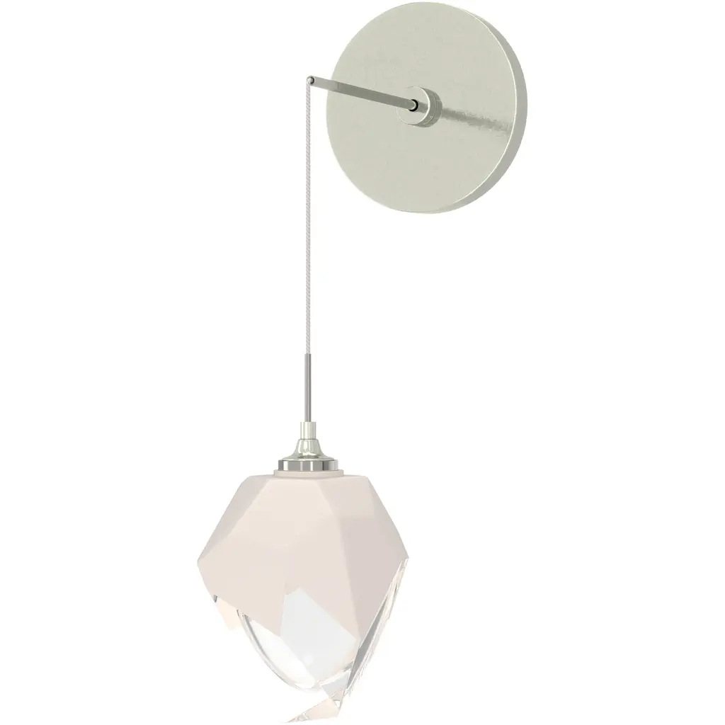 Like a shimmering earring, the Gem Tempo LED Wall Sconce from Hammerton Studio adorns your home’s walls with a dazzling form bursting with light-reflecting detail from every angle you look at it. While often reserved for one’s body, Hammerton Studio designed the piece to see what happens when jewelry is introduced to the home. It offers a sophisticated presentation as it mounts to your walls with a sleek geometric backplate. A slender arm and stem line up the shade physically and visually with a trim figure. Hanging neatly below, intricate facets shoot out in every angle, their surfaces accompanied by textural detail only possible through the art of glass blowing. These cast forms present a dynamic silhouette of angles that visually jumps off against the wall. The light raining down on the gem further highlights its features as it shines through and filters out as a seductive ambient glow.