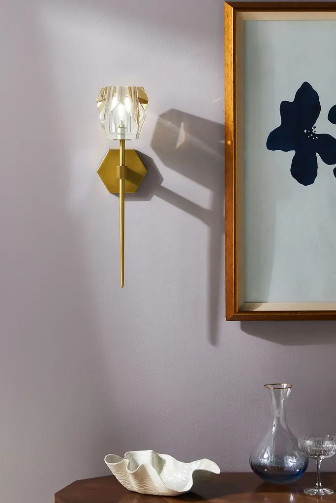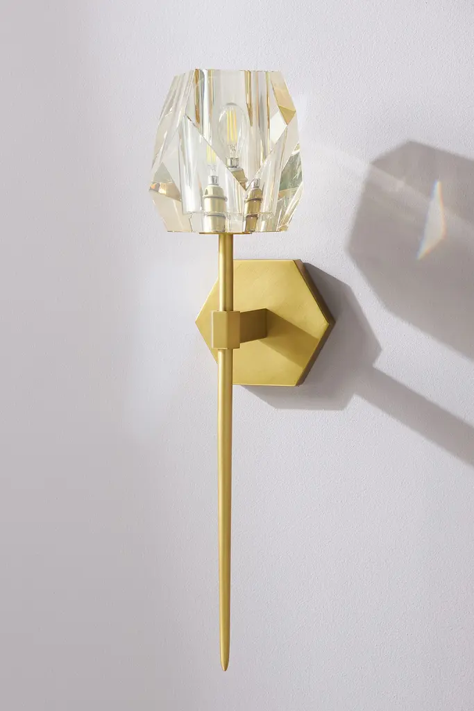 Crafted from champagne crystals that offer mesmerizing shadowplay for a wall, this gem-inspired sconce adds a luxe touch to any interior. This item is UL listed, meaning it has been tested and approved to meet the government-regulated safety standards for the USA. Use with electrical outlets 110-120v or lower, as anything higher can cause fire or injury. If you're purchasing this item for use outside of the United States, employ the adapter and voltage converter suited for your country.