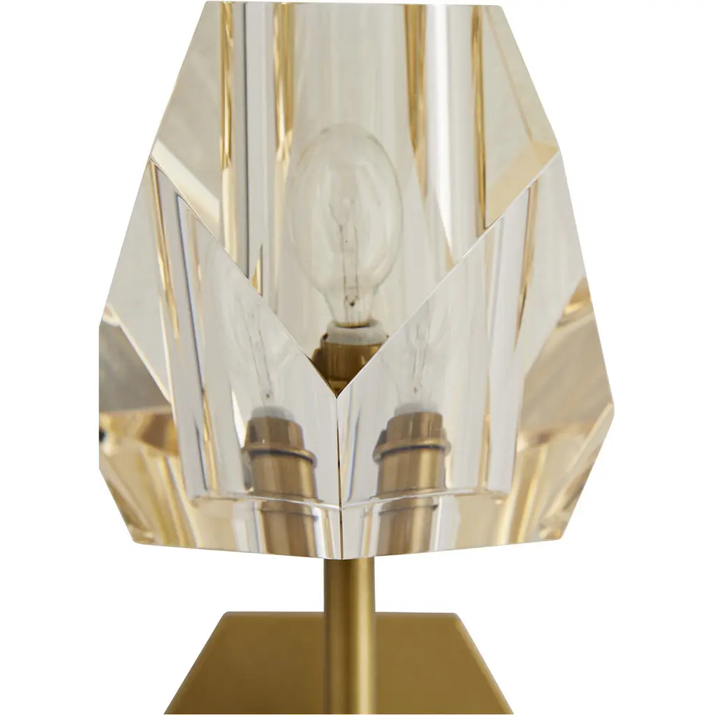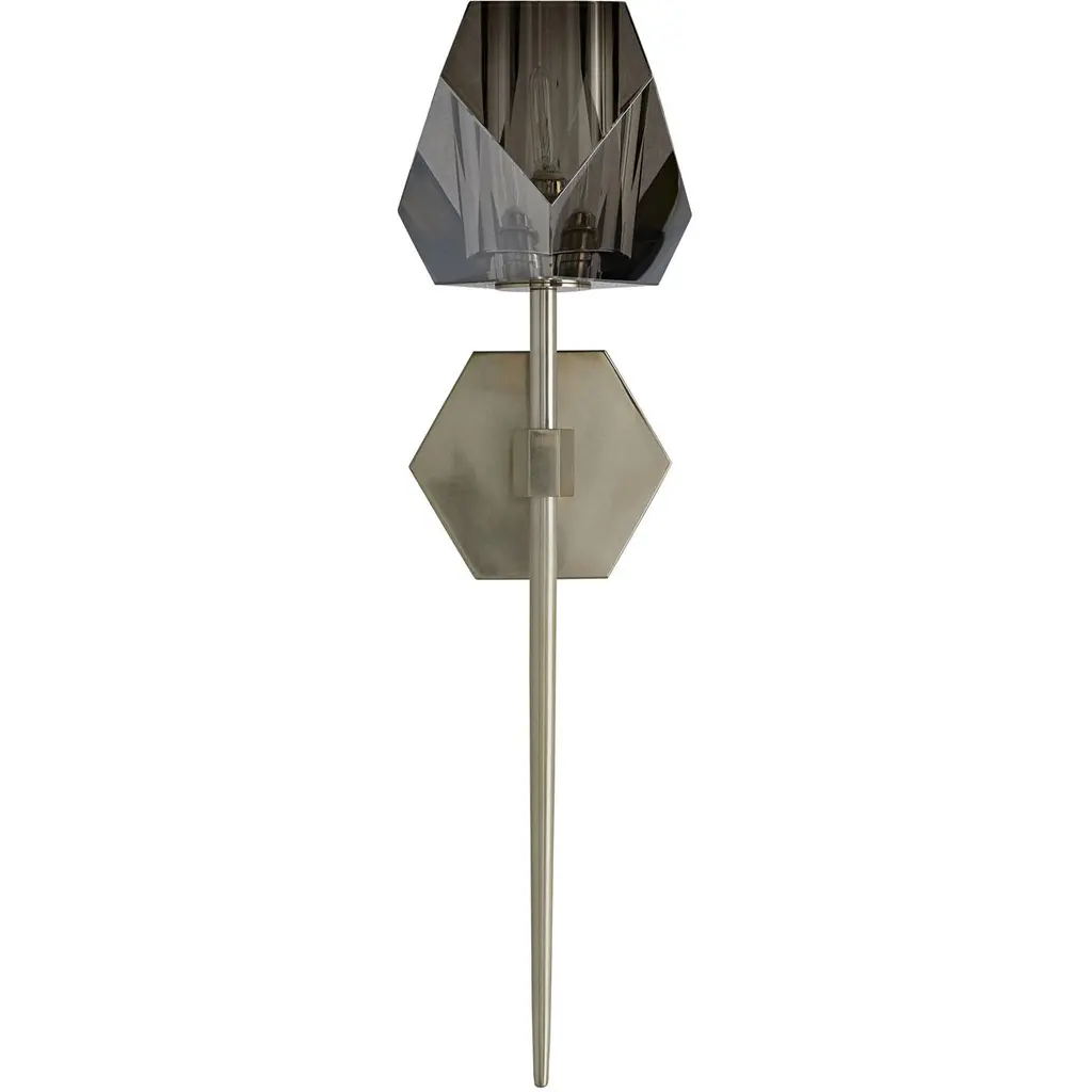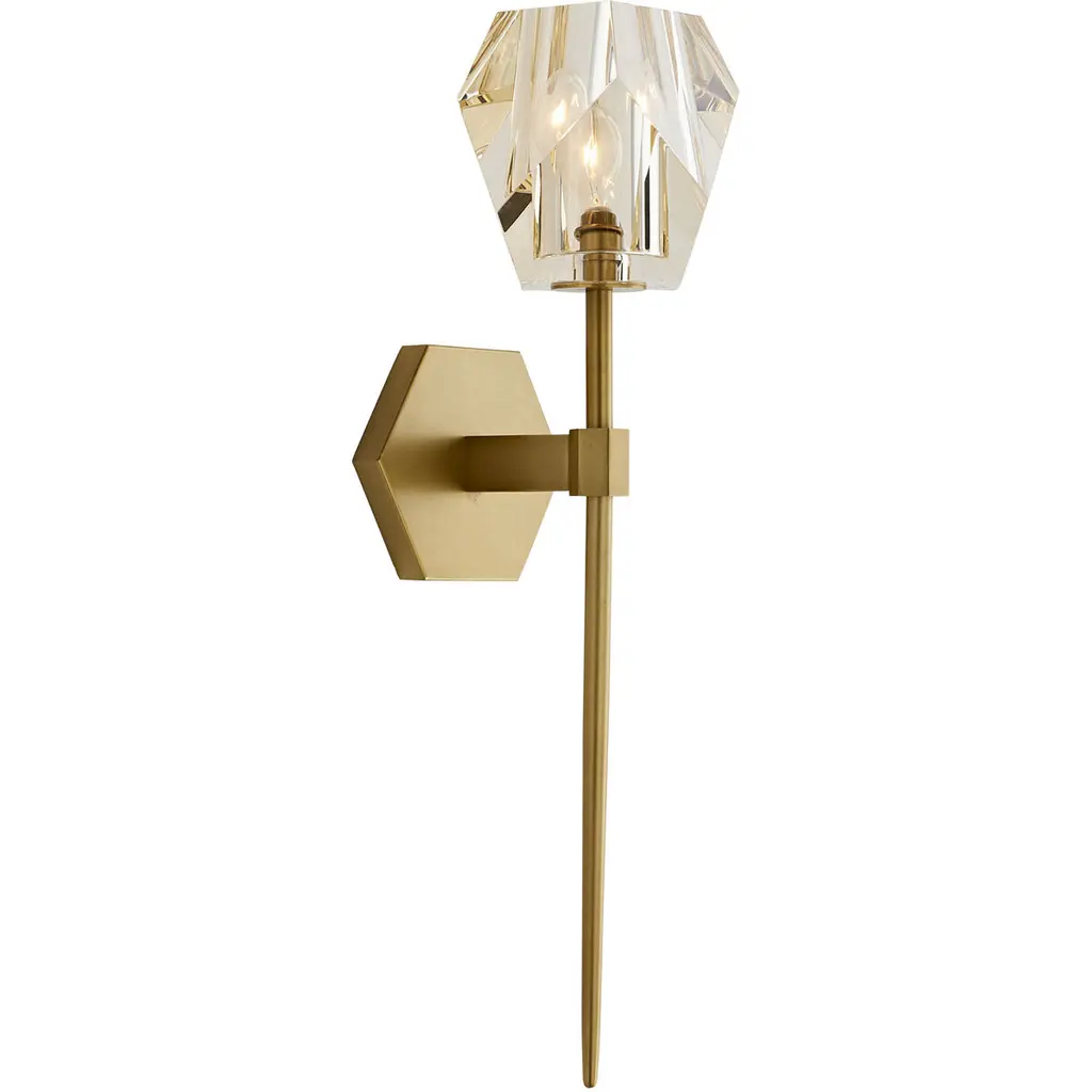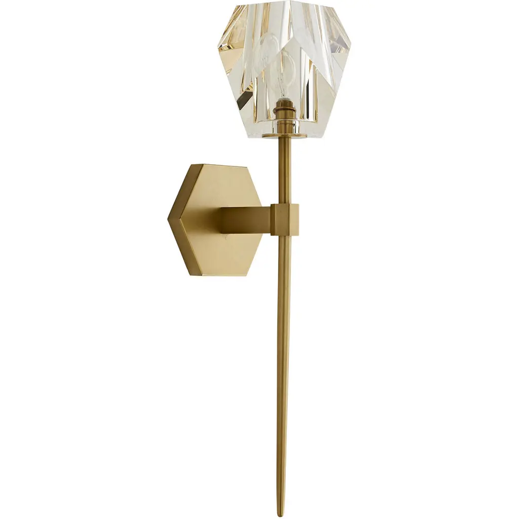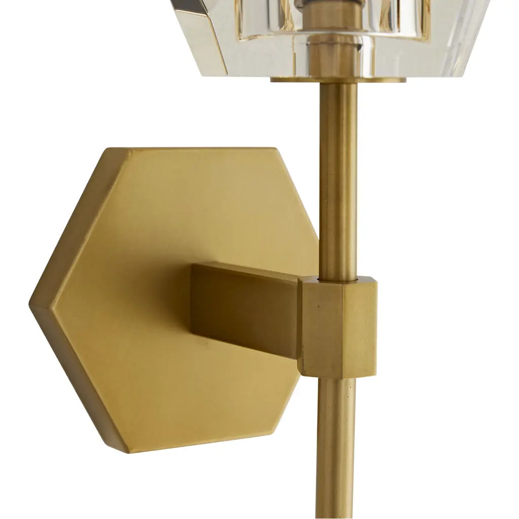 Form meets function with this diamond-esque sconce. The champagne crystal form possesses an arresting blend of elements and colors that helps create mesmerizing shadowplay along a wall space. When in use the sharp angles of the faceted structure are both softened and defined by its contents. An antique brass steel stem extends from a hexagon-shaped backplate to stylishly showcase this functional gem. Damp-rated although limited covered outdoor conditions may affect finish.