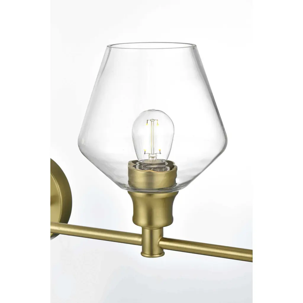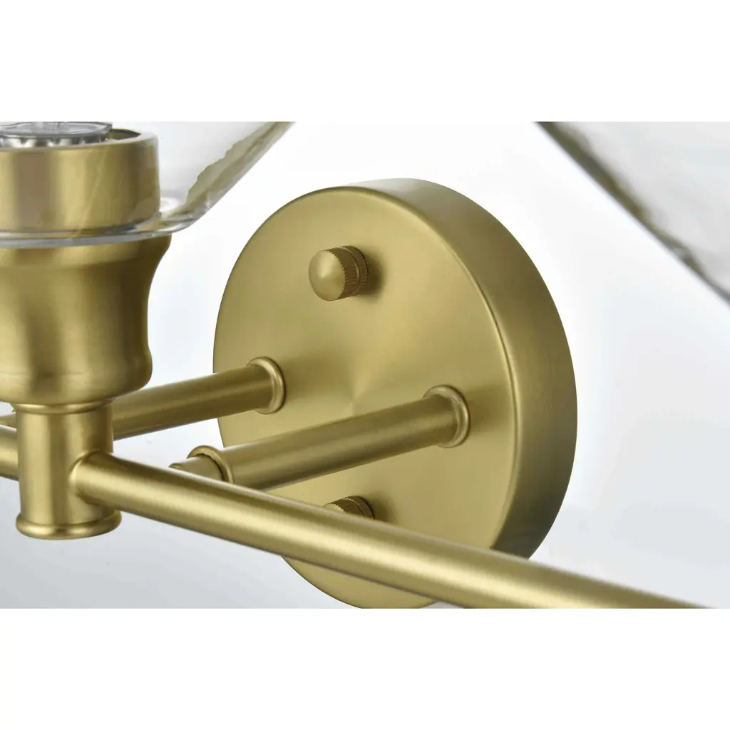 Enhance your living space with this versatile and modern wall sconce. Available in satin gold, chrome, black, and brass finishes, this fixture brings a touch of luxury to any room. The wall sconce features a pair of uniquely shaped, flared clear glass shades that deliver a beautiful, ambient glow, whether mounted upwards or downwards. Crafted from durable iron and glass, it combines strength with style, and the clean lines of the round backplate and horizontal arm create a contemporary aesthetic. Designed for hardwired installation, this fixture uses E26 standard sockets, allowing you to choose the ideal bulbs for your setting. This wall sconce is the perfect blend of form and function, ready to add a stylish and inviting touch to your home.
