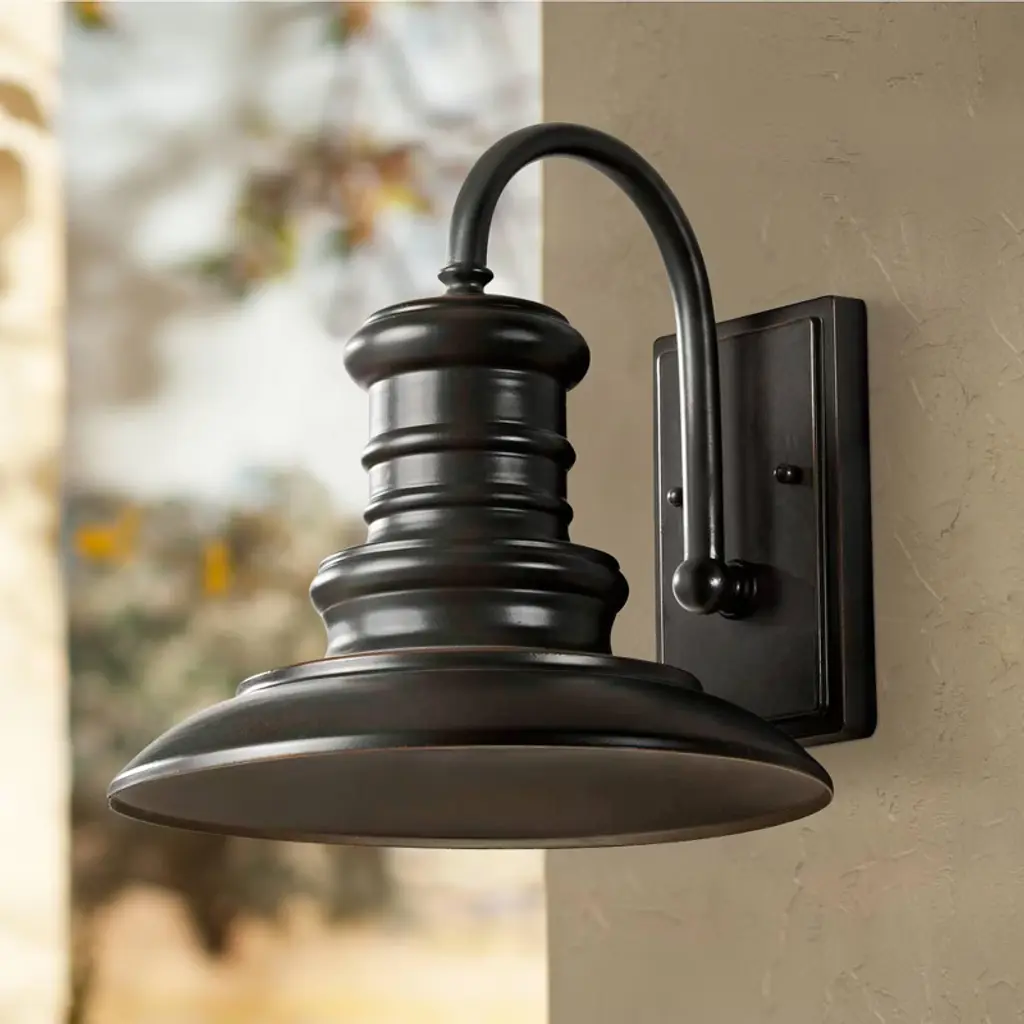 This medium outdoor wall light will bring an updated industrial style to your exterior space. Its sturdy modern origin is evident in the bold curve of the arm and clean look of the metal shade, all in a warm Restoration Bronze finish for a vintage look. Perfect next to a door, on the garage, or out back on the workshop. From the Generation Lighting outdoor lighting collection.