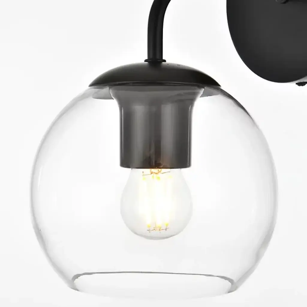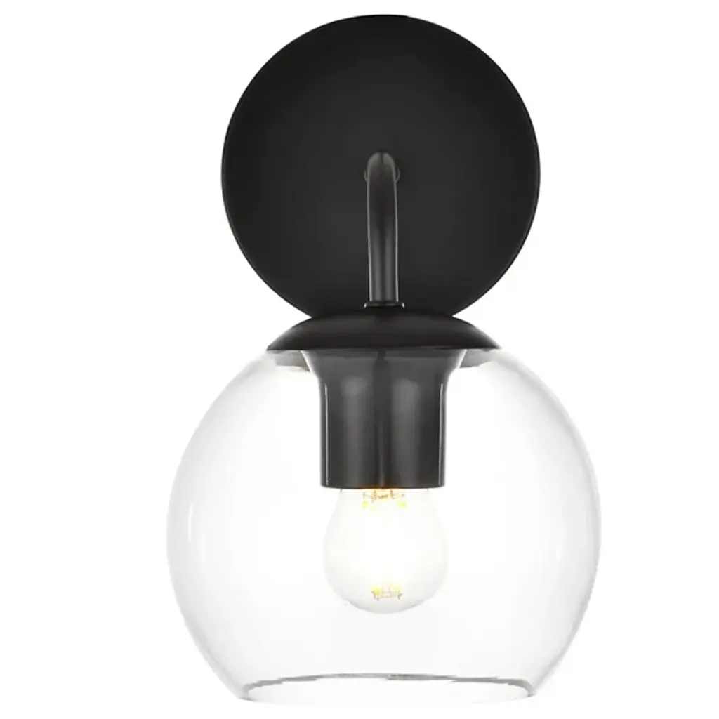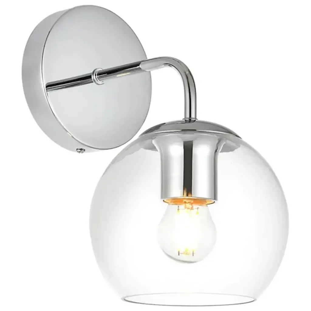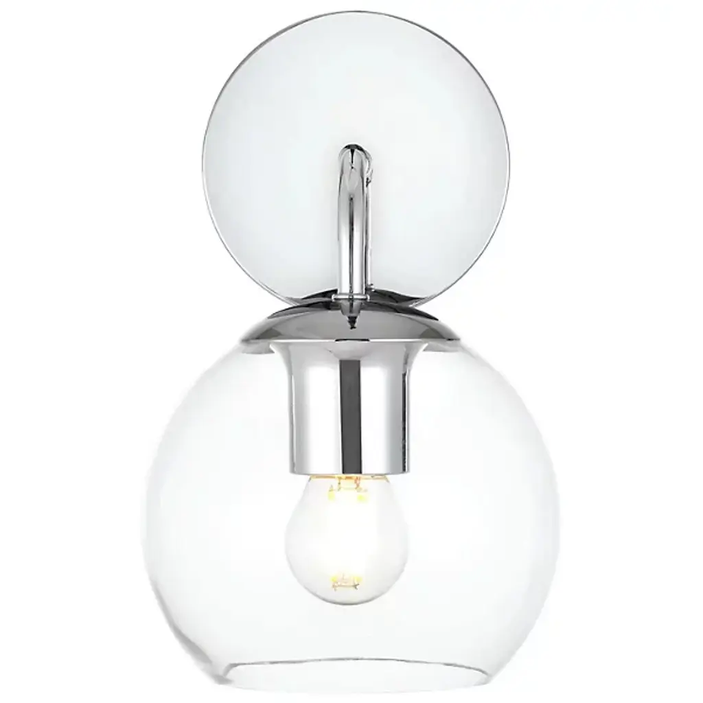 The Genesis Bath Sconce from Elegant Lighting balances geometric forms with ethereal glass to create a truly unique lighting experience. A substantial circular backplate anchors the piece, from which emerges a curved arm that cradles a luminous glass orb. The clear glass globe houses the light source, allowing it to shine unobstructed. This interaction of shapes - circle, curve, and sphere - evokes a sense of celestial harmony, as if a miniature solar system has taken up residence on your wall.