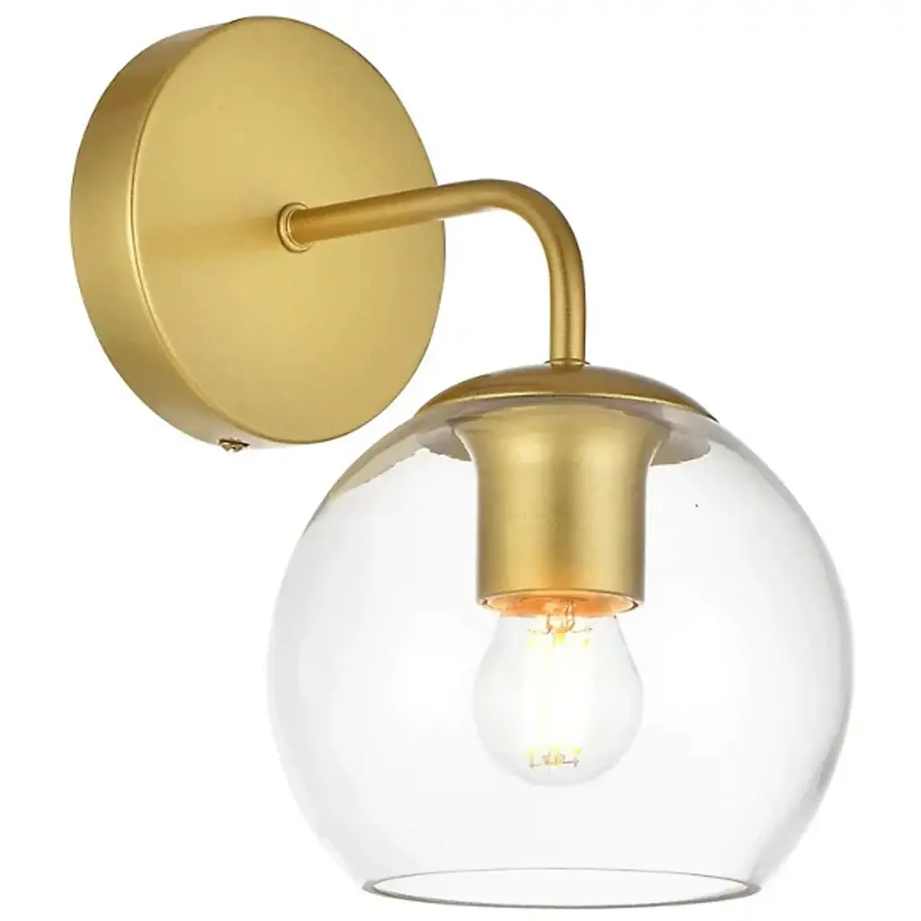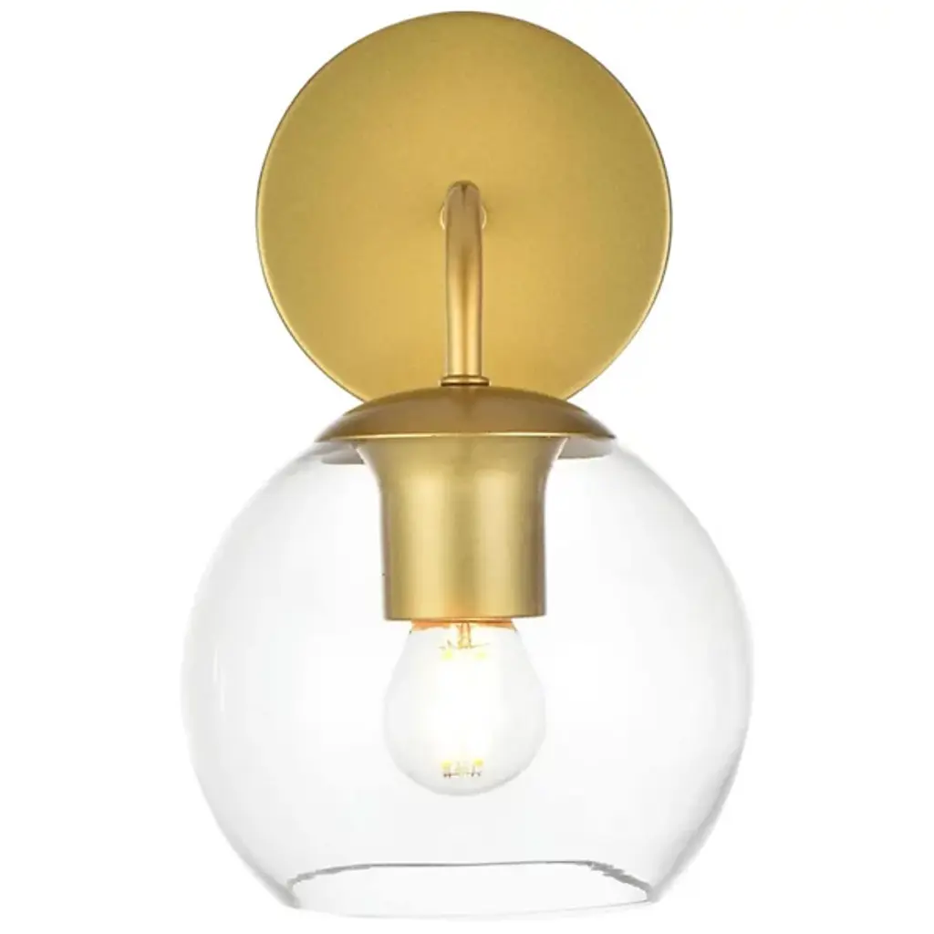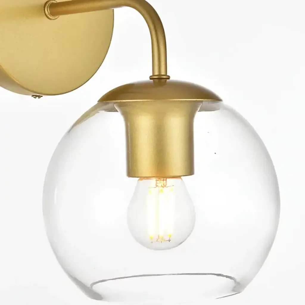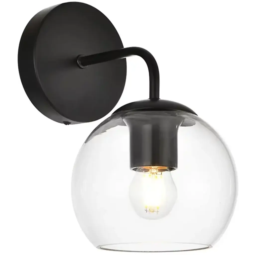 The Genesis Bath Sconce from Elegant Lighting balances geometric forms with ethereal glass to create a truly unique lighting experience. A substantial circular backplate anchors the piece, from which emerges a curved arm that cradles a luminous glass orb. The clear glass globe houses the light source, allowing it to shine unobstructed. This interaction of shapes - circle, curve, and sphere - evokes a sense of celestial harmony, as if a miniature solar system has taken up residence on your wall.