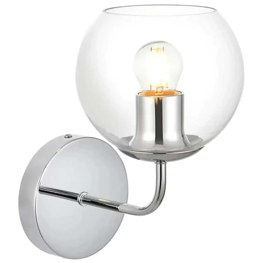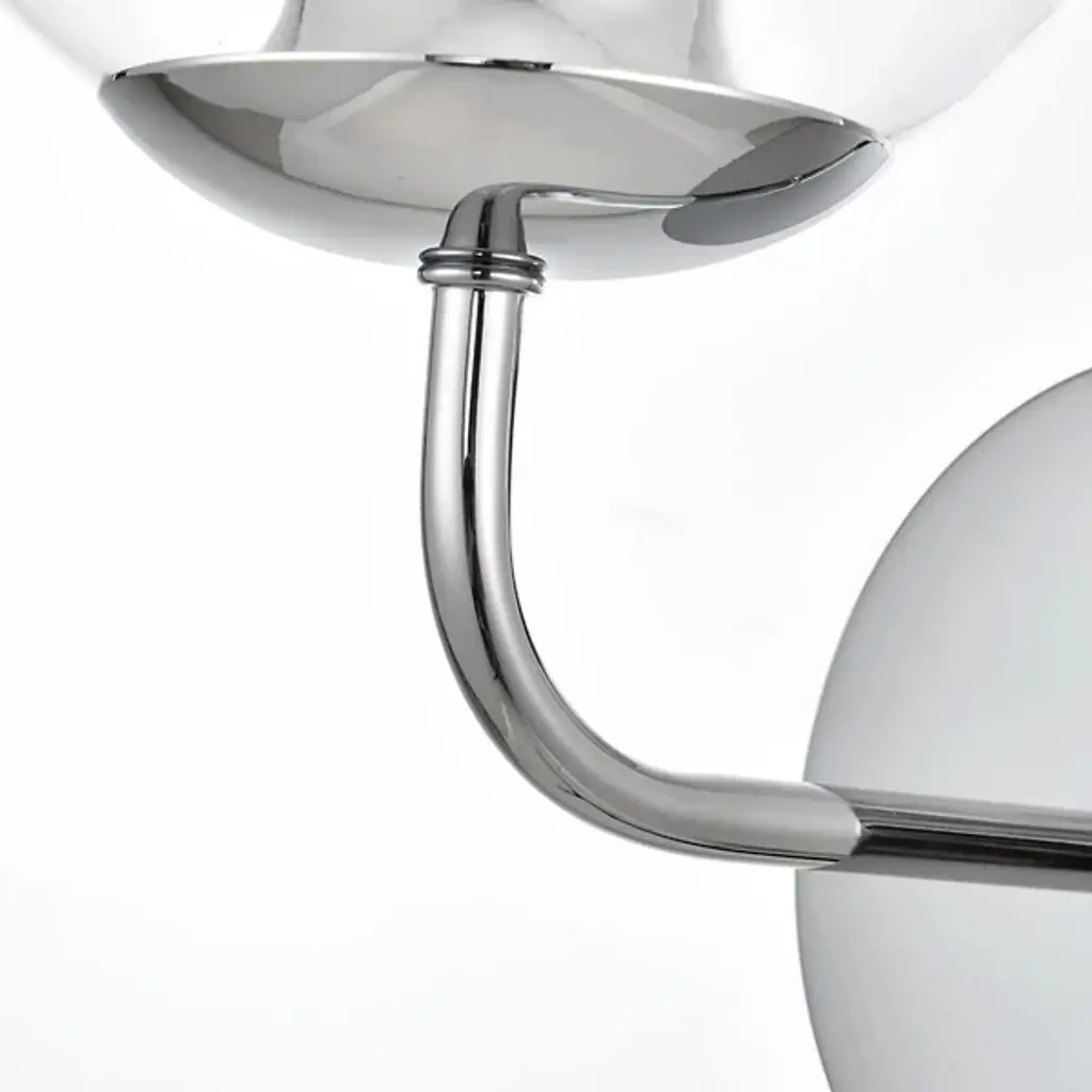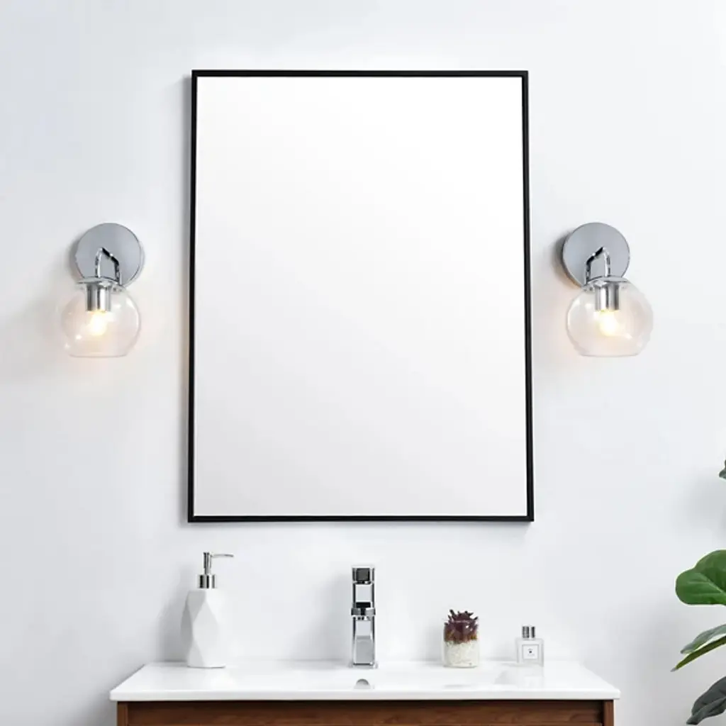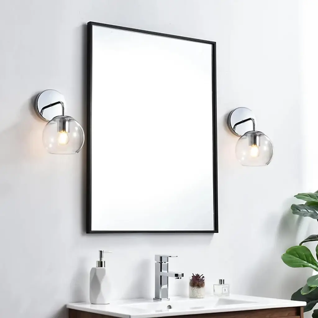 The Genesis Bath Sconce from Elegant Lighting balances geometric forms with ethereal glass to create a truly unique lighting experience. A substantial circular backplate anchors the piece, from which emerges a curved arm that cradles a luminous glass orb. The clear glass globe houses the light source, allowing it to shine unobstructed. This interaction of shapes - circle, curve, and sphere - evokes a sense of celestial harmony, as if a miniature solar system has taken up residence on your wall.