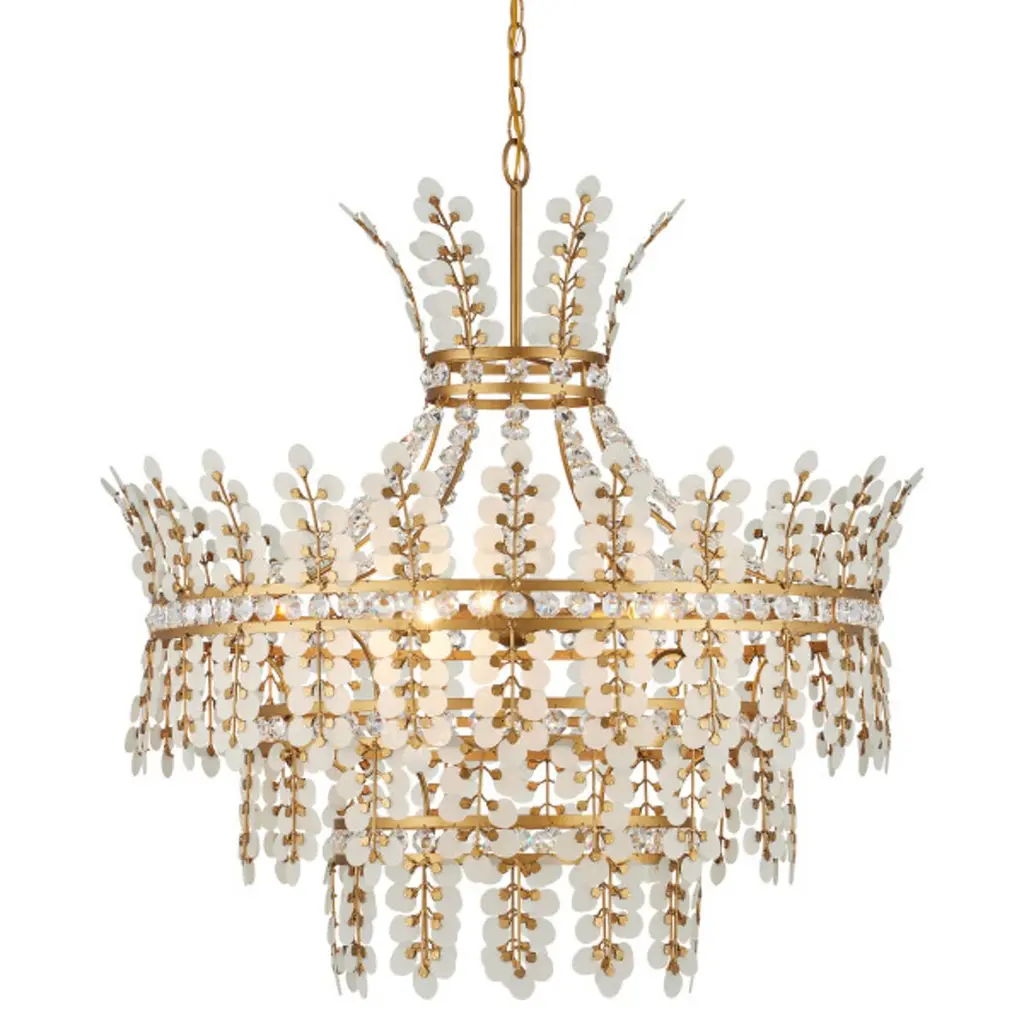 Individual drops of clear and frosted glass are intricately strung through delicate threads of Gold Leaf for a striking, weeping willow-inspired silhouette. Thicker Gold Leaf arms act as branches, suspending varying lengths of the glass strands to create a calming, cascading effect. Available as a wall sconce, pendant, and chandelier.