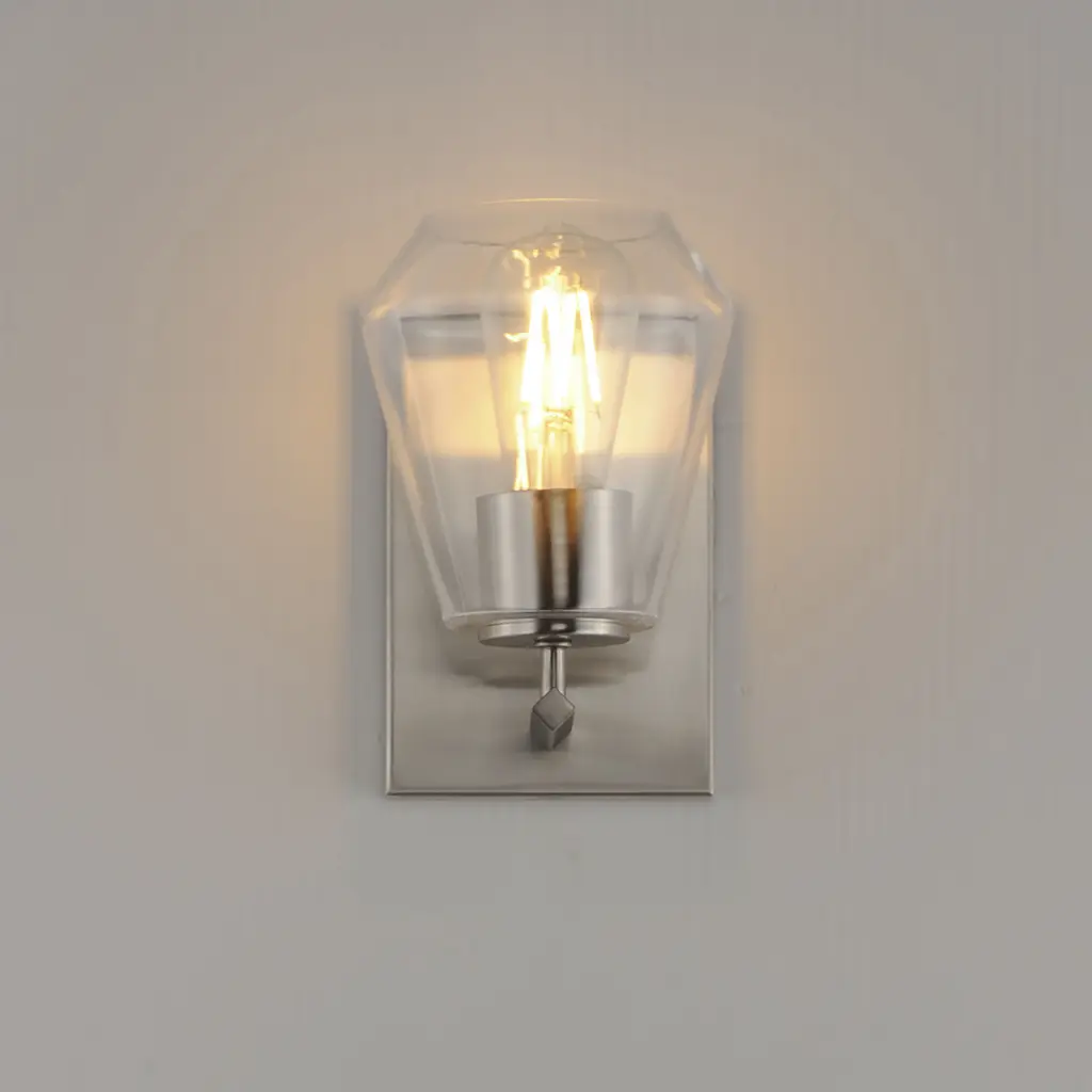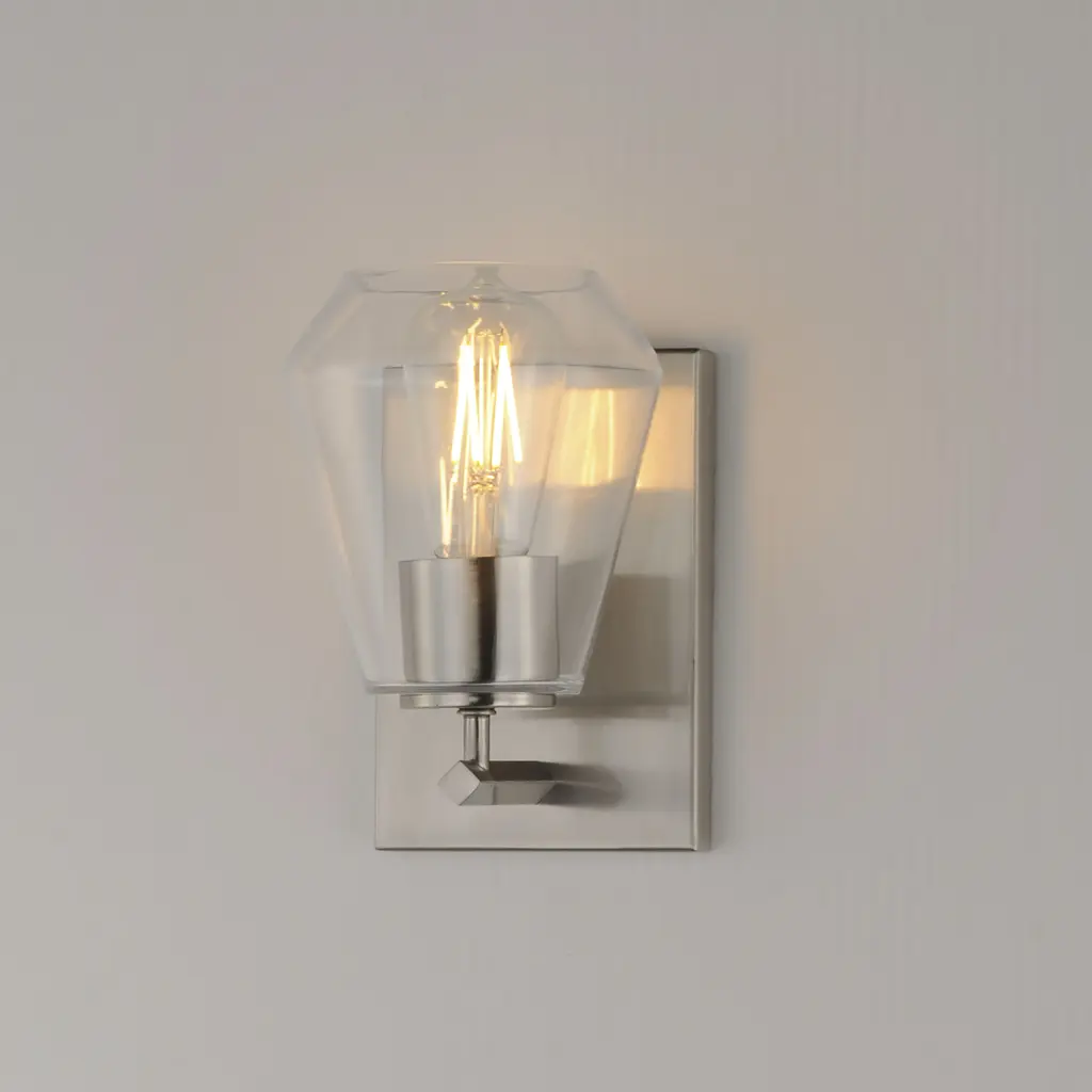 Crystalline clarity meets modern structure in the Geode collection. Inspired by the faceted symmetry of natural mineral formations, each clear glass shade is cut in an angular form that plays with light and shadow. The bold, geometric silhouette feels effortlessly architectural -- elevated further by subtle industrial notes like knurled screw collars and diamond shaped tubing on bath configurations. Offered in a range of sizes and finishes, Geode brings sculptural interest to kitchens, bathrooms, and dining rooms as well as statement-making entryways.