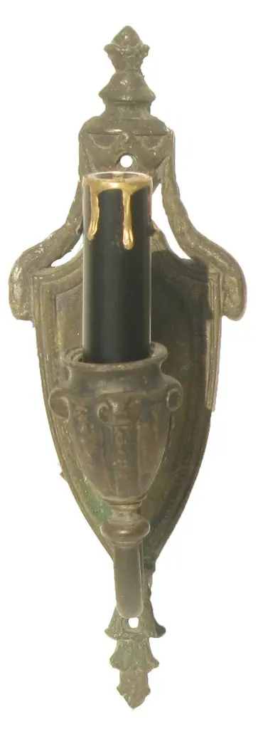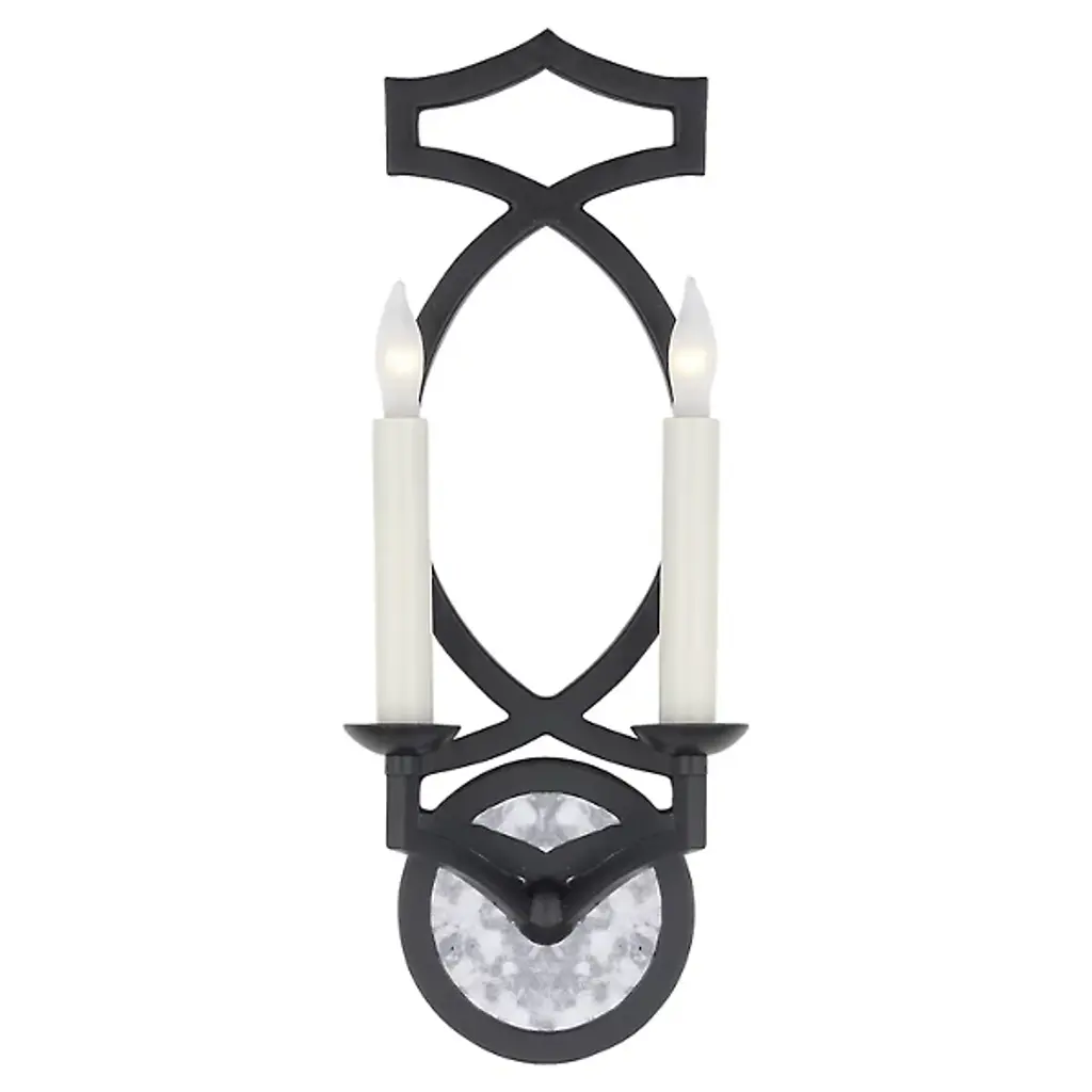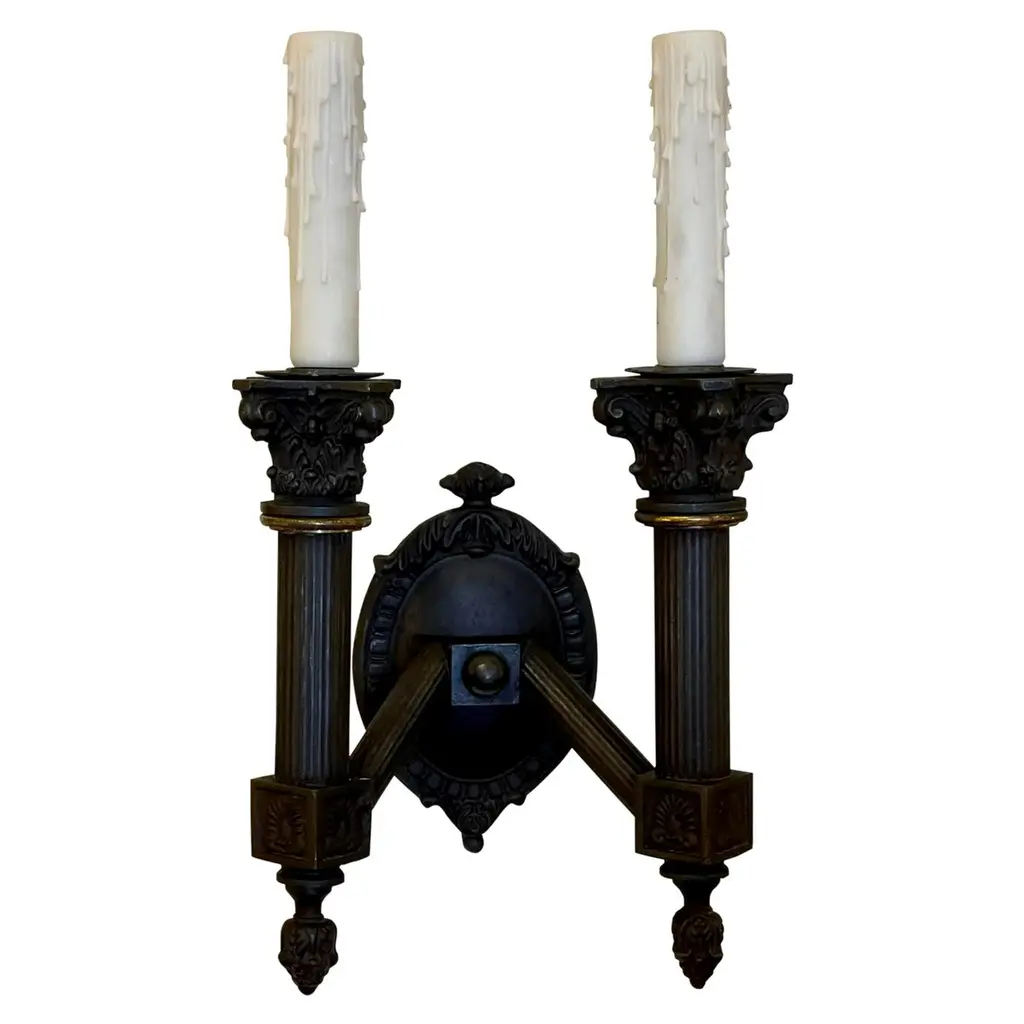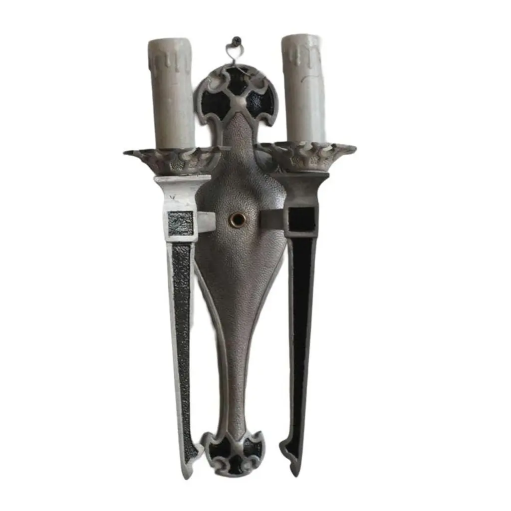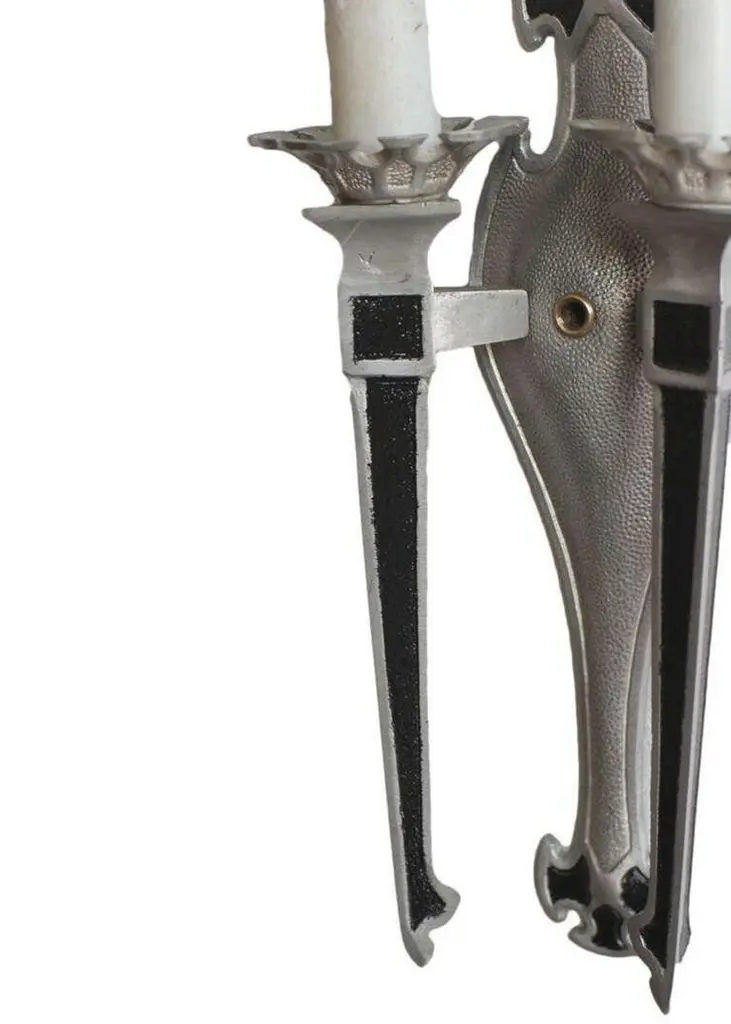 Vintage 1920s geometric Art Deco aluminum wall sconces with black overlaid enamel showcasing a Classic deco style. Stamped “Cal 69634 Des Patented“ along the back.