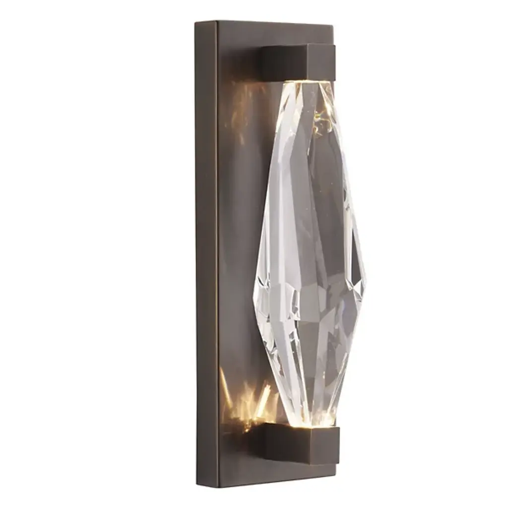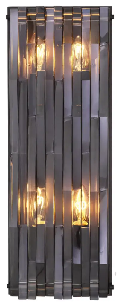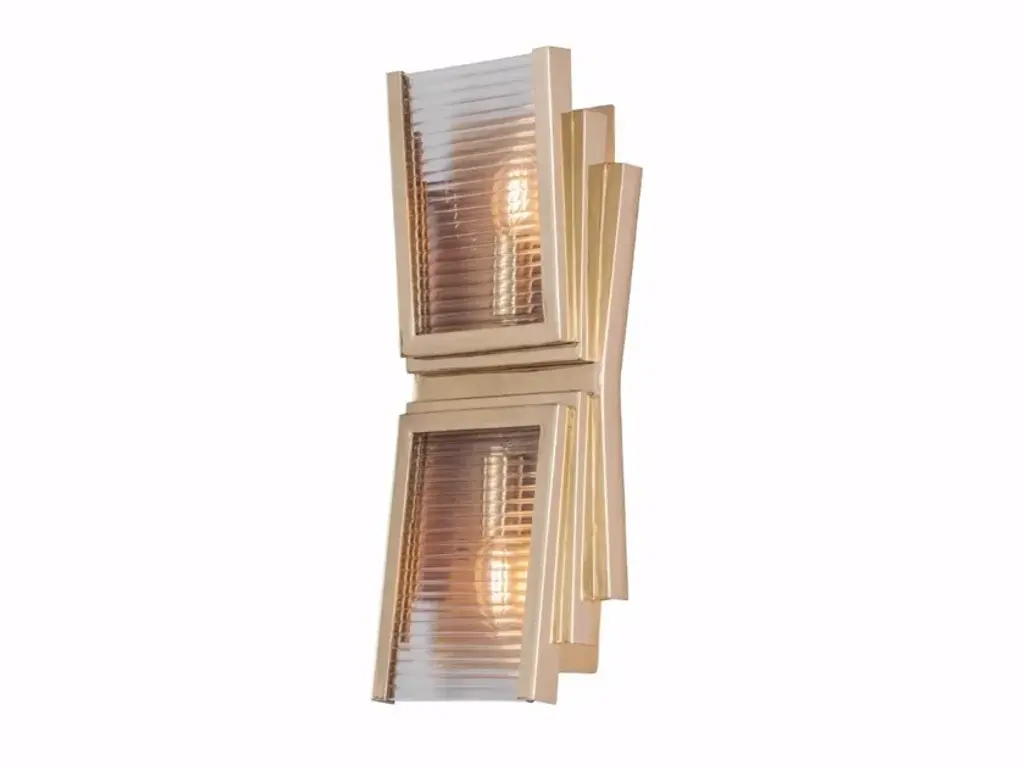 Thick plates of green glass create a striking relief pattern with geometric lines, giving the large Nuvola Wall Lamp an architectural appearance. Mounted on an antique brass fixture, the glass refracts the light, thus creating a wonderful play of light in your interior.W8 x D4 x H20 in | Weight 33lbsMaterials | Iron, Glass4 Bulbs, Max. 5W - E12 - 110 VoltComes in 2 colors