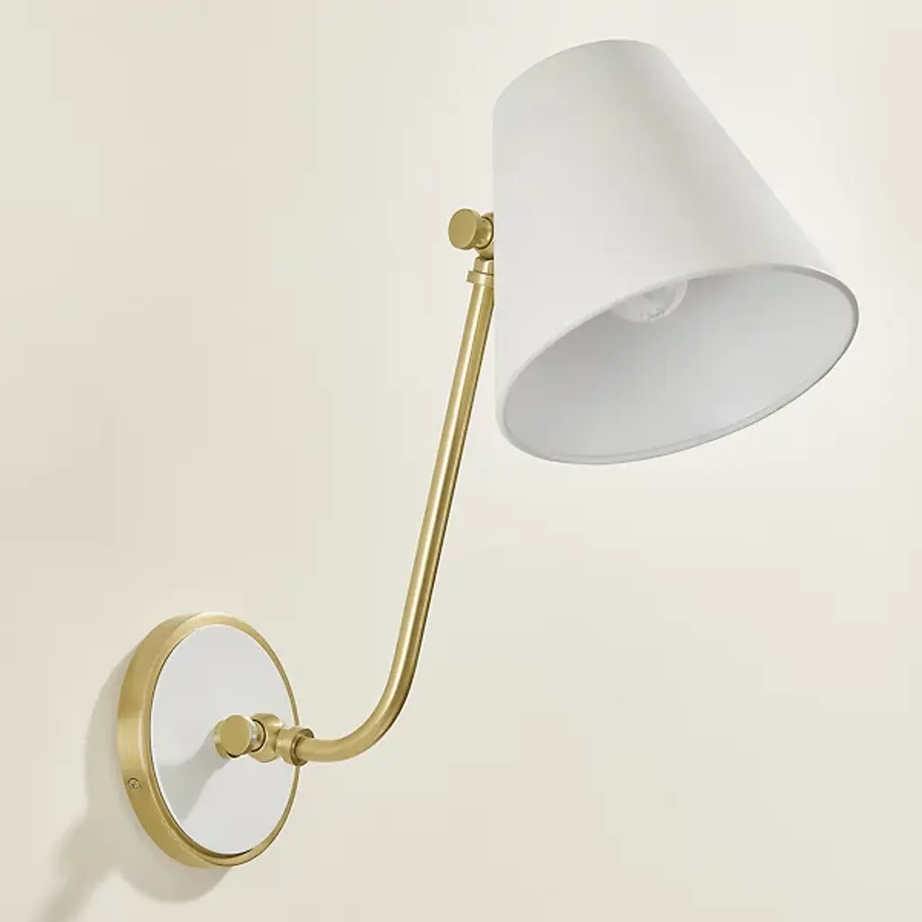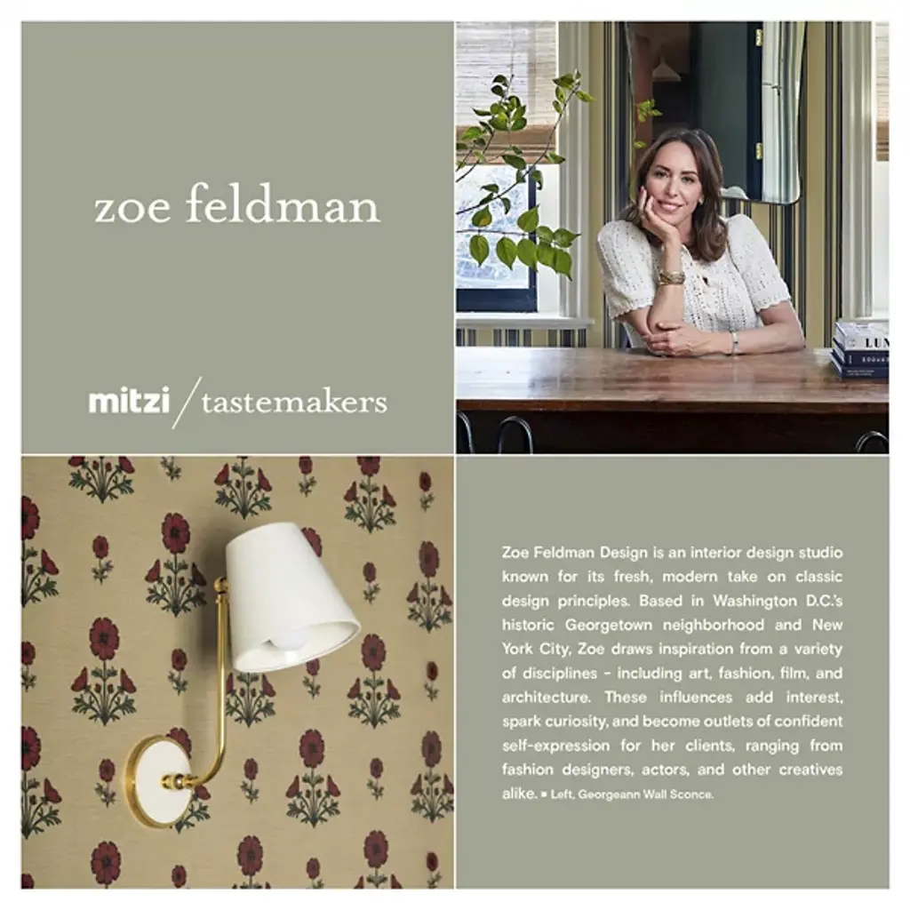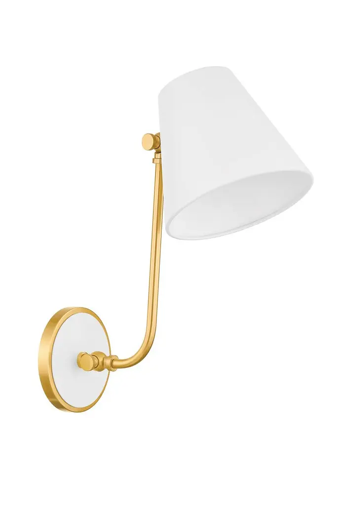 Inspired by classic design aesthetics, the Georgann Wall Sconce from Mitzi merges clean lines with subtle curves, featuring a tapered shade gracefully supported by a gently arched arm extending from a circular wall plate. Its Soft White and Aged Brass finish exudes timeless elegance, harmonizing effortlessly with diverse interior decors. Designed by Zoe Feldman, this fixture is meticulously crafted from robust steel with metal shades, promising durability and aesthetic appeal. Its bold design and damp rating seamlessly combine traditional charm with a hint of Mid-Century Modern sophistication.