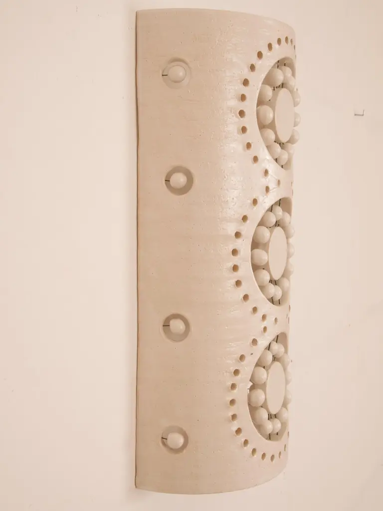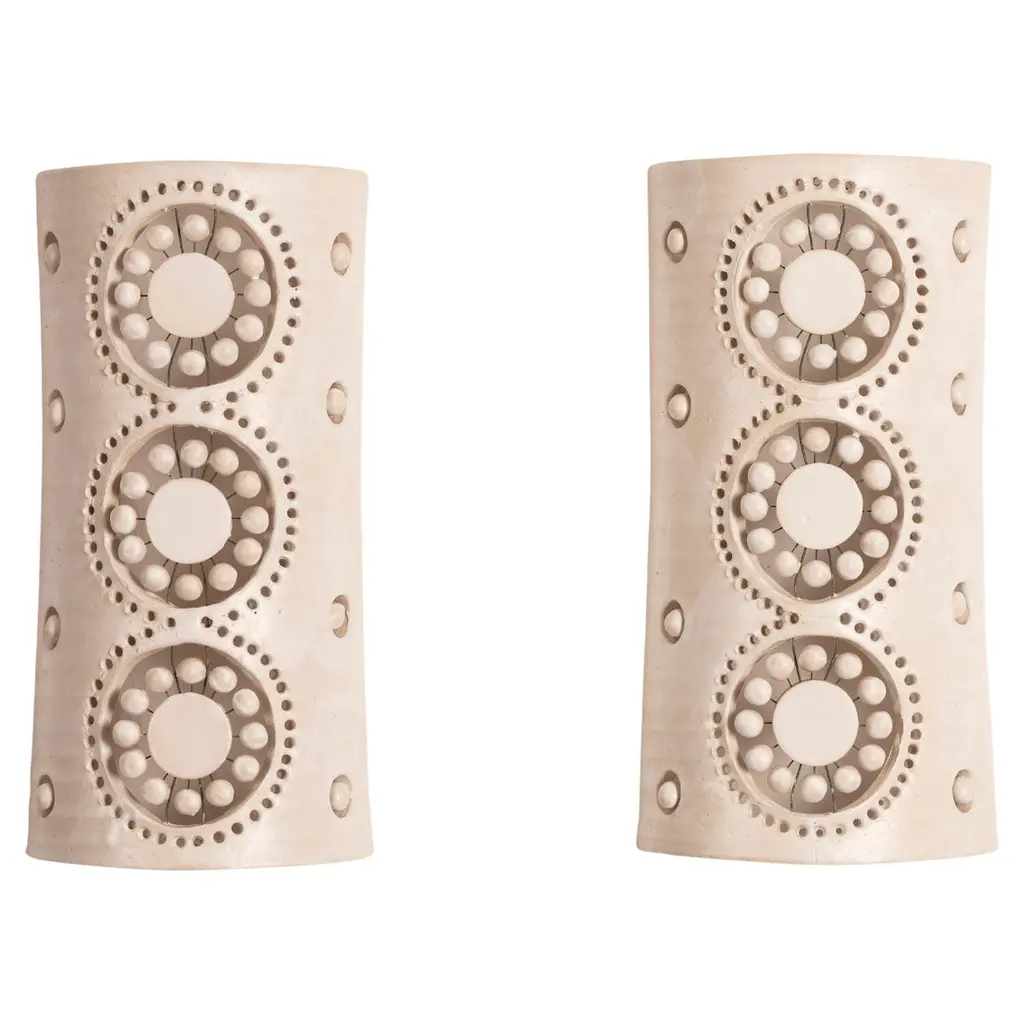 "3 flowers" sconce in white enamelled ceramic, as all the Georges Pelletier ceramics, this sconce is bringing to your space an amazing light experience when the night falls, and a stunning sculptural presence during the day. Approximate dimensions height 33 cm. Signed on the base by the artist, delivered with a "Certificate of Authenticity".Georges Pelletier (1938) is a great contemporary artist exploring the fields of ceramics and lighting since the 1950s.The star ceramist of the 60s and 70s is the last craftsman of his generation to still be hard at work… for several years these creations have been brought back into the spotlight to the point of being exhibited in the most beautiful galleries and the most beautiful interiors. in the whole world.Born in Brusels in 1938. At the tender age of 12 he enrolls in the École du Pioulier, founded by Célestin Freinet and located in Vence in the South of France. Here he learns free and modern art and discovers drawing and ceramics. During this period Pelletier starts showing solidarity and relief based on the principle of equality. This formation lends him a unique artistic identity.Georges Pelletier arrives to Paris in 1953 and continues with his drawing studies at l’Académie Charpentier meanwhile he still frequents Fernand Léger’s workshop. He enrolls the school of Métiers d’Art in 1955. Pelletier deepens into the world of ceramics during his time at Claude Pantzer’s workshop and the Potiers d’Accolay where he meets Raphael Giarusso with whom he will later share a work studio for over a year.“Drawing is the starting point of everything. I started design at the same time as ceramics at l’école Freinet. It’s an art that has allowed me to address my creations.”Pelletier opens his first studio in Paris in 1961. He is quickly signed up by Maison Bobois (now known as Roche Bobois), which spread and sold his light creations until 1973.Later on, Pelletier moves to Cannes where he continues his work on the conception of ceramic items, lamps, mirrors and other sculptures inspired in the 1960s. Besides, he also displays his work in the Consortium, Dijon Contemporary Art Centre in France.In the 1980s, he started to produce his famous TOTEMs and Suns, these pieces have allowed the rediscovery of this bold artist whose creative genius brings light to the world’s most beautiful homes.The work of Georges Pelletier is presented by Galeria Tambien, a gallery that focuses on art, ceramics and design from the 1950s to present days, it is located in the town of Santa Gertrudis de Fruitera right in the middle of Ibiza island.