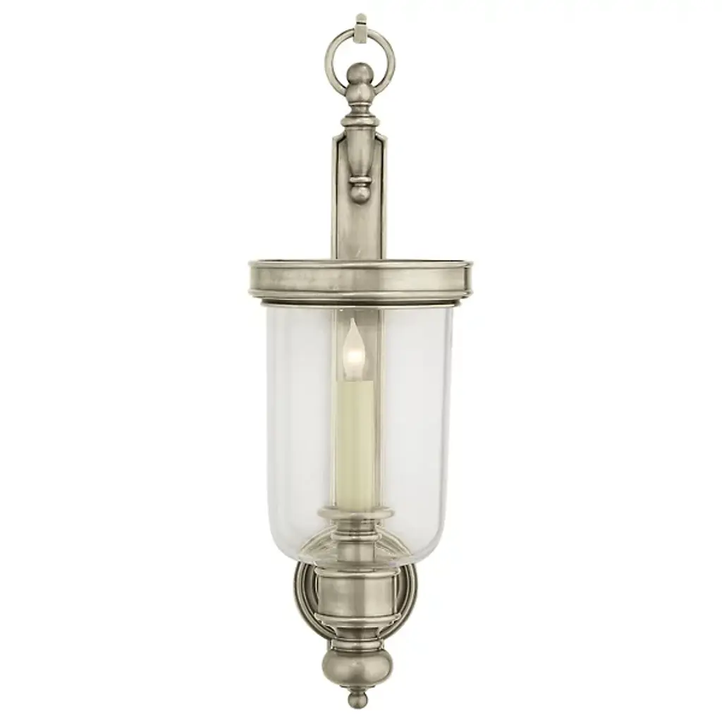 The Georgian Hurricane Wall Sconce from Visual Comfort Signature, formerly known as Visual Comfort, recalls the great attention to detail of old-world luminaires with an elegant, tiered design. While heavily accented, it sports a silhouette so clean that modern spaces can appreciate it. The sconce slides into a tight column or entryway with a vertical backplate topped with traditional ornamentation. Rippling metal hardware in front pairs with a crowning ring to hold a beautiful clear glass shade. A milky lamp holder and candelabra bulb inside mimic a wax candle in silhouette and with a spirited, ambient glow.