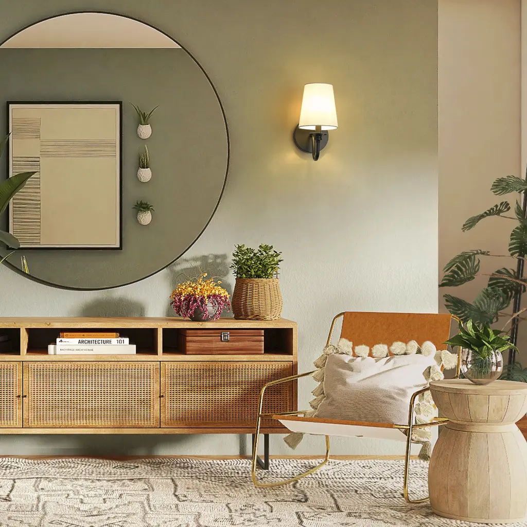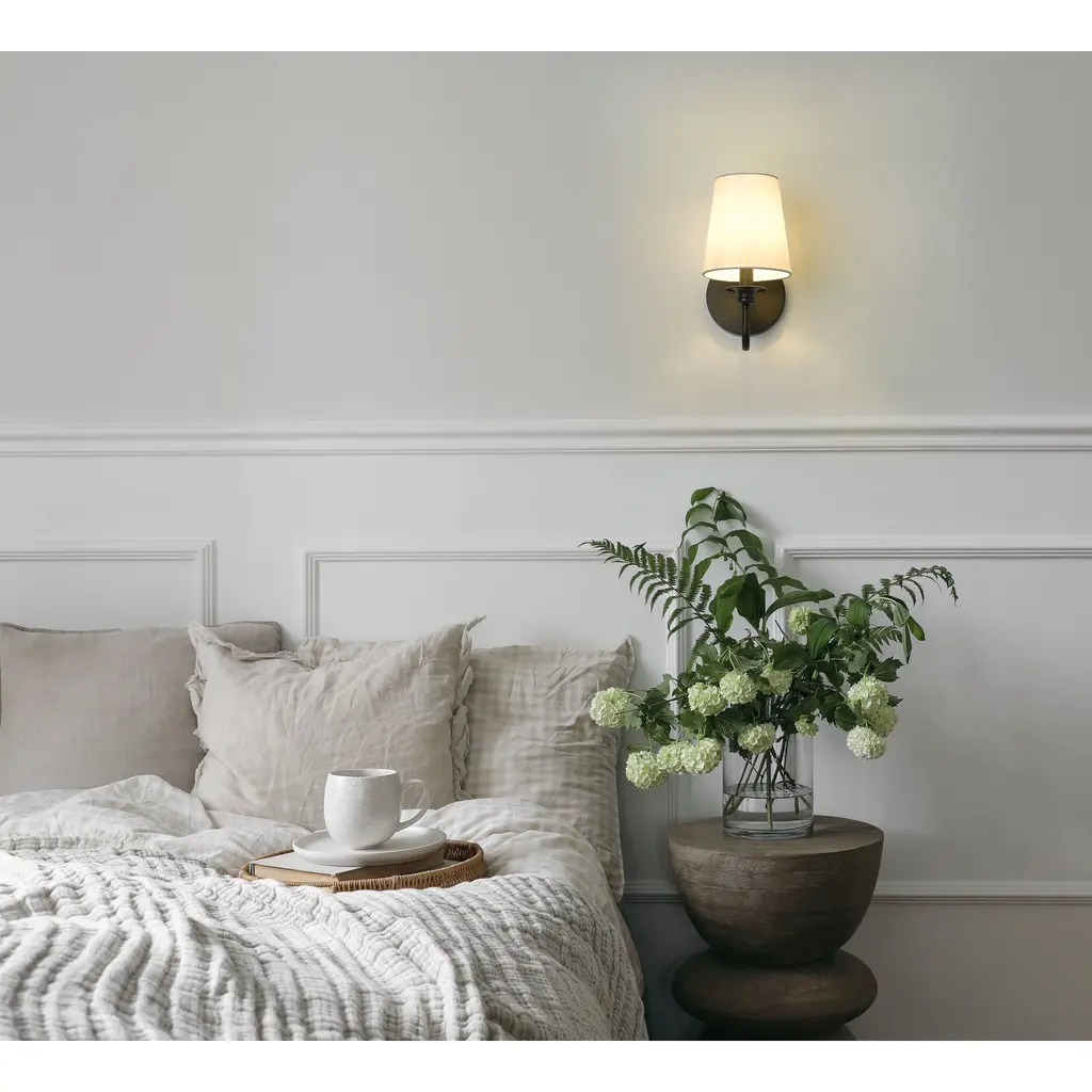 Embrace timeless design with the simple curves of a modern one-light wall sconce. An opaque white shade delivers inviting ambiance in an entryway or living room, while a stately matte black finish adds distinction to a round wall plate and classic curved arm.
