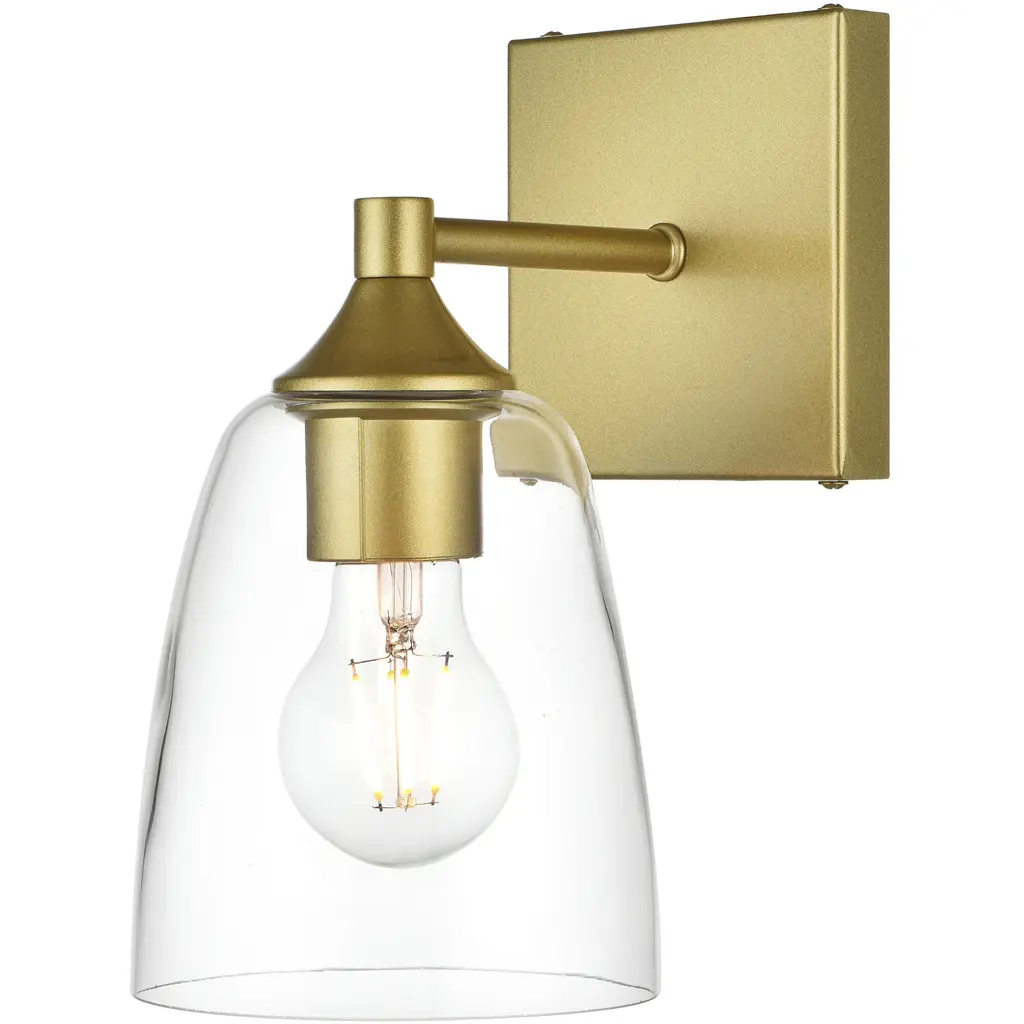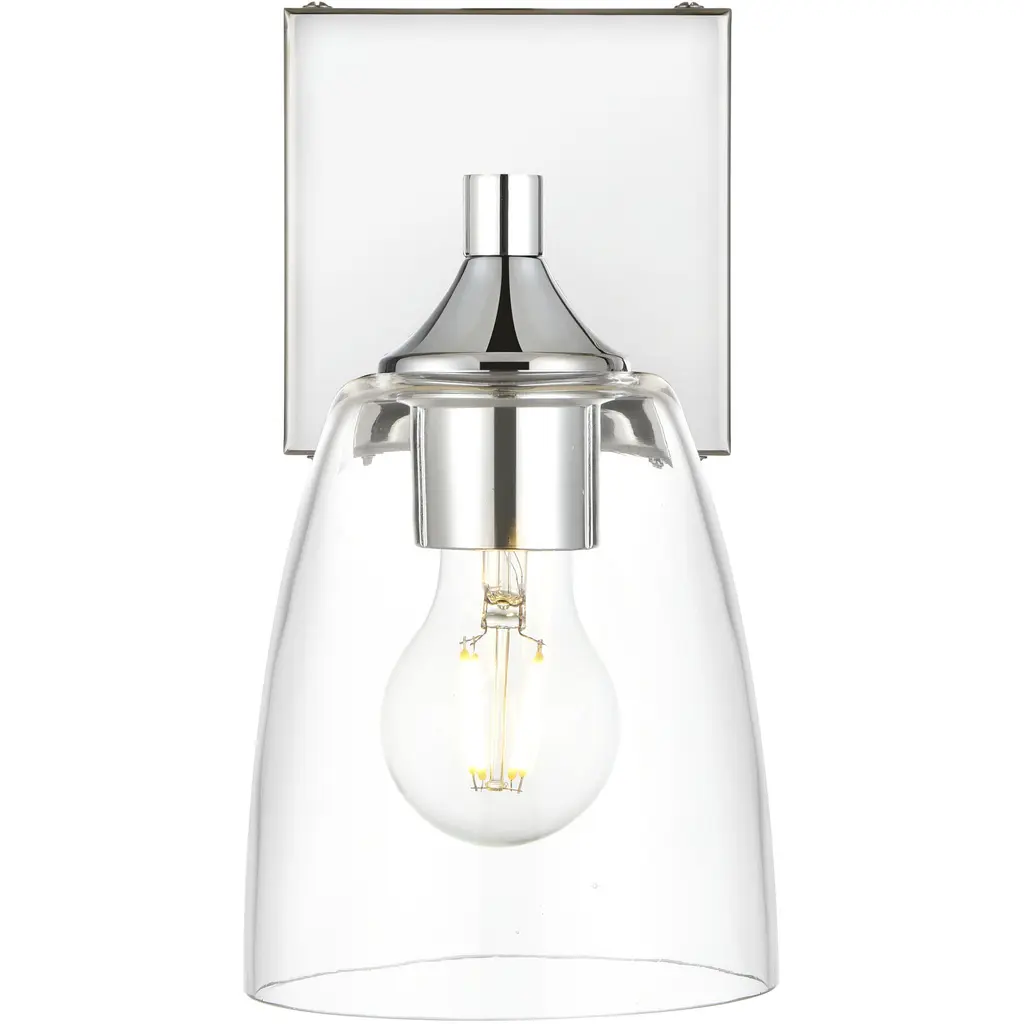 Defined by a sleek metal arm extends to suspend the clear tapered glass shade. A contemporary stunner, it shows off the straight line details from the backplate and the streamline thick metal arm. Compatible with dimmers, so you'll have the right amount of light in any given time of the day. Completely versatile, you can place this wall light as an uplight or downlight. Rated for use in damp locations, this will work perfectly over a vanity in your bathroom.