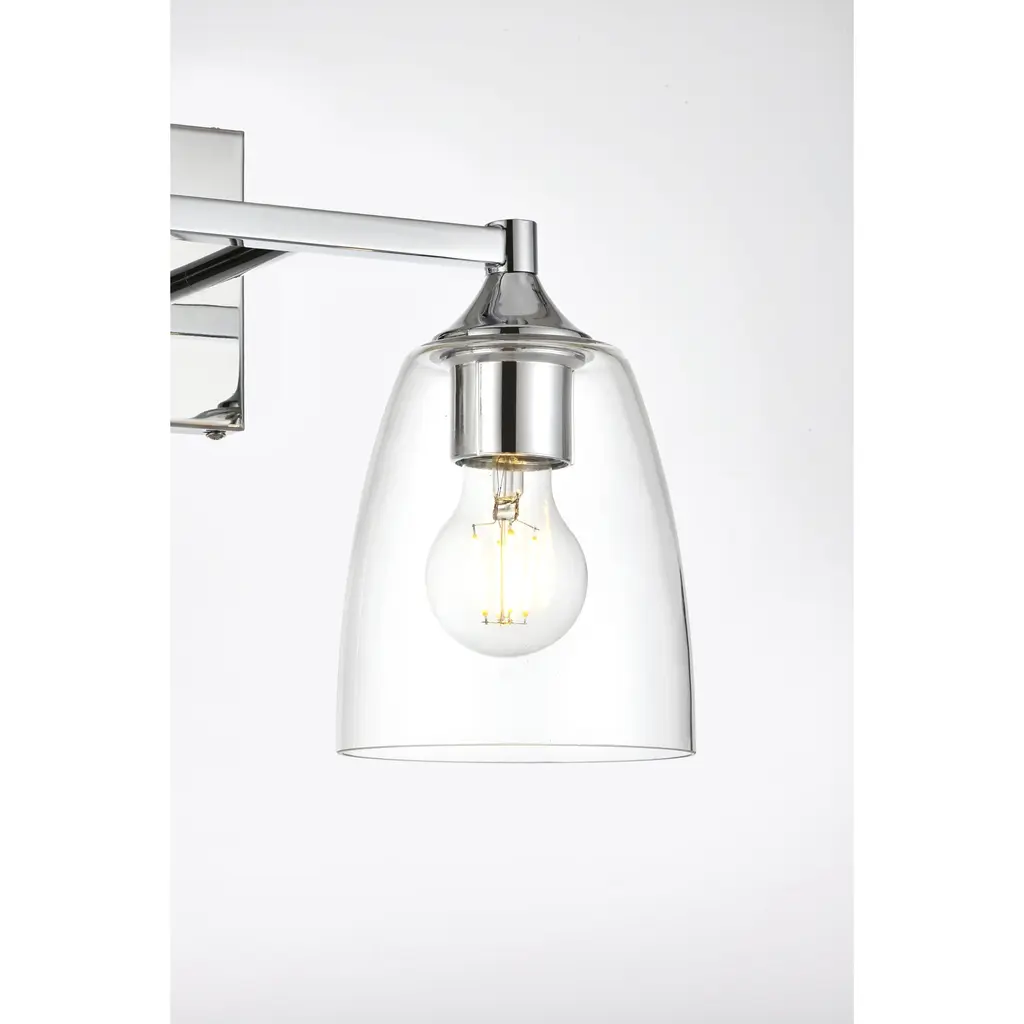 Defined by a sleek metal arm extends to suspend the clear tapered glass shade. A contemporary stunner, it shows off the straight line details from the backplate and the streamline thick metal arm. Compatible with dimmers, so you'll have the right amount of light in any given time of the day. Completely versatile, you can place this wall light as an uplight or downlight. Rated for use in damp locations, this will work perfectly over a vanity in your bathroom.