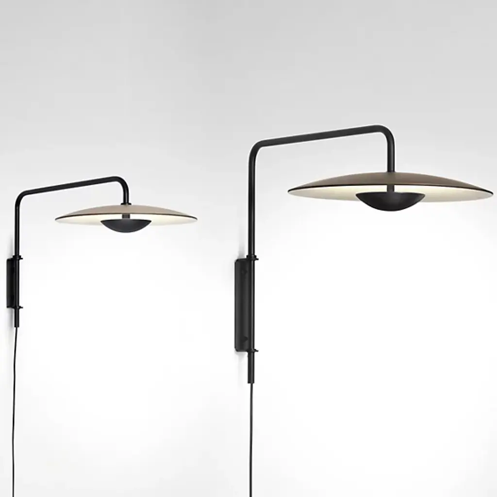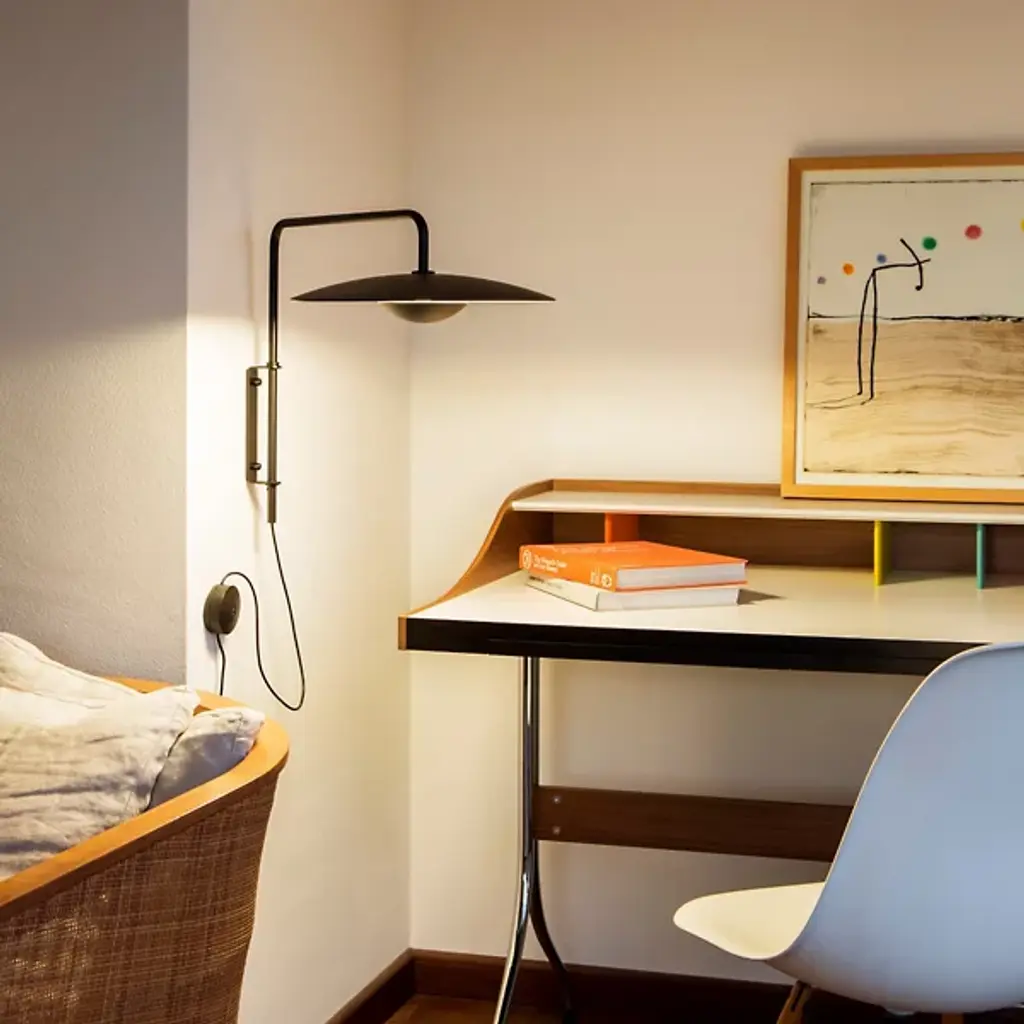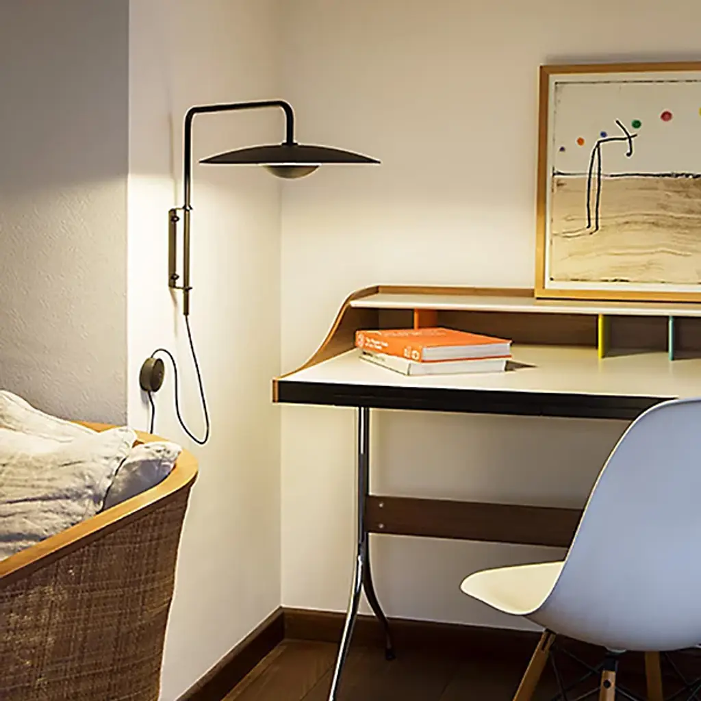 Inspired by the cymbals of famous drummer, Ginger Baker, the Marset Ginger LED Wall Lamp is an exceptionally slender conductor of light. The high-pressure shaping of wood and paper yields an ultra-thin shade, brilliantly amplifying the LED light outward with a white interior. The aluminum structure holds the warm LED module which is outfitted with special optics to open up the light beam. In an effort to dissipate the LED light temperature, designer Joan Gaspar decided to thicken the aluminum instead of carving out grooves in the metal holder. Perched on an adjustable metal arm, the user is able to swing the lamp from right to left, making the Ginger an ideal bedside or tabletop companion.