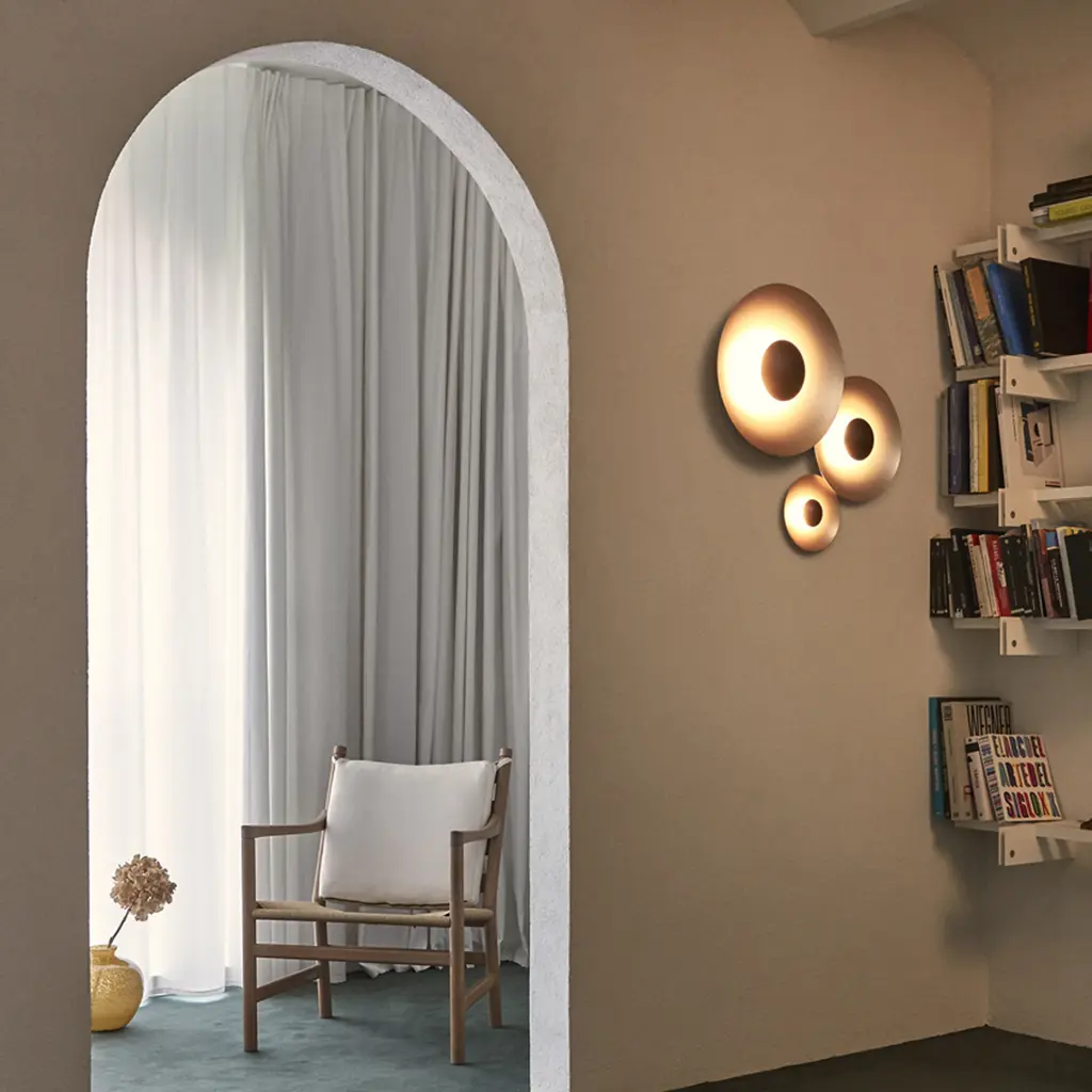 A complete illumination. The Ginger LED Wall Sconce by Marset infuses a sculptural and contemporary allure to living spaces, bedrooms, or hallways. Wood, paper, and resin are pressed together under high pressure to create a circular structure with a curved center. A metal cup at the front conceals an integrated LED light source to deliver warm, glare-free light that is reflected on the laminated structure to create an eye-catching lighting experience.