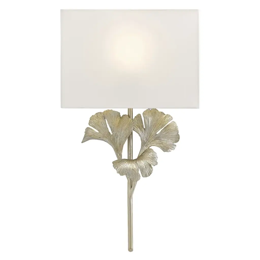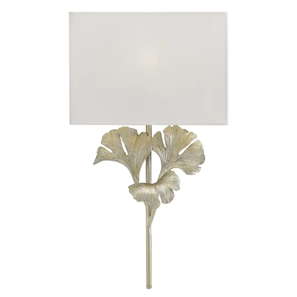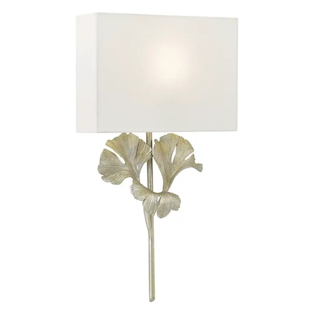 Bring a perennial presence to your home décor with the Gingko Rectangular Wall Sconce from Currey & Company. This botanical-inspired fixture is crafted with a wrought iron body that takes the form of its namesake. Its blooming motif fans out from a slender vertical stem that extends from below a rectangular shade made of off-white shantung. Its incandescent lamping is filtered through the shade to create a lively, inviting glow.