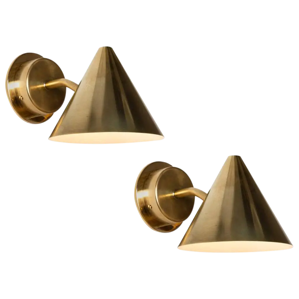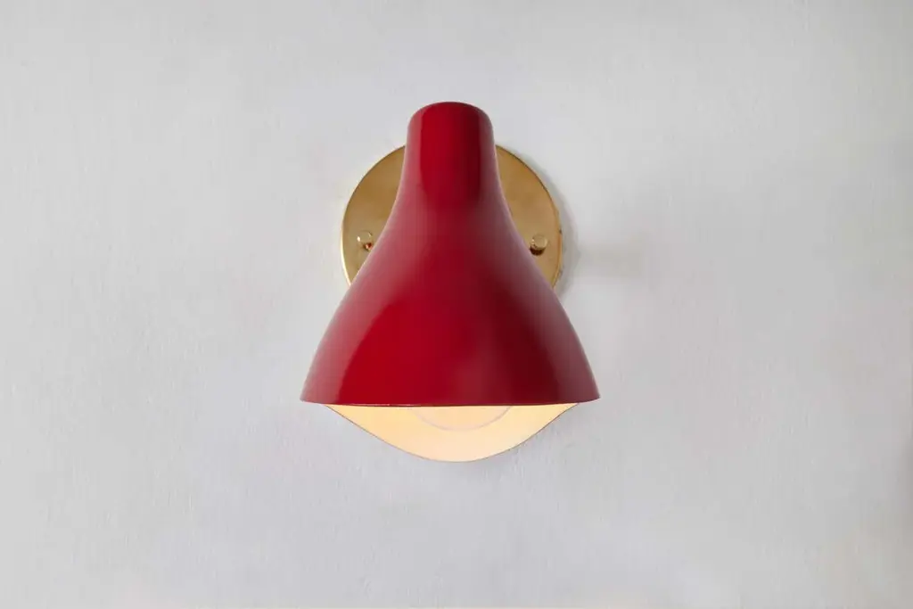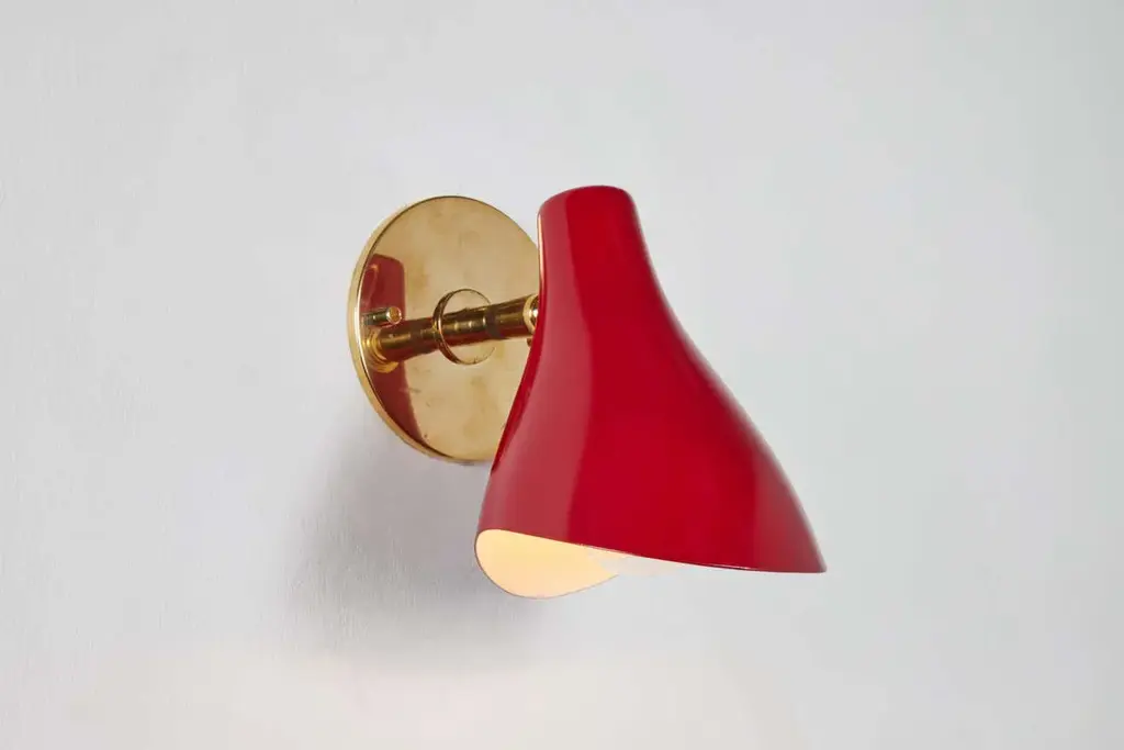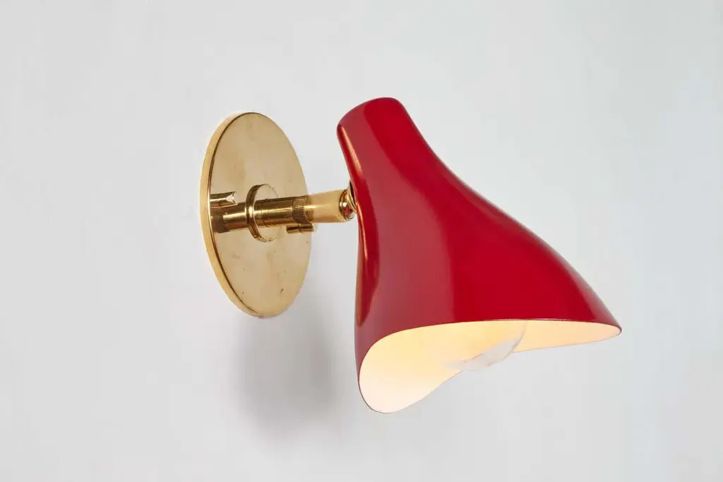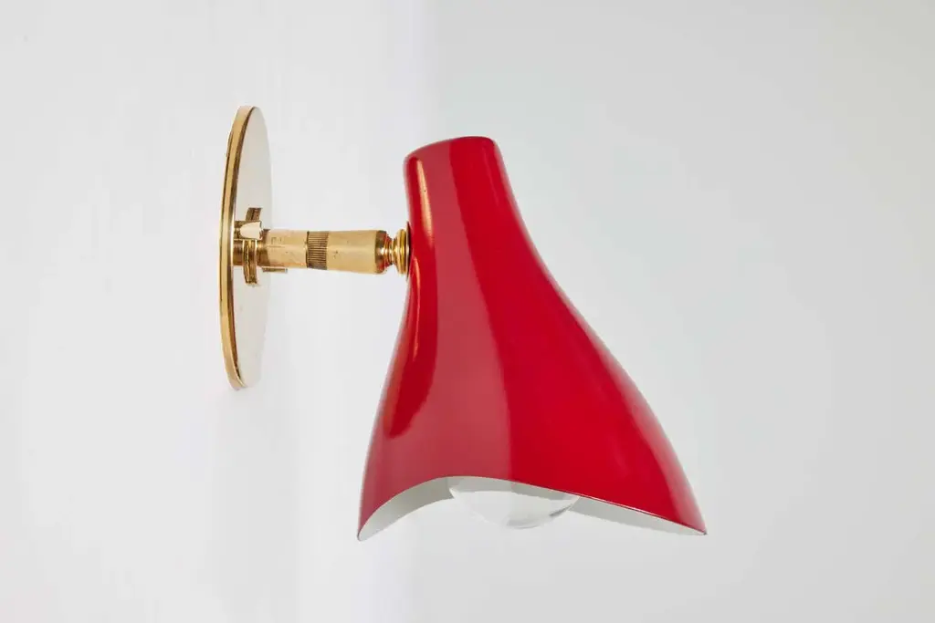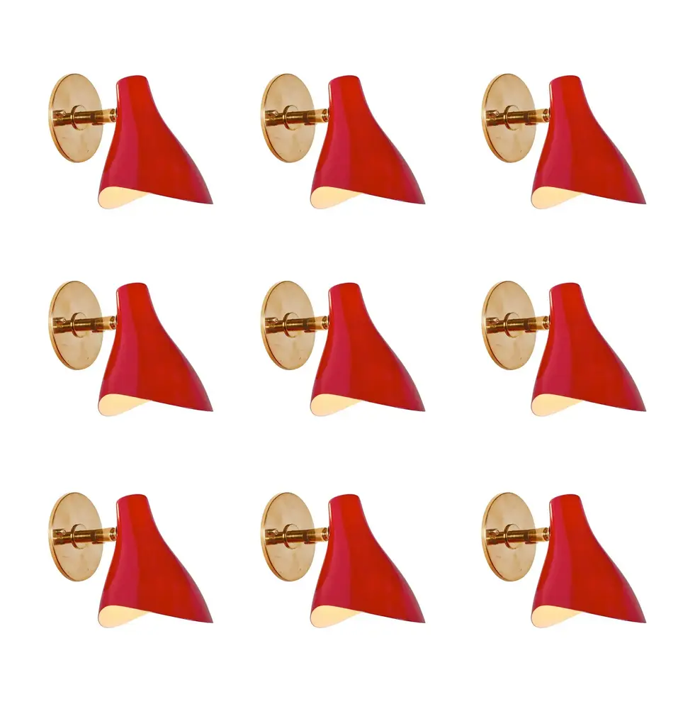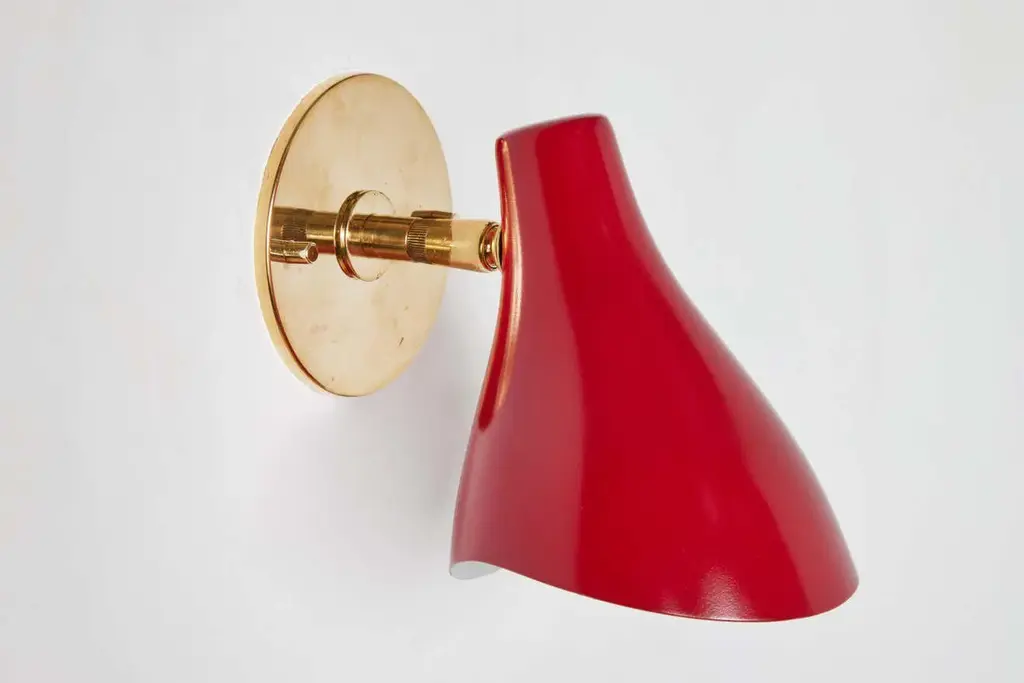 Pair of Gino Sarfatti Model #10 sconces in red for Arteluce. Executed in red painted aluminum and custom fabricated period styled brass backplates designed to mount over a standard American j-box for hardwiring. Ball jointed arm allows flexible shade adjustments and multiple configurations. Originally designed between 1937-1941, the simplicity of Sarfatti's iconic Model #10 "detto Calla" or "Lily" shade design with its sculptural shaping of the materials make for an incredibly refined example of the lighting master's incomparable style. Salvaged from a midcentury building in Italy slated for demolition, these were originally configured in multi-shade half rings that were mounted around pillars. The original paint was beyond saving on all but a handful of lamps, which we have available in the original green in a separate listing. Professionally repainted black, green, and white versions also available. Price is for the pair. 8 pairs available in red. Ref: Romanelli & Severi "Gino Sarfatti: 1938-1973, selected works" p. p. 386 + various configurations pp. 69 & 151. Arteluce was one of the most innovative lighting design companies in Italy during the midcentury era. Their designs have been long sought after by collectors in the know. Not UL listed. Wired for US electrical. Custom period styled brass back plates for mounting over a standard American j-box. Accommodates a single US 40W candelabra bulb. Some minor scuffs and dings noted only for accuracy.