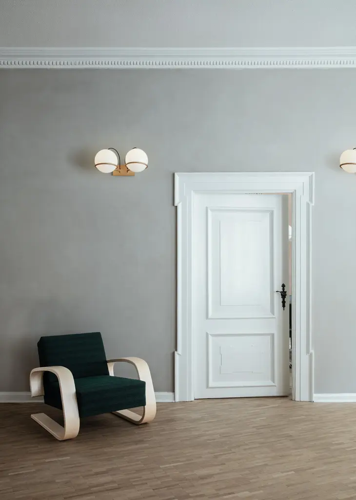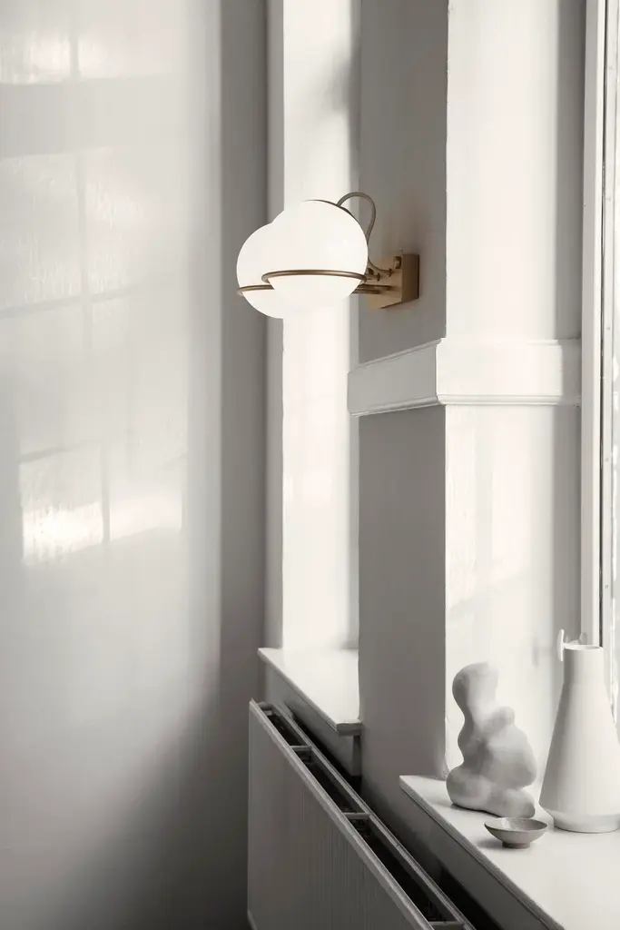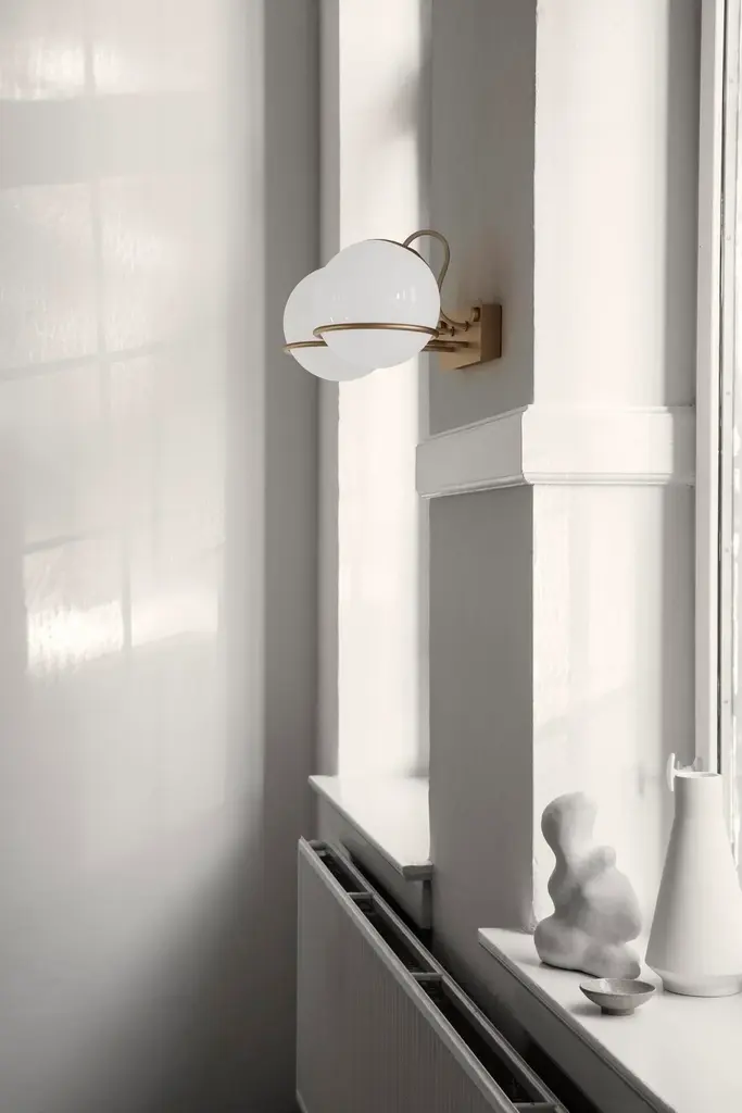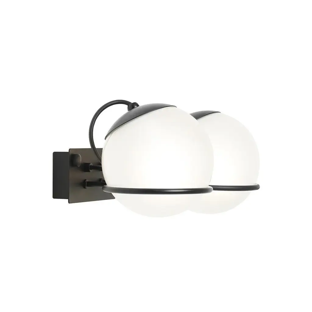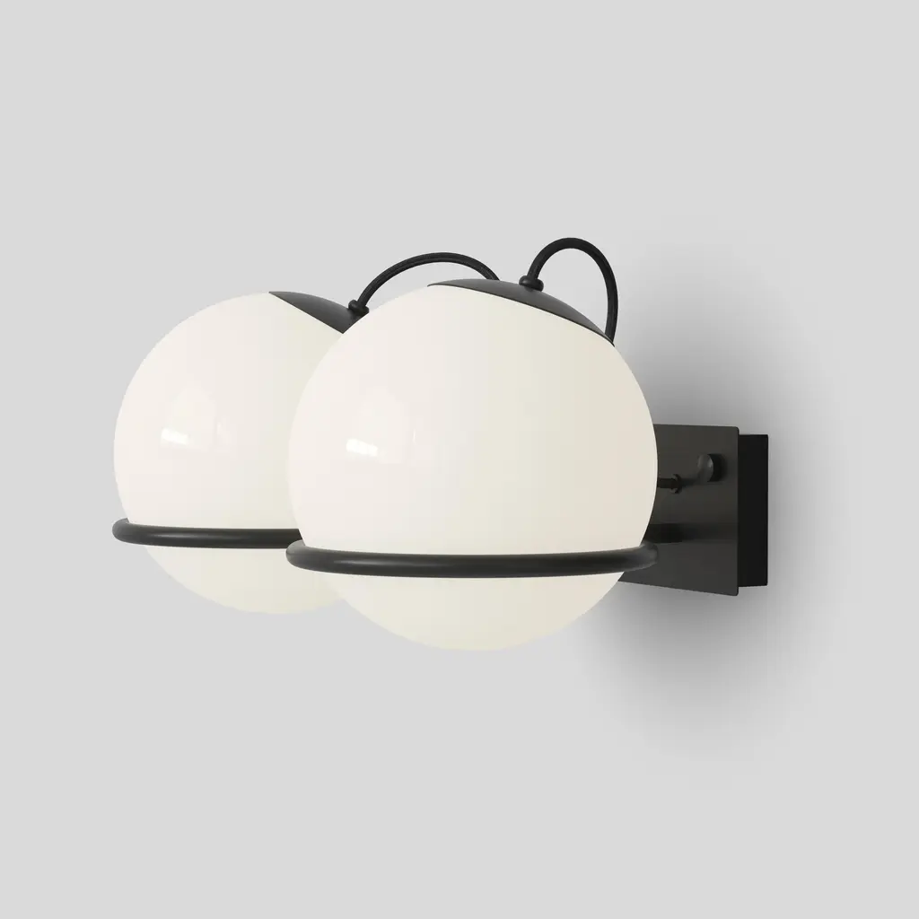 Gino Sarfatti Model 238/2 wall lamp in black. Designed in 1959, this is an authorized 2018 Astep/Flos re-edition by Alessandro Sarfatti, grandson of Gino Sarfatti, who applies his grandfather's scrupulous attention to detail and materials to offer a tightly curated selection of iconic lighting originally produced by Arteluce. Executed in a pair of opaline glass spheres held in place by a sculptural black-painted metal structure. Professionally modified for US electrical. Unused in original factory packaging. Throughout his life, the sky served as a muse for lighting master Gino Sarfatti. He was fascinated by the perfect light emitted by the Moon, and one of Gino Sarfatti’s most brilliant designs is inspired by the natural poetry of the luminous satellite. The Le Sfere collection is the largest product family by Gino Sarfatti with models that have developed over time, from the first single sphere, Model 237, to the iconic twenty-four-sphere chandelier. All created from the same fundamental principle: A beautiful interpretation of the perfect luminous sphere. Price is per item. This listing is for the black finish. Also available in champagne as well as in single and multi-globe configurations. For time-sensitive orders, please inquire prior to purchasing. Made to order. Not UL listed, but recommended UL listing possible from authorized 3rd party vendor upon request. Please note that these are unused new in box with professionally modified European wiring for US compatibility, but not under factory warranty. European backplate dimensions are 7.5 inches wide x 3.5 inches high.