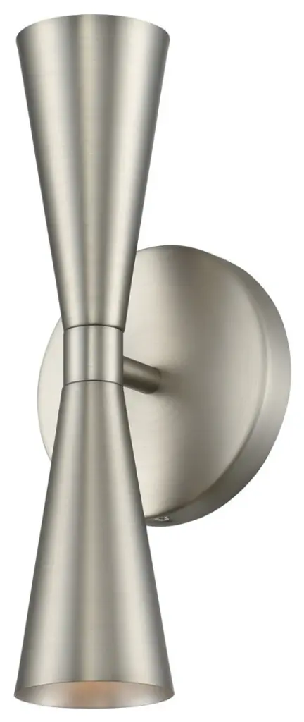 Certain shapes are harbingers of retro style, and this is certainly the case with the Gino Wall Sconce. This mid-century modern fixture has two bulbs, one for up-light and one for downlight, within its conjoined tapered cones. The exterior of the spun-metal shades and wall plate have been treated to a dark gray finish, while the interior of the shades has been painted white. The sconce is one of several Gino products we offer.