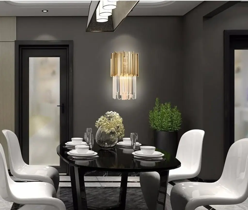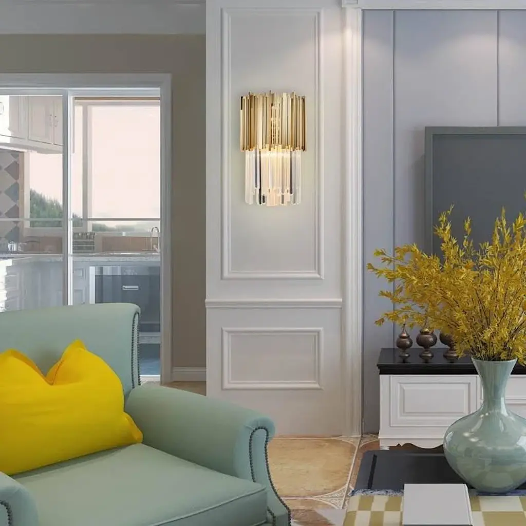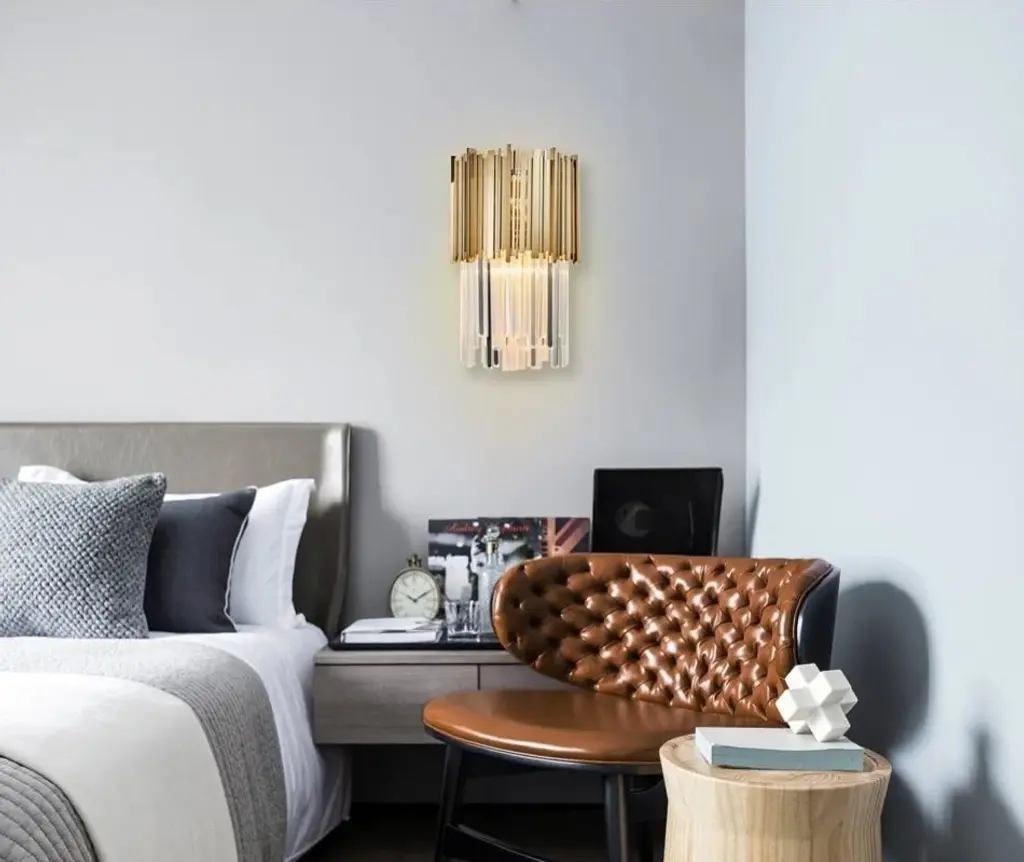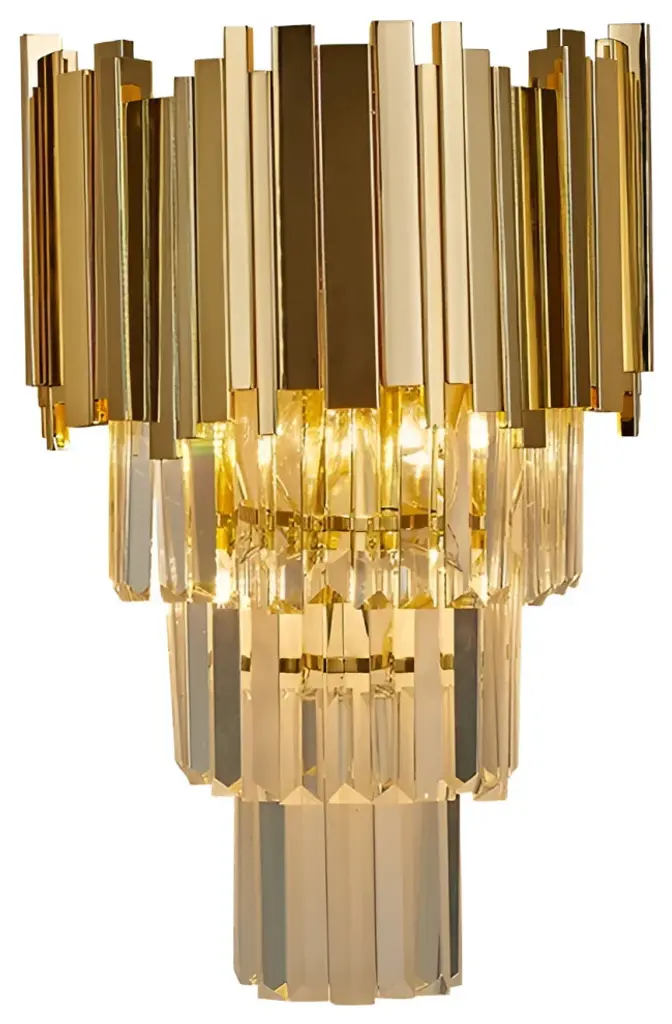 Gio Crystal Wall Sconce emits the purest form of its illumination into your interior space. Its raw elegance is created through the brilliance of raw crystal and noble materials. Like a bolt of lightning, the Gio is a stunner. The crystal clarity is simply illuminated. Make a statement. Let there be light.What is K9 Crystal?K9 is an Optical Borosilicate Crown Crystal (Optically Clear) with low inclusions and imperfections ideal for use in lenses and prisms, optics, and decorative crystal lighting. It has good physical properties and can be polished similar to lead crystal, weighing approximately 15 percent less than full leaded crystal having a lead content of only 10 percent. K9 crystal offers a high refractive index and high clarity making it a good option for the manufacture of high-end chandeliers offering both durability and excellent quality.Material: Stainless Steel, K9 CrystalLight Source: E14 LED Bulbs (Included)Size: Width 8" Height 18"Finish: Polished, ElectroplatedVoltage: 110-240VWarranty: 2 YearsApplication: Living Room, Dining Room, Bedroom, Hallway