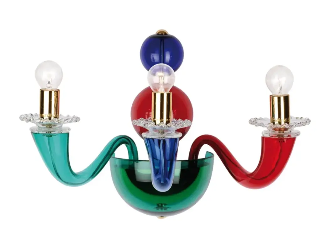 Gio Ponti 99.80 is a wall lamp in blown glass and handmade by the master in the furnace. A work of art. More than that, a myth. Gio Ponti 99.80 owes its undisputed modernity and originality to the boundless creativity of its creator, Gio Ponti. Its uniqueness lies in its multicolored appearance: each arm flaunts a different color. Gio Ponti 99.80 is available as a chandelier and a wall light.Colors:MulticoloredLight source:99.80.02.02 - 2 x max 8W LED E1499.80.02.03 - 3 x max 8W LED E14Designed by Gio Ponti, it is one of the most innovative chandeliers made in Murano. Coloured transparencies, sober and refined decorations, imitated and copied, it is unrivalled since 1946.
