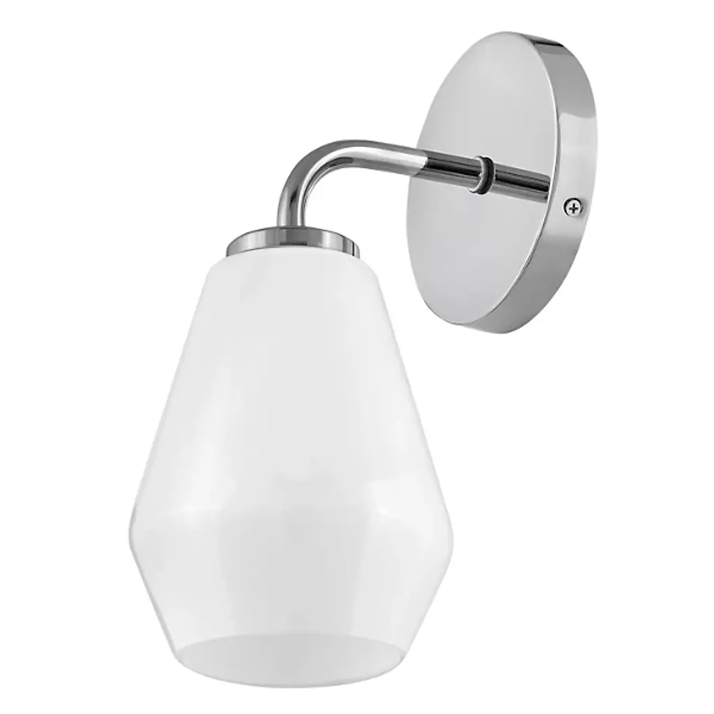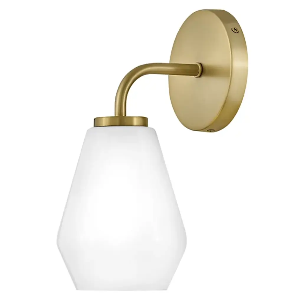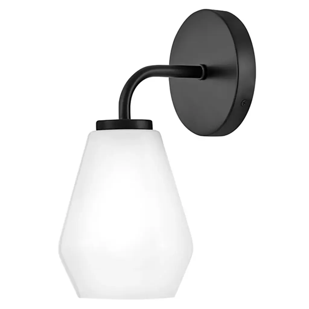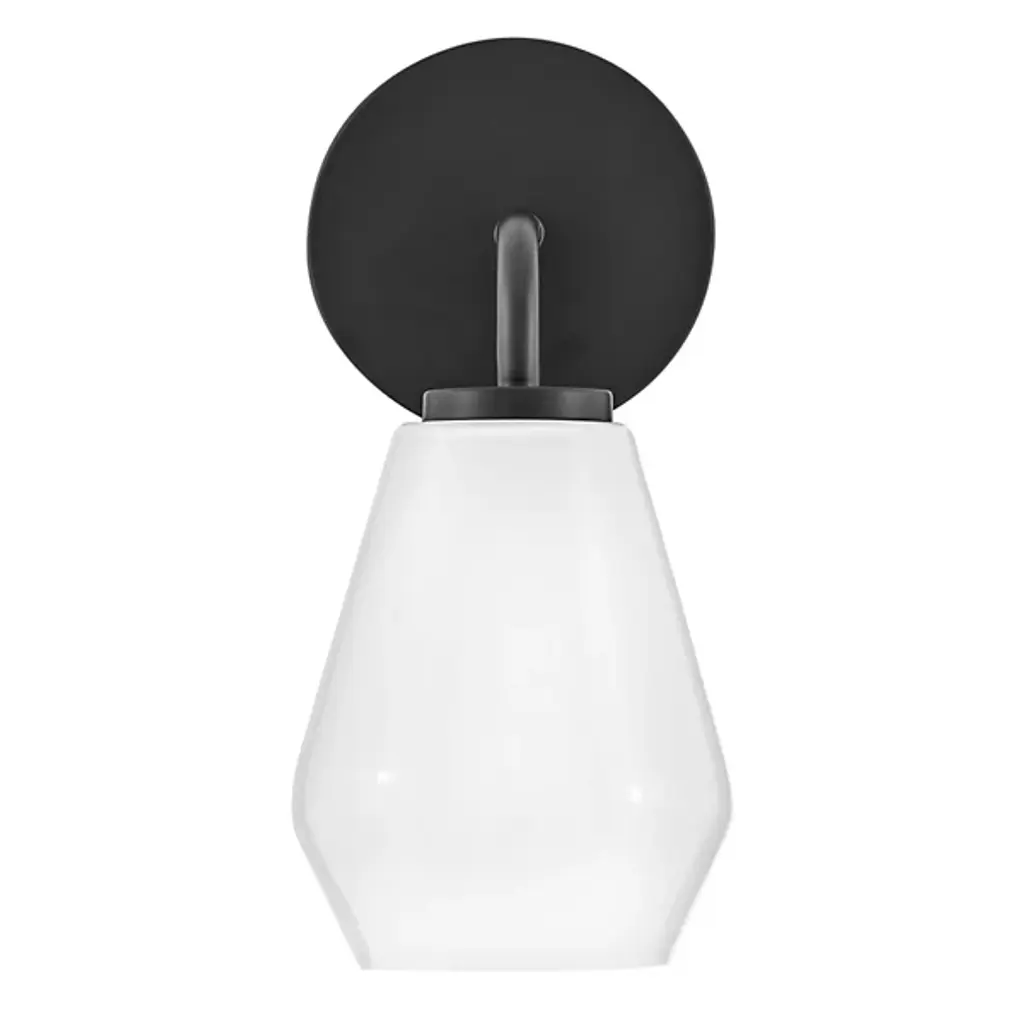 The Gio Wall Sconce from Lark is crafted from durable steel. This sloped-ceiling adaptable wall sconce features a design that allows for mounting either facing up or down, providing flexibility in tailoring the lighting to your preferences. The shade of cased opal glass adds a mid-century modern touch while emitting an inviting glow. Supported by a curved arm secured by a round backplate at your wall, Gio can be dimmed when you pair it with a separately sold ELV dimmer.