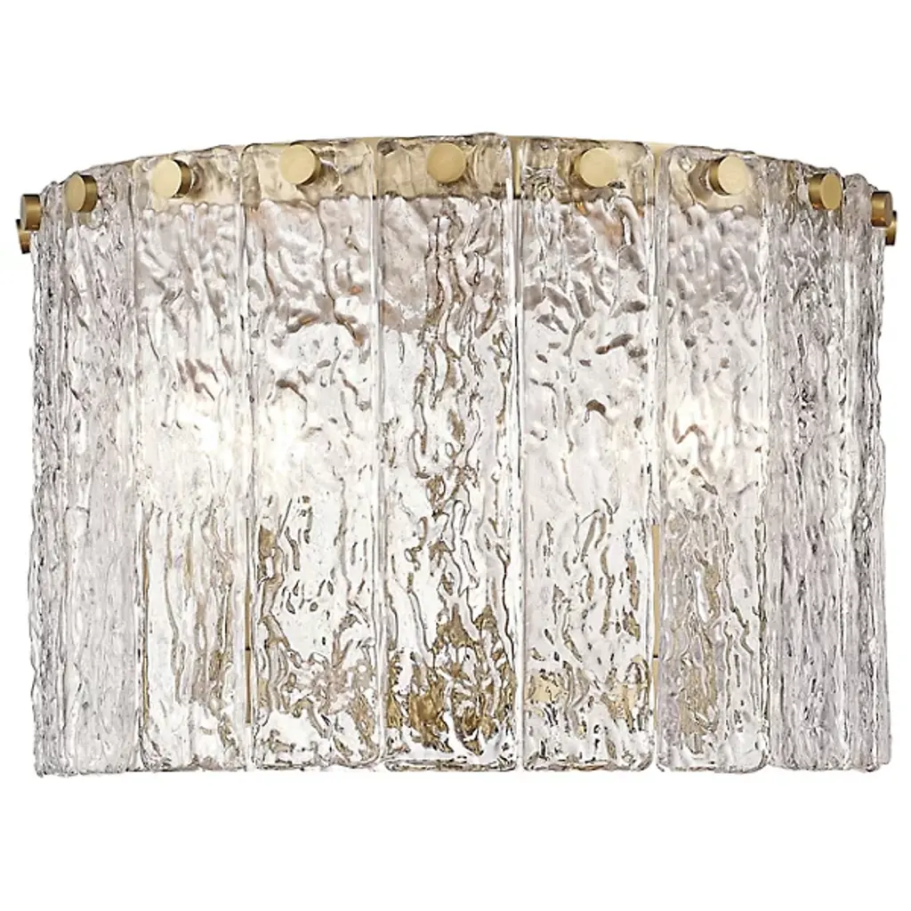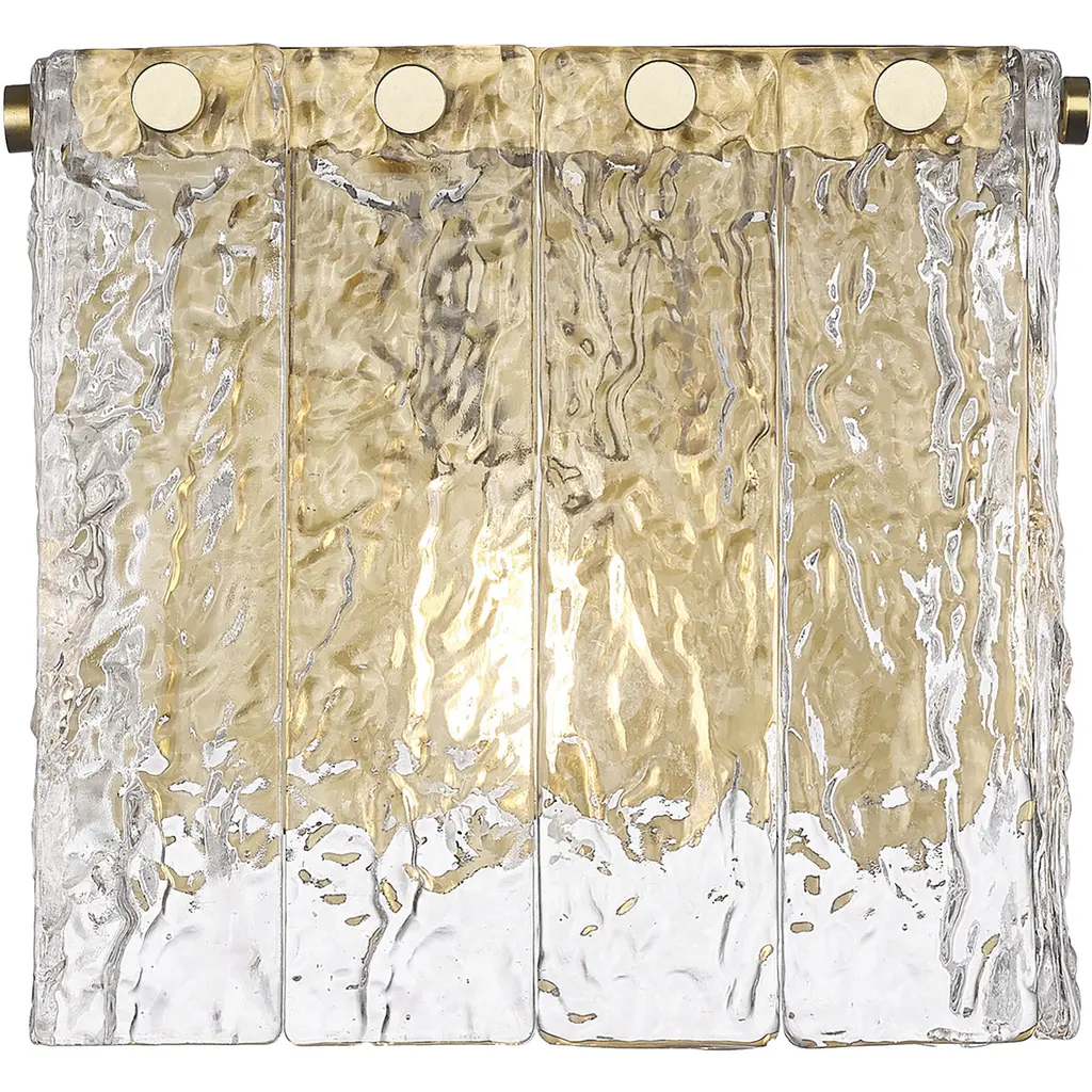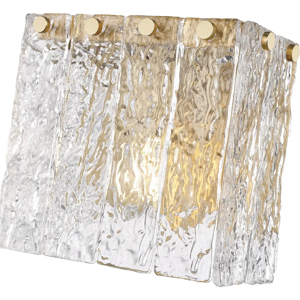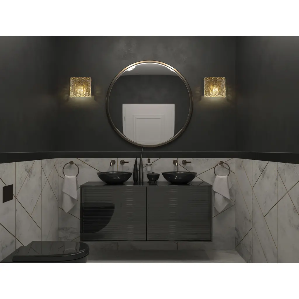 The warmth of a modern gold finish steel framework is the perfect enhancement for this modern one-light wall sconce. Icy panels of textured clear glass create impeccable texture and depth, perfect for complementing a cool, sleek vanity, hall, or kitchen.