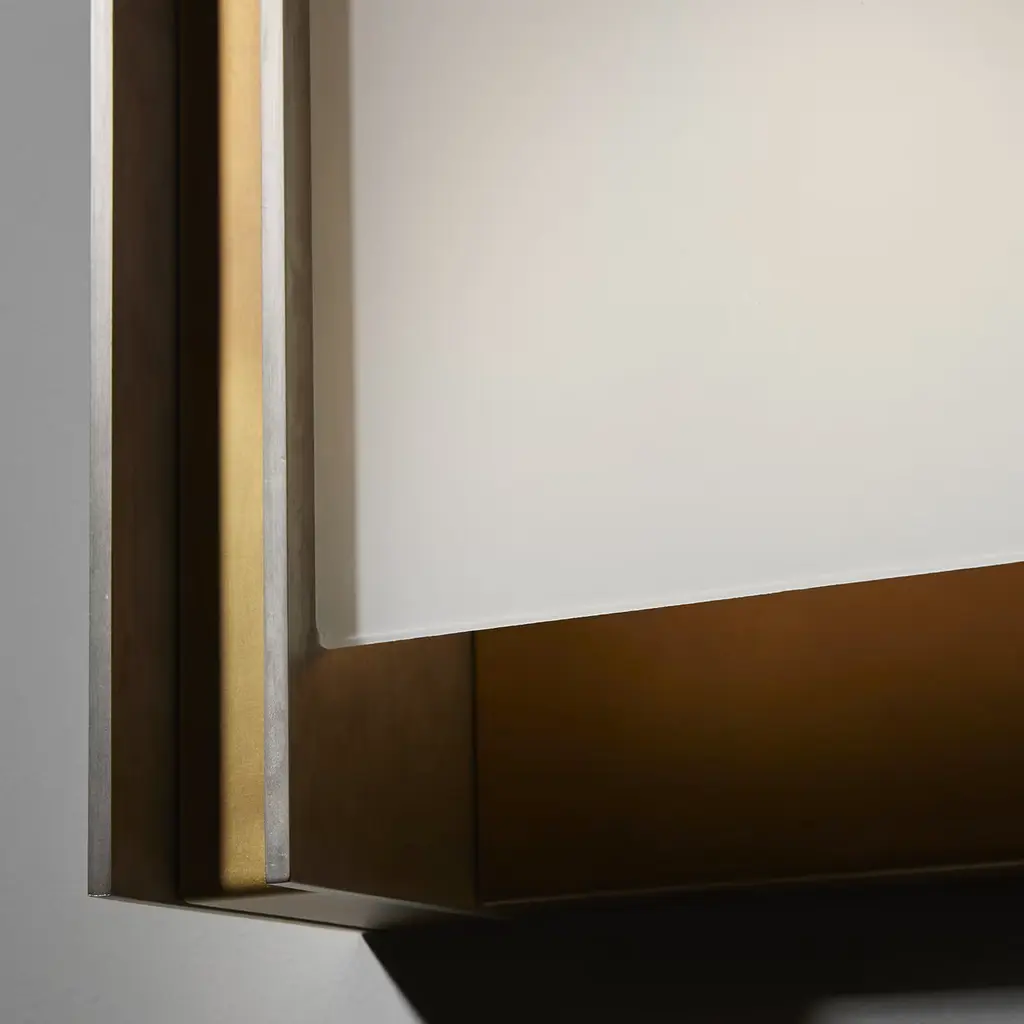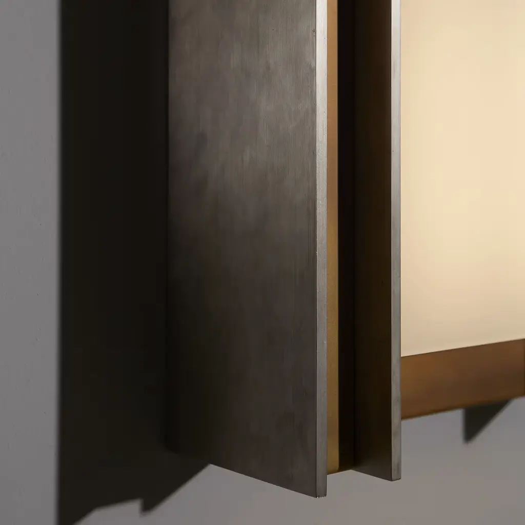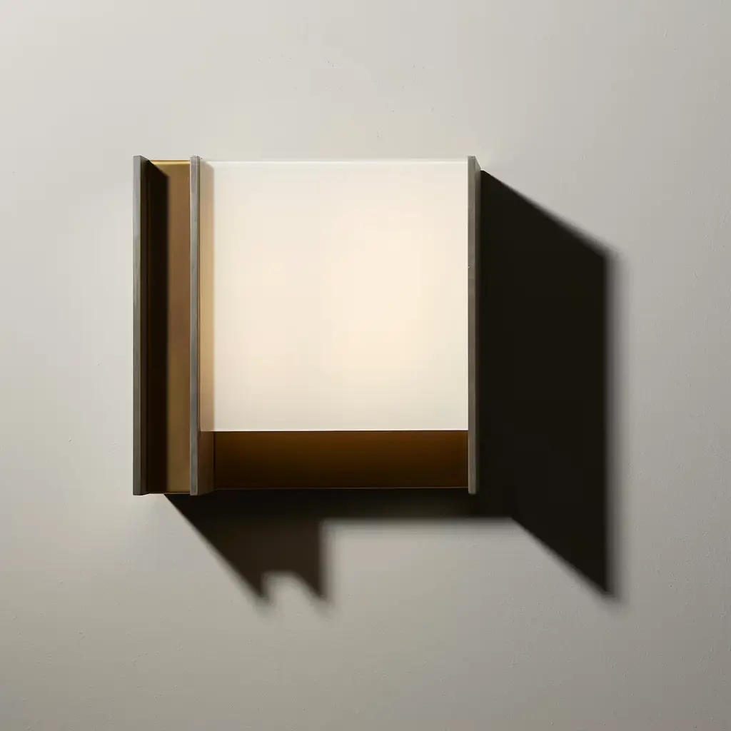 Brimming with quiet sophistication, this wall lamp emits a diffused light from an impeccable white-hued glass shade enclosed in a delabré brass and pewter structure, bathing a modern interior with warm light. The sophisticated shade houses a plate 36 LED max 9W s 18V, 900lm and 2700°K. This exquisite piece is also available in burnished natural and dark brass, please ask the Concierge for details. Contract and commercial certifications available upon request.