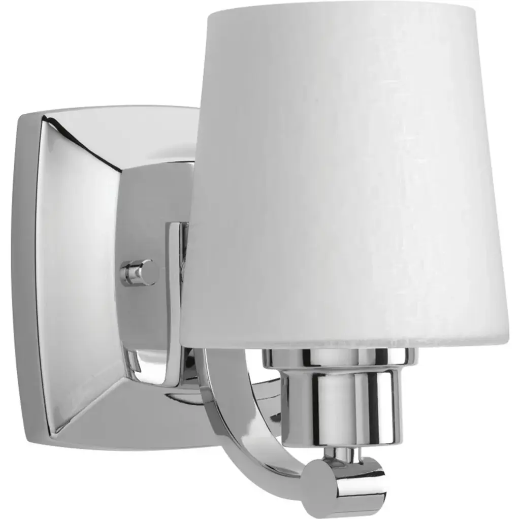 A sophisticated bath and vanity collection. Glance''s stout frame and etched linen glass shades complement a variety of contemporary design schemes. Chrome and Antique Bronze finishes available for the one- through four-light fixtures. Features: Sophisticated designFeatures a stout frameEtched linen glass shadesLighting Specifications: One medium base lamp, 100w max.Bulbs Included : NoLamp Type Basic: IncandescentLamp Type Actual: E26Listed: cULusListed Location: DampSocket Base: E26Product Specifications: Warranty: 1 year warrantyGlass: Etched White LinenGlass Shape: ShadeFinish Color: Polished ChromeFinish Type: PlatedSize: 5-3/8" W., 7-1/4" ht. Extends 7-1/4". H/CTR 3-5/8".Wire Length: 6"Chain Stem and CTC Mounts Included: No
