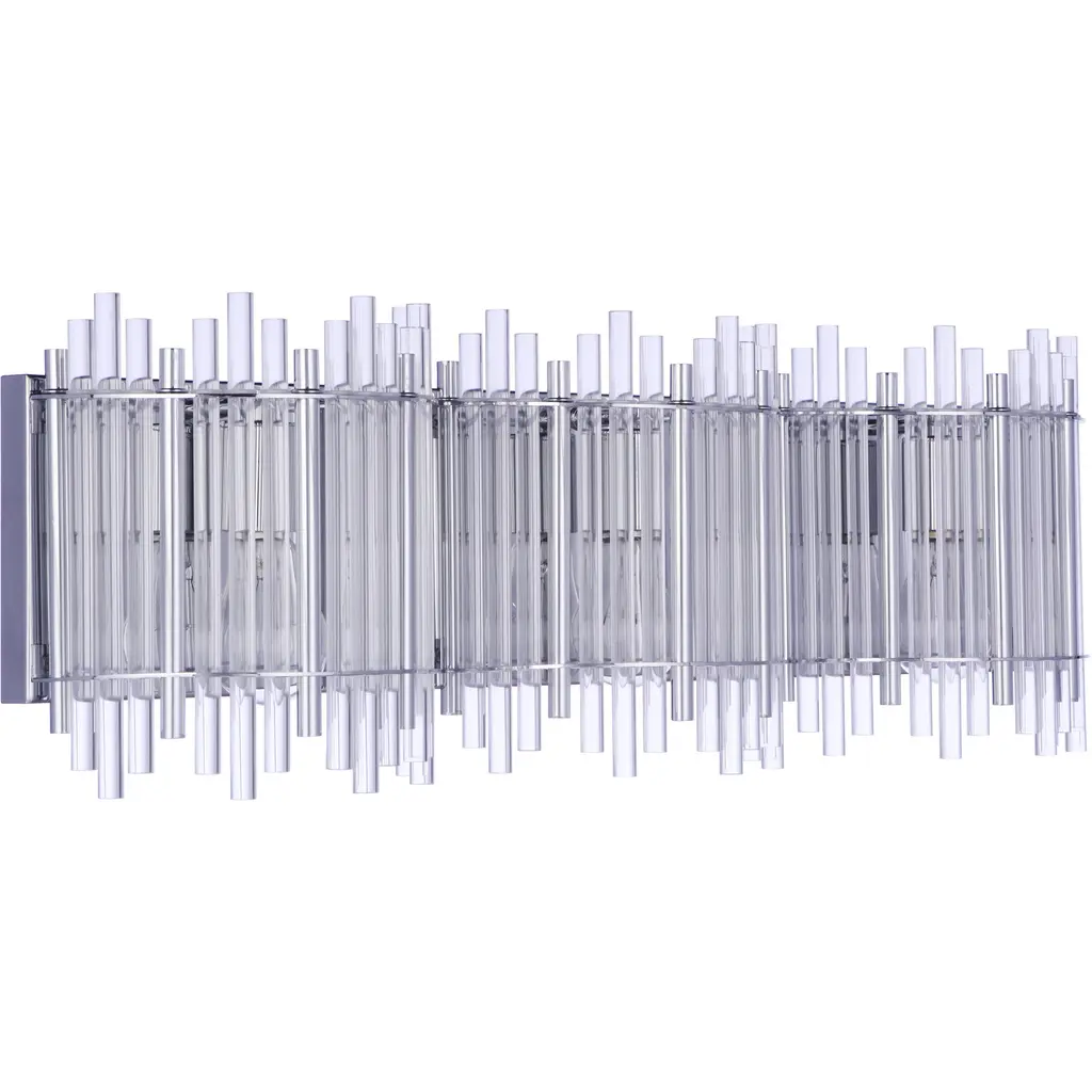 A regiment of ribbed cylinders, linked together at the top, encircle the central light sources to soften and diffuse, unveiling a stately, transitional allure that lends charm to living, entry and dining spaces.