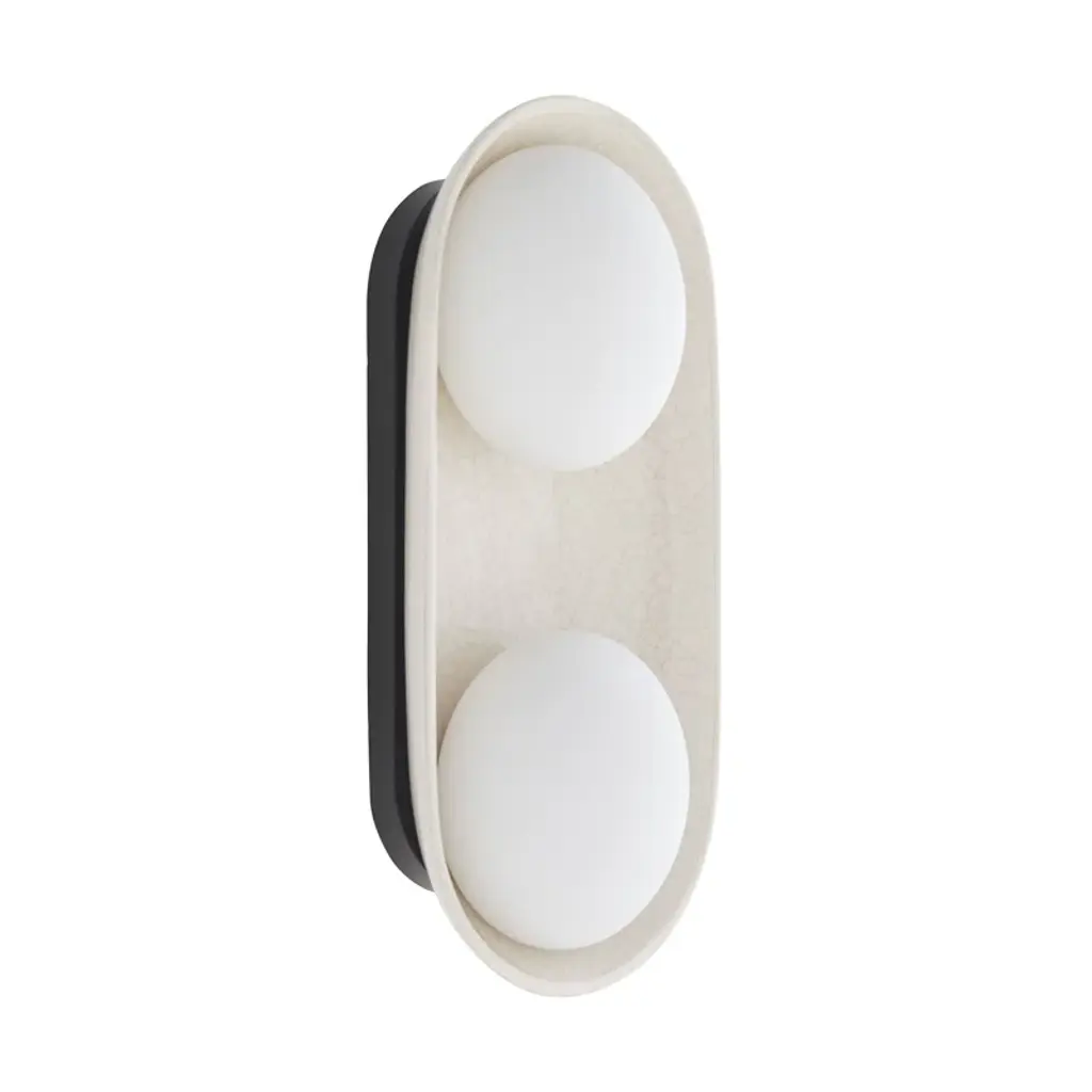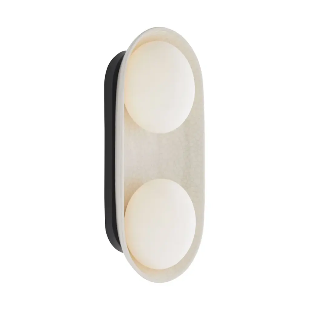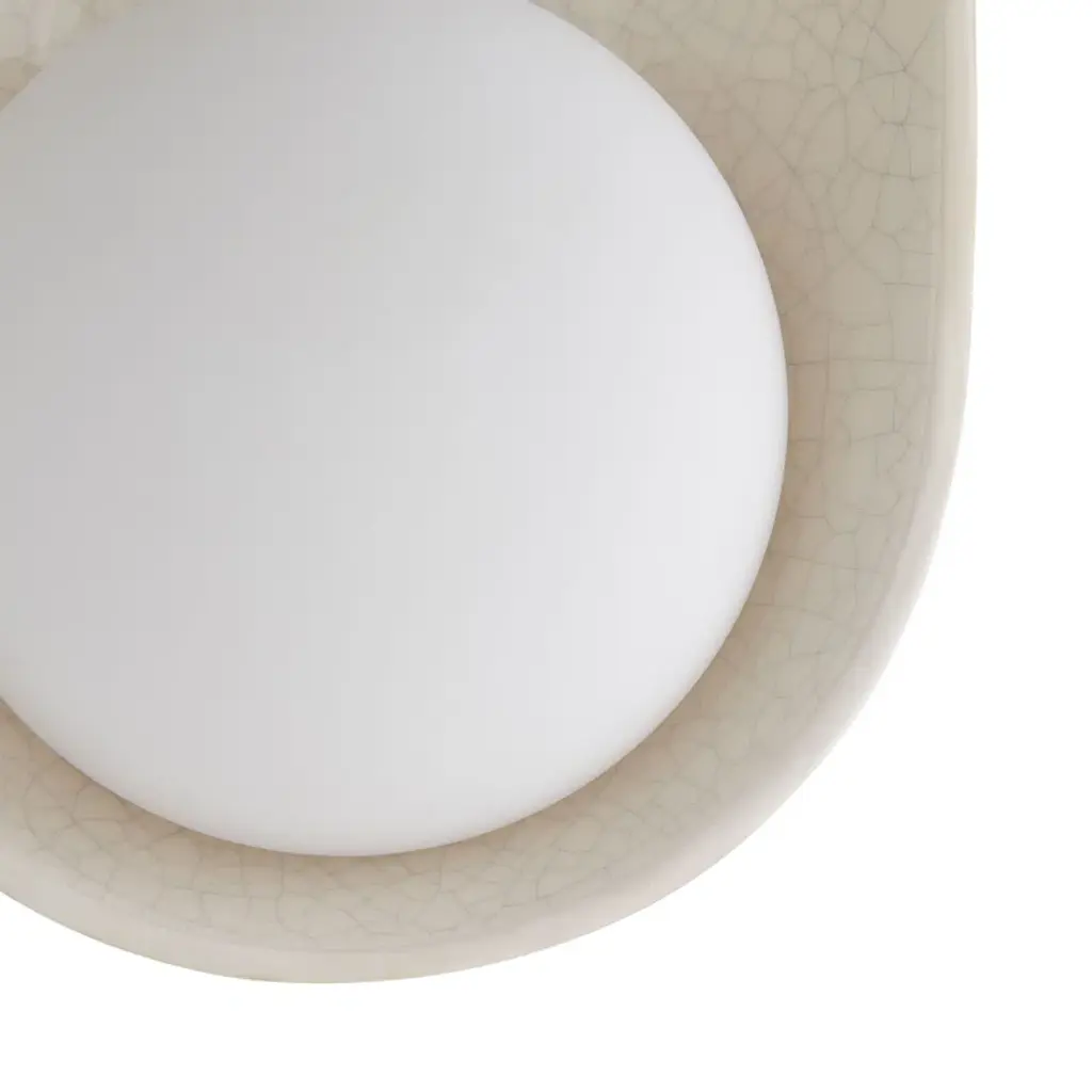 A stunning ivory-stained crackle glaze brings warmth and depth to this uniquely modern, minimalist design. The ceramic shade is complimented by double-frosted glass lights that cast a warm, flattering glow. Equally at home in bathrooms and corridors, at the bedside, and in hospitality settings, the Glaze Large Sconce is versatile and playful, offering endless possibilities when paired with additional glaze single and dome sconces for functional purposes and multi-piece light installations. The Glaze Large Sconce is ADA-compliant. Damp-rated, although limited covered outdoor areas may affect finish.