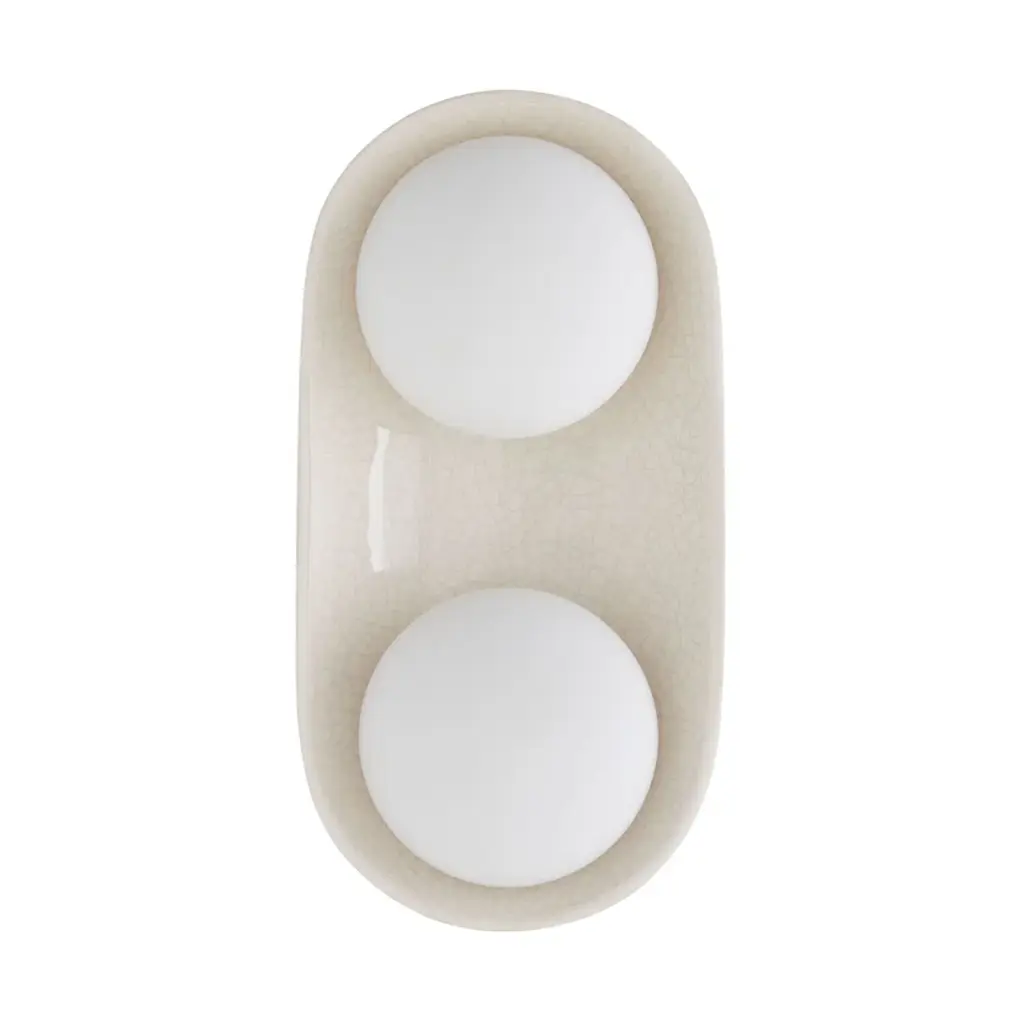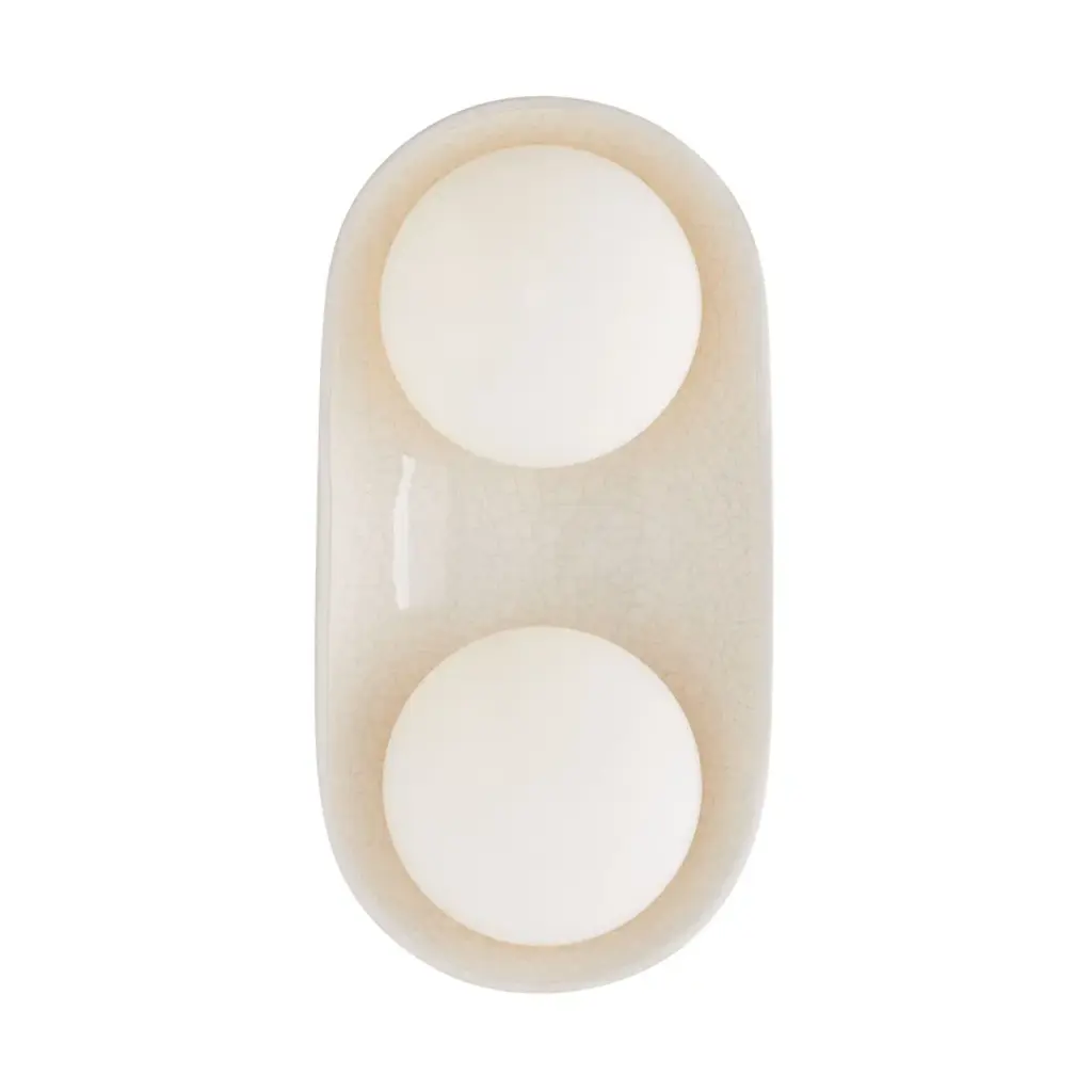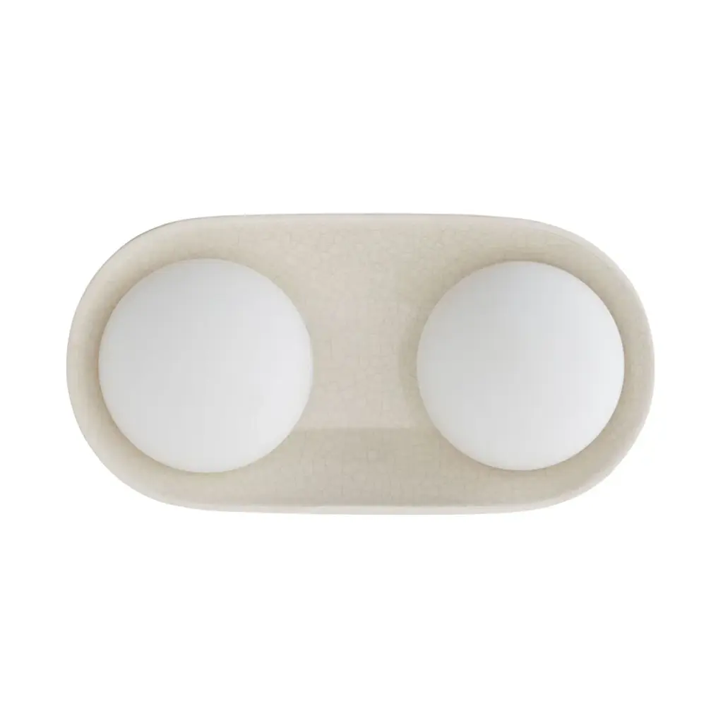 A stunning ivory-stained crackle glaze brings warmth and depth to this uniquely modern, minimalist design. The ceramic shade is complimented by double-frosted glass lights that cast a warm, flattering glow. Equally at home in bathrooms and corridors, at the bedside, and in hospitality settings, the Glaze Large Sconce is versatile and playful, offering endless possibilities when paired with additional glaze single and dome sconces for functional purposes and multi-piece light installations. The Glaze Large Sconce is ADA-compliant. Damp-rated, although limited covered outdoor areas may affect finish.