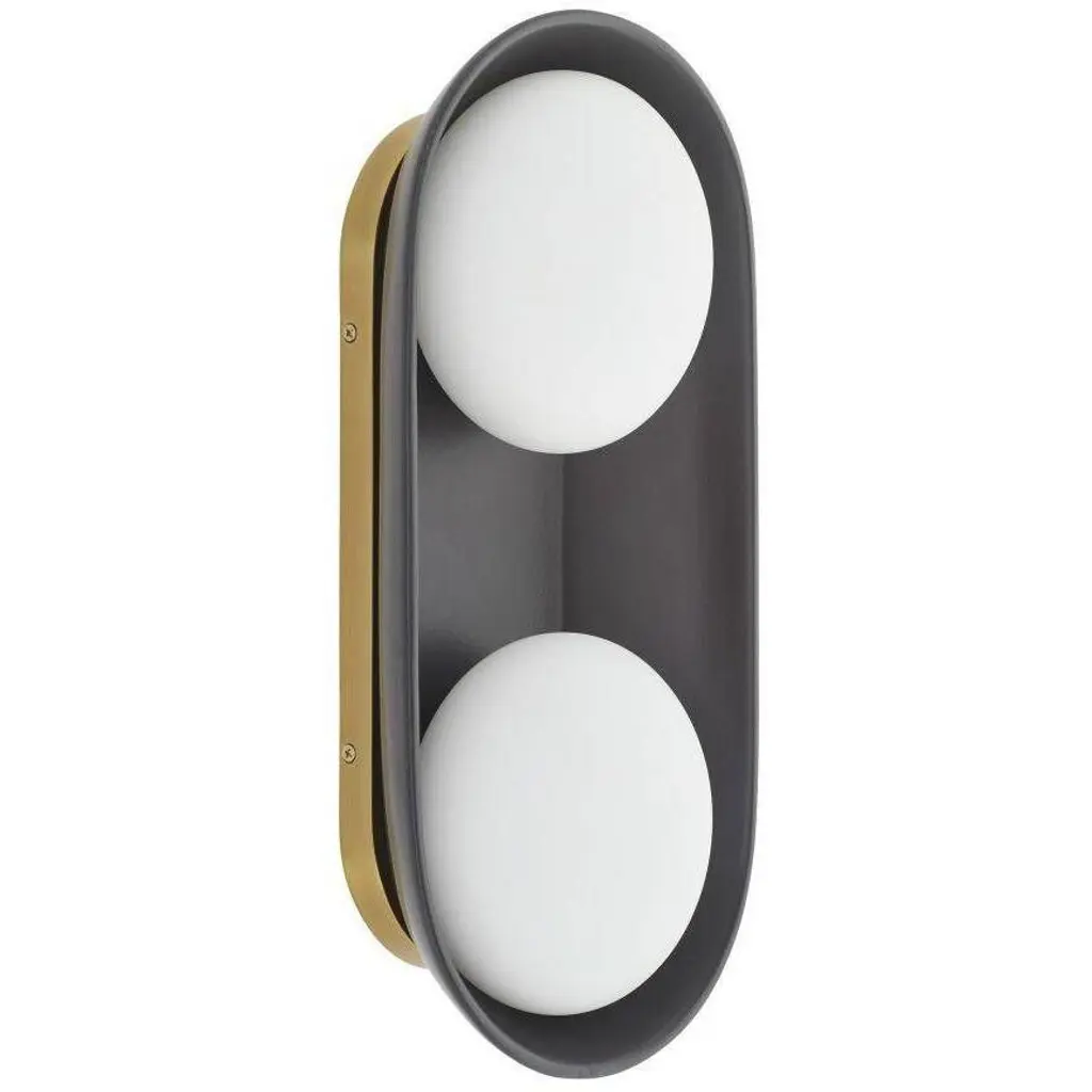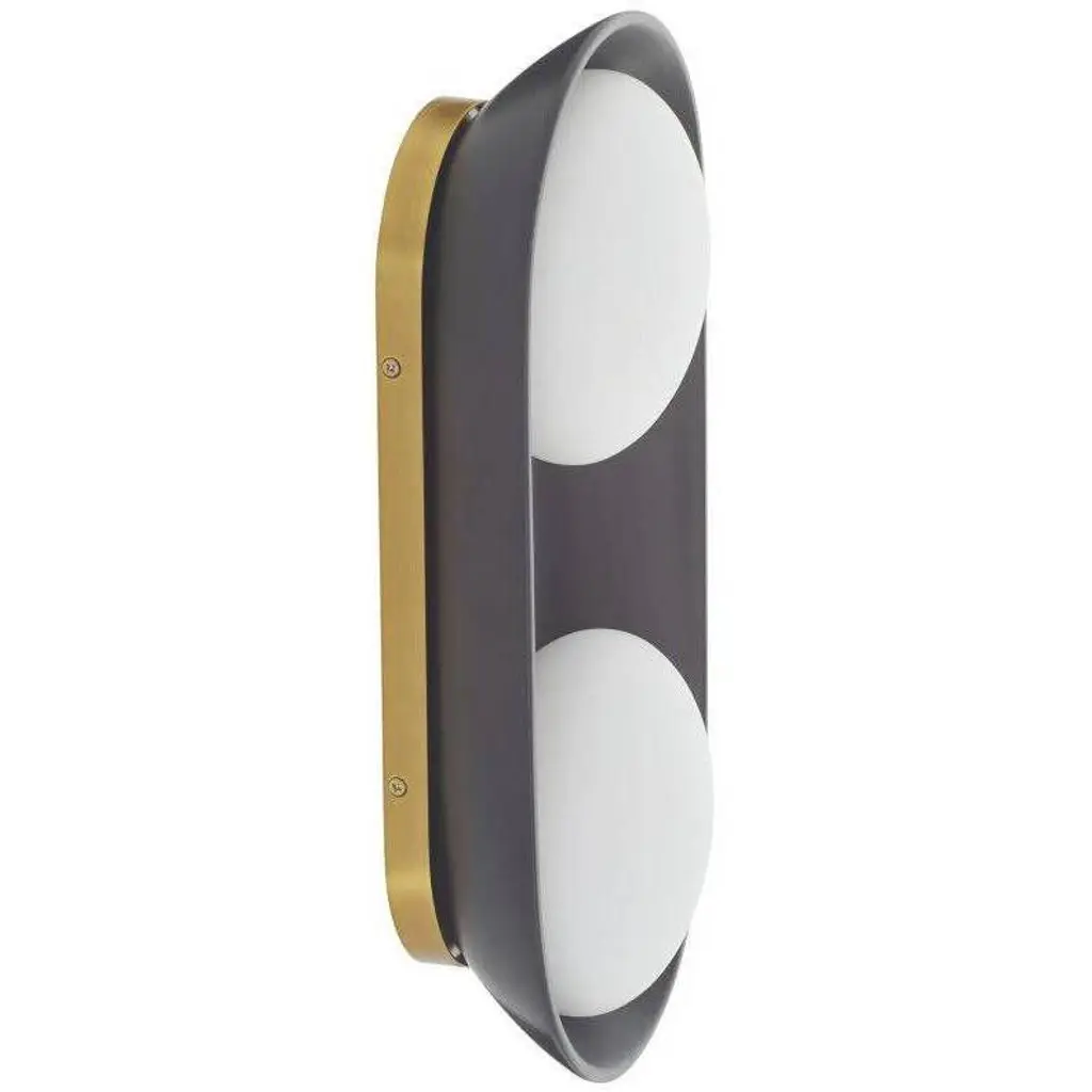 A stunning Matte Black brings warmth and depth to this uniquely modern, minimalist design that is held by Antique Brass-Plated steel. The ceramic shade is complimented by double Frosted glass lights that cast a warm, flattering glow. Equally at home in bathrooms and corridors, at the bedside and in hospitality settings, the Glaze large sconce is versatile and playful, offering endless possibilities when paired with additional Glaze sconces for functional purposes and multi-piece light installations. Damp-rated, although limited covered outdoor areas may affect finish.