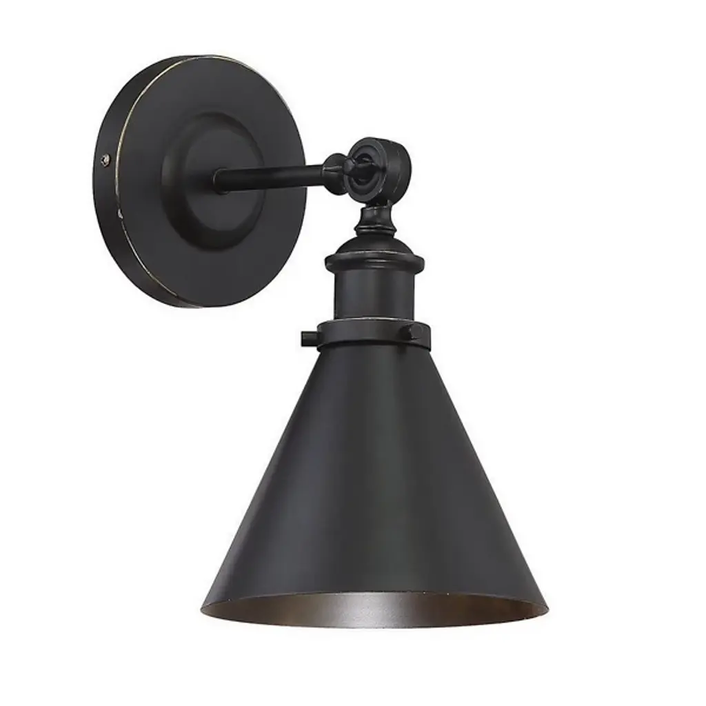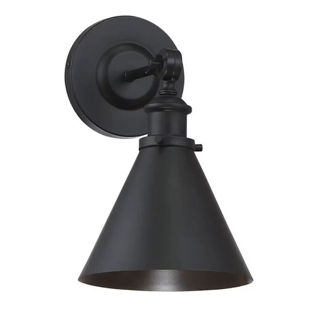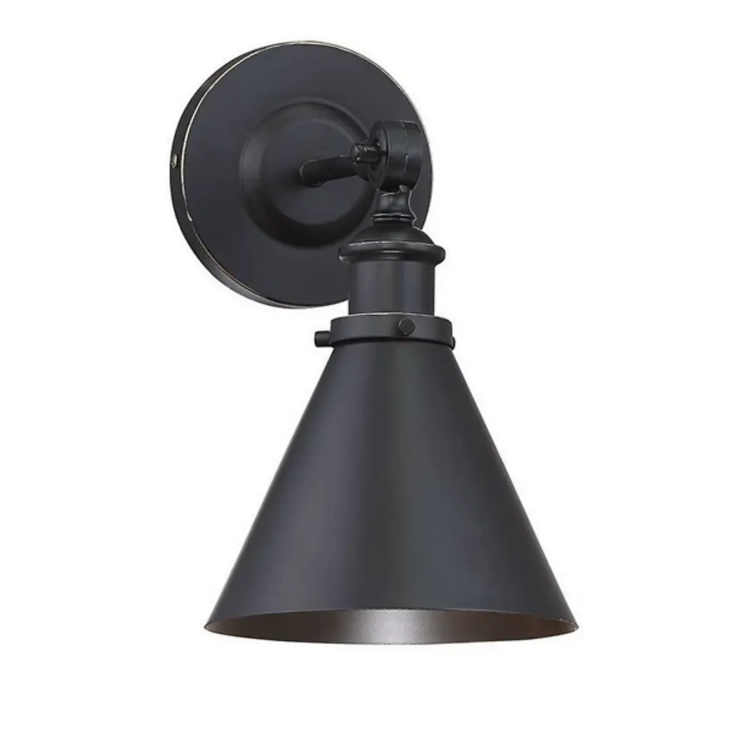 A truly transitional piece that takes the accented details of traditional lighting and blends them with the clean shape of contemporary design. The Glenn Wall Sconce from Savoy House is a handsome Metal construction accentuated by protruding details on the lamp holder and a wheel-shaped ornamental arm back. With halogen bulbs, a warm familiar glow fans out of the coned Metal shade. Oriented either up or down, the piece creates your choice of an evocative upplight or a sophisticated downlight.
