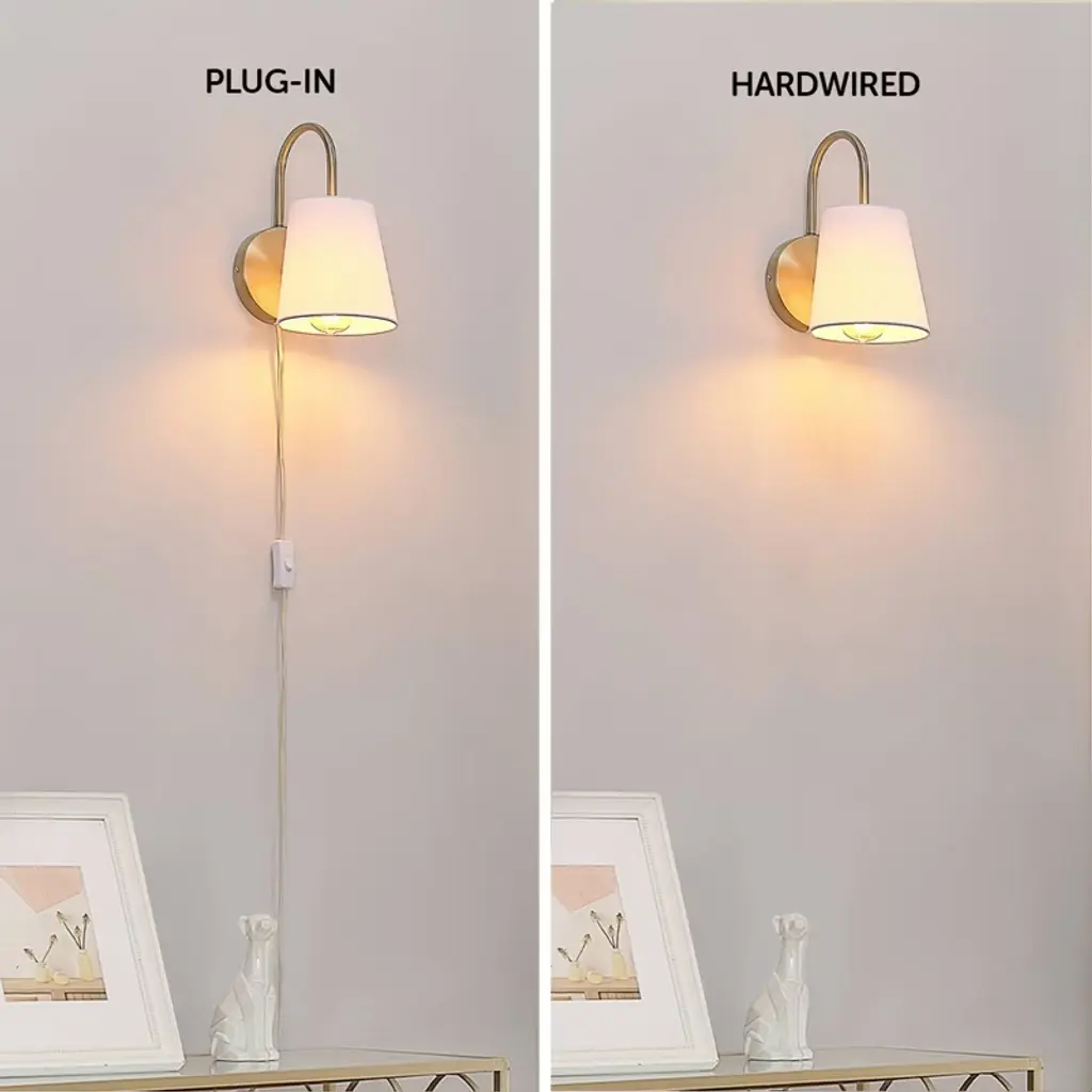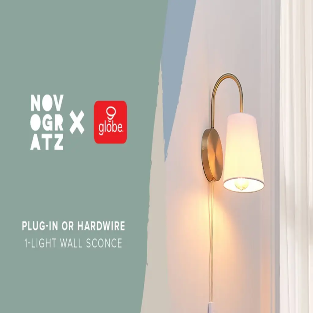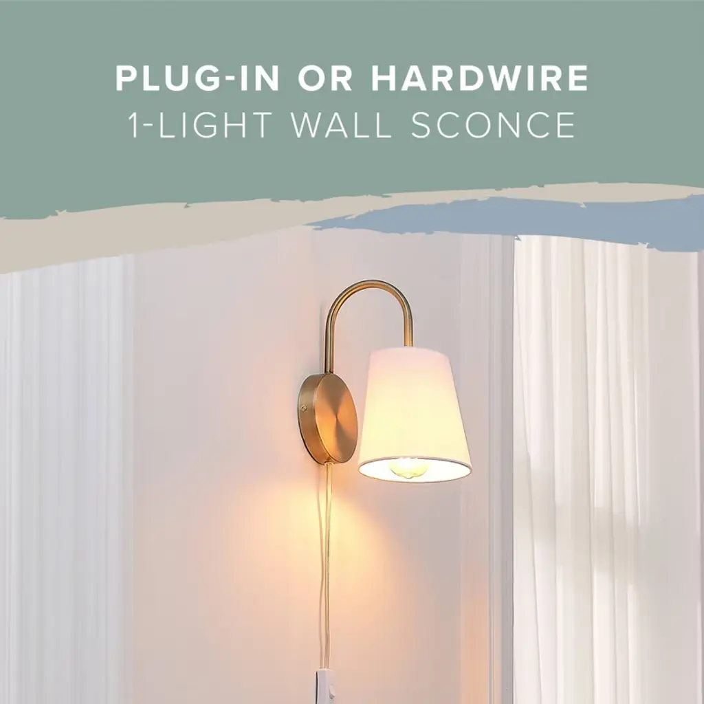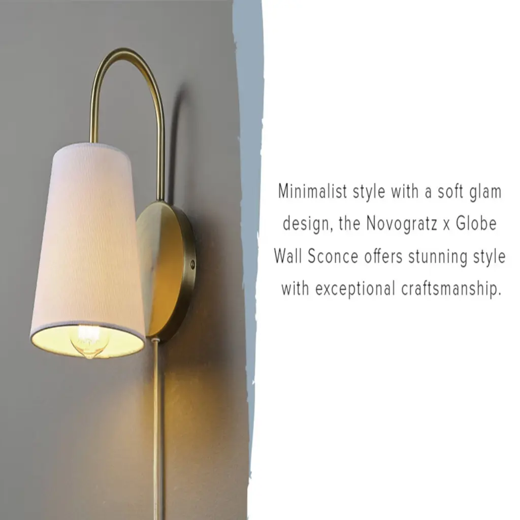 The Novogratz x Globe 1-Light Matte Brass Wall Sconce combines a minimalist soft glam design with versatility and functionality, creating an exquisite lighting solution for any room in your home. Featuring a matte brass palette that exudes elegance, this stunning light effortlessly pairs with its white textured fabric shade, adding a touch of glamour to your space while maintaining a minimalist aesthetic. It's the perfect balance of sophistication and simplicity. Experience the freedom of choice with the plug-in or hardwire capability of this 2-in-1 design. Install your light as a plug-in to easily place it anywhere in your home or opt for the hardwire option for a sleek cordless look. The choice is yours. Novogratz and Globe Electric - lighting made easy.