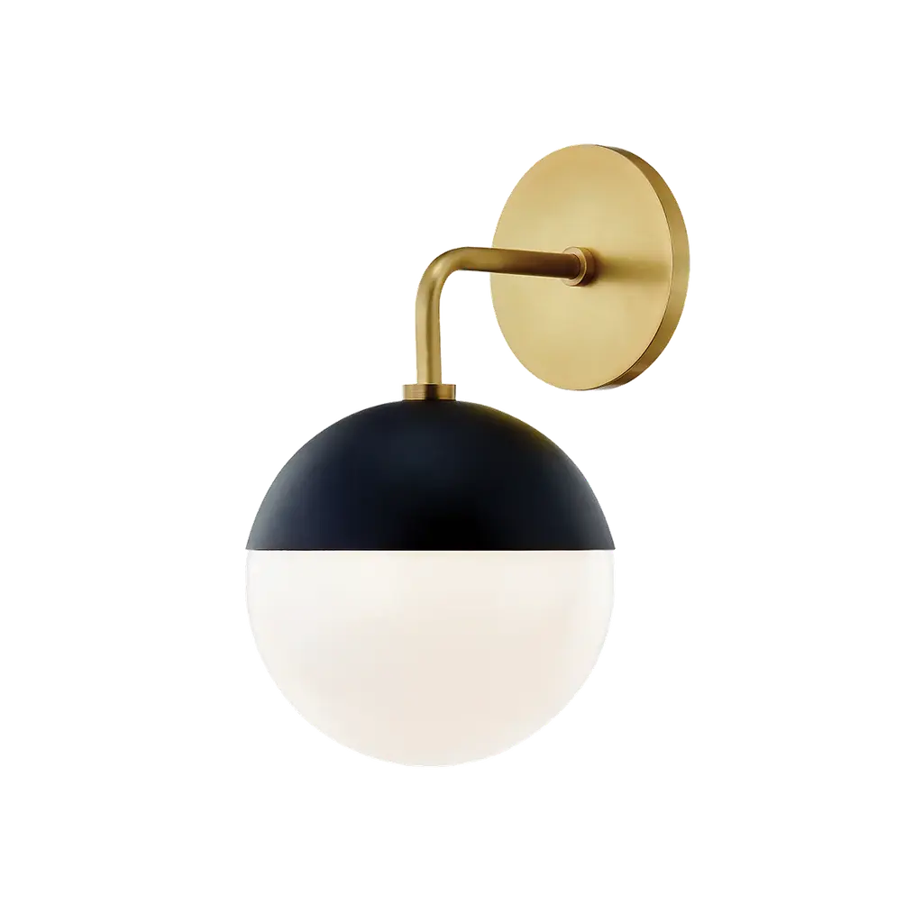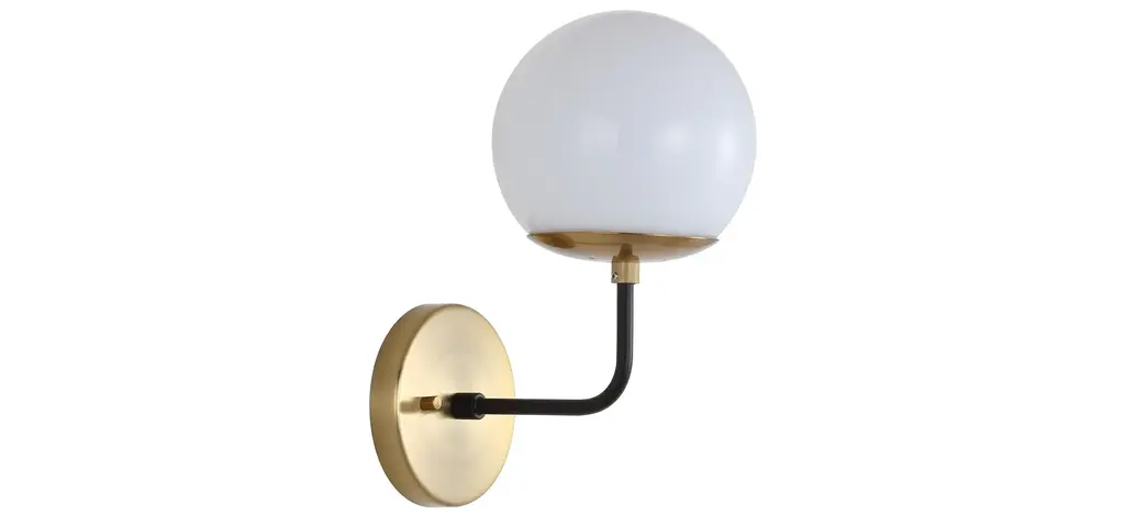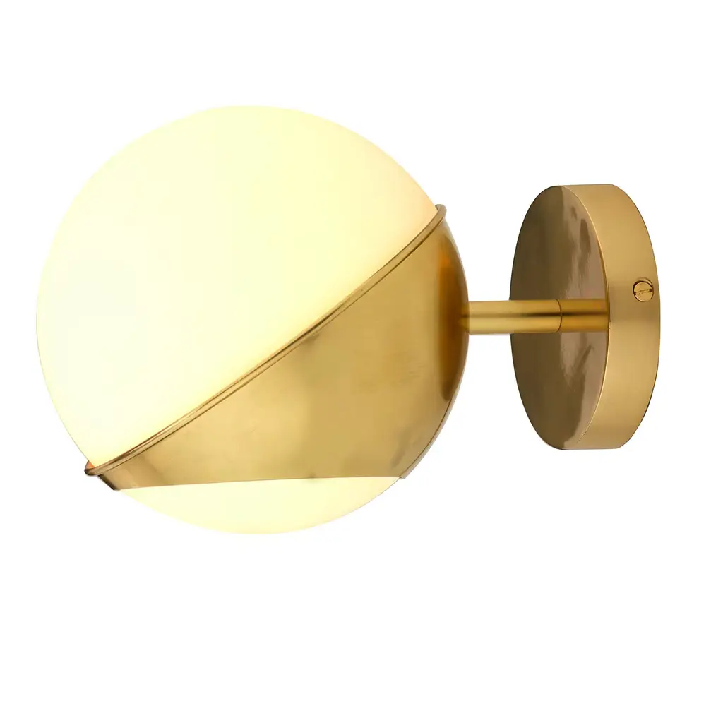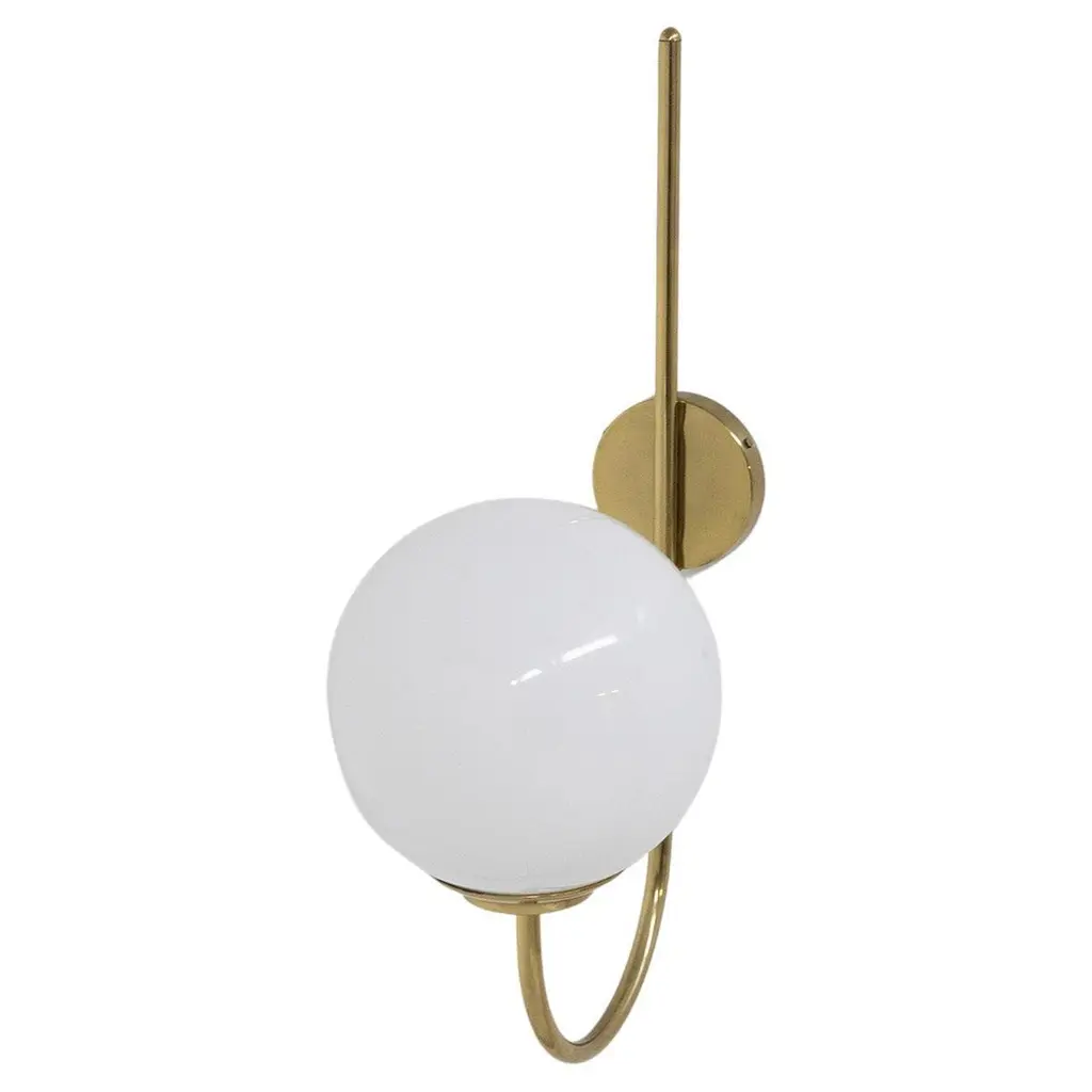 This exquisite sconce is a superb example of elegant craftsmanship. The pure geometric shapes of its silhouette create a sophisticated design that will equally suit a classic and a contemporary interior, either to flank a mirror, highlight a wall decor, or illuminate a corner. The round base of the piece in brass with a natural finish supports a spherical shade thanks to a triangular brass element that encloses it in a striking embrace.
