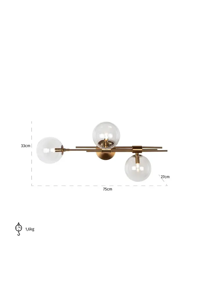 Three clear glass orbs interconnected by a golden iron rod, the Davine wall lamp by Richmond Interiors forms a strong and classy structure upon a room. It brightens up a space while also adding a modern touch to it.3 Lamp: LED 5W - G9