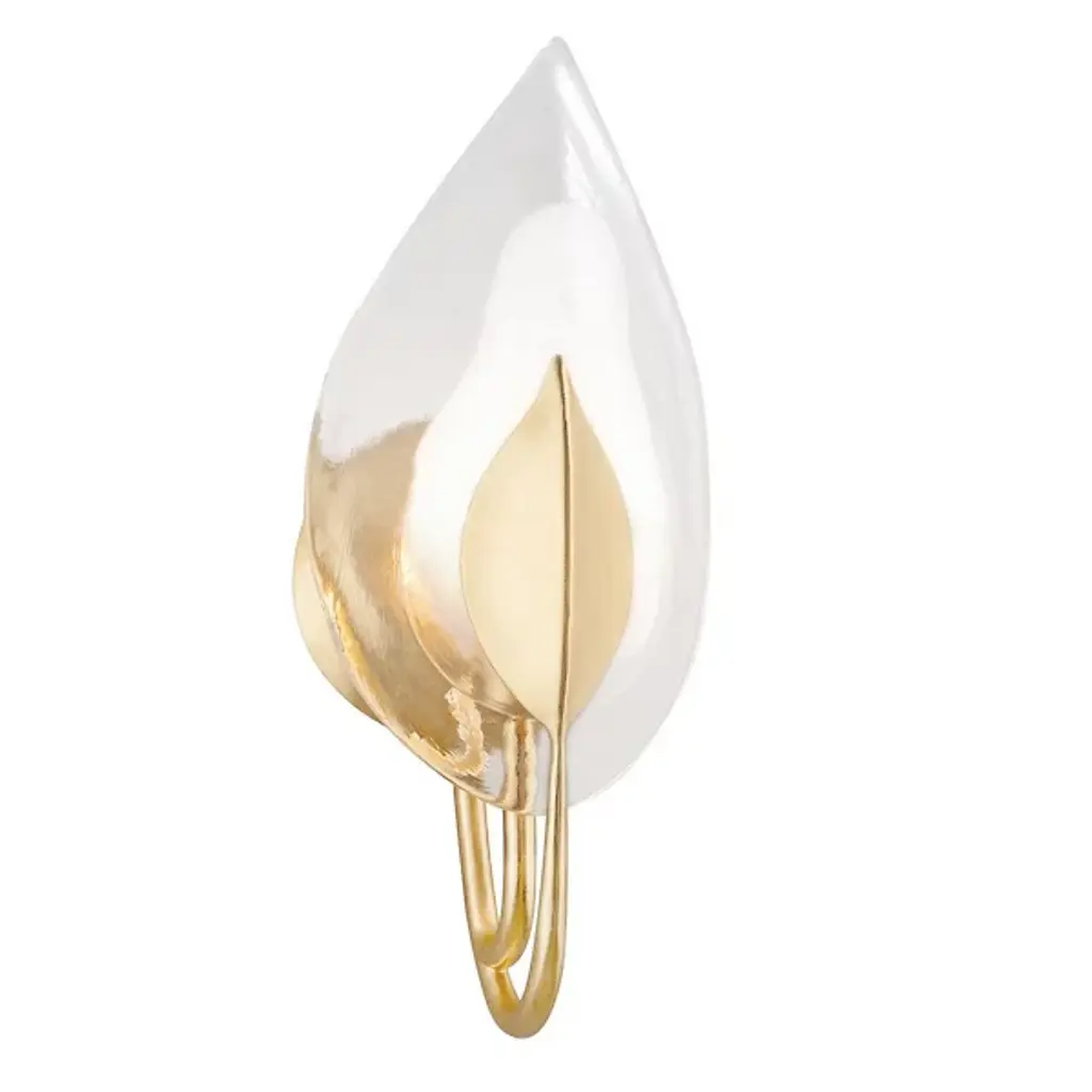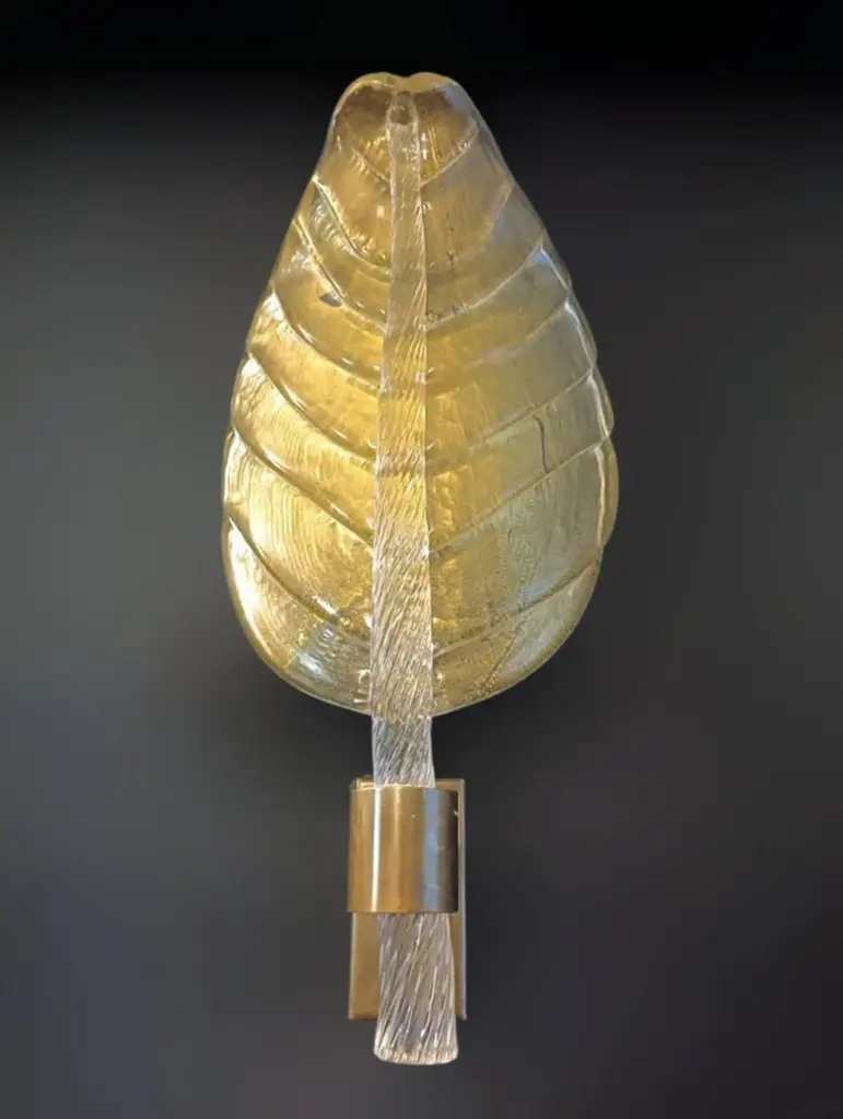 Original vintage Italian leaf shaped wall light with hand blown Murano glass infused with 24-karat gold flecks mounted on brass bracket / Designed by Barovier e Toso, circa 1960s with original Barovier e Toso maker's mark on the frame / Made in ItalyMeasures: Height 20 inches, width 9 inches, depth 6 inches 1 light / E12 or E14 type / max 40W30 available in stock in Italy, price listed is for each itemOrder reference #: FABIOLTD K48
